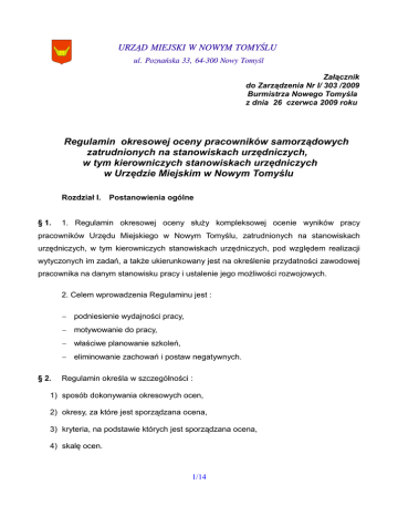URZĄD MIEJSKI W NOWYM TOMYŚLU ul. Poznańska 33, 64-300 Nowy Tomyśl Załącznik do Zarządzenia Nr I/ 303 /2009 Burmistrza Nowego Tomyśla z dnia 26 czerwca 2009 roku Regulamin okresowej oceny pracowników samorządowych zatrudnionych na stanowiskach urzędniczych, w tym kierowniczych stanowiskach urzędniczych w Urzędzie Miejskim w Nowym Tomyślu Rozdział I. § 1. Postanowienia ogólne 1. Regulamin okresowej oceny służy kompleksowej ocenie wyników pracy pracowników Urzędu Miejskiego w Nowym Tomyślu, zatrudnionych na stanowiskach urzędniczych, w tym kierowniczych stanowiskach urzędniczych, pod względem realizacji wytyczonych im zadań, a także ukierunkowany jest na określenie przydatności zawodowej pracownika na danym stanowisku pracy i ustalenie jego możliwości rozwojowych. 2. Celem wprowadzenia Regulaminu jest : − podniesienie wydajności pracy, − motywowanie do pracy, − właściwe planowanie szkoleń, − eliminowanie zachowań i postaw negatywnych. § 2. Regulamin określa w szczególności : 1) sposób dokonywania okresowych ocen, 2) okresy, za które jest sporządzana ocena, 3) kryteria, na podstawie których jest sporządzana ocena, 4) skalę ocen. 1/14 URZĄD MIEJSKI W NOWYM TOMYŚLU ul. Poznańska 33, 64-300 Nowy Tomyśl § 3. Ilekroć w Regulaminie jest mowa o : - Burmistrzu – rozumie się przez to Burmistrza Nowego Tomyśla, - Urzędzie – rozumie się przez to Urząd Miejski w Nowym Tomyślu, - Okresowej ocenie – rozumie się przez to okresową ocenę, jakiej podlegają pracownicy samorządowi na podstawie art. 27 ustawy z dnia 21 listopada 2008 roku o pracownikach samorządowych (Dz.U. Nr 223, poz. 1458), - Bezpośrednim przełożonym – rozumie się przez to właściwą osobę określoną w Regulaminie Organizacyjnym Urzędu Miejskiego w Nowym Tomyślu lub w zakresie czynności pracownika, - Oceniającym – rozumie się przez to bezpośredniego przełożonego uprawnionego do dokonania oceny, - Ocenianym – rozumie się przez to pracownika zatrudnionego w Urzędzie Miejskim w Nowym Tomyślu na stanowisku urzędniczym, w tym kierowniczym stanowisku urzędniczym, podlegającego ocenie, - Ustawie – rozumie się przez to ustawę z dnia 21 listopada 2008 roku o pracownikach samorządowych (Dz.U. Nr 223, poz. 1458), - Regulaminie – rozumie się przez to Regulamin okresowej oceny pracowników samorządowych zatrudnionych na stanowiskach urzędniczych, w tym kierowniczych stanowiskach urzędniczych w Urzędzie Miejskim w Nowym Tomyślu. § 4. 1. Okresowej ocenie podlegają pracownicy samorządowi zatrudnieni w Urzędzie Miejskim w Nowym Tomyślu na stanowiskach urzędniczych i kierowniczych stanowiskach urzędniczych, które określa Załącznik Nr 3 do Regulaminu wynagradzania pracowników Urzędu Miejskiego w Nowym Tomyślu , stanowiący załącznik do Zarządzenia Nr I/ 295 / 2009 Burmistrza Nowego Tomyśla z dnia 16 czerwca 2009 roku w sprawie wprowadzenia Regulaminu wynagradzania pracowników Urzędu Miejskiego w Nowym Tomyślu. 2. Okresowej ocenie nie podlegają pracownicy w okresie wypowiedzenia. 2/14 URZĄD MIEJSKI W NOWYM TOMYŚLU ul. Poznańska 33, 64-300 Nowy Tomyśl 3. Okresowej oceny nie przeprowadza się w stosunku do pracowników zatrudnionych w Urzędzie na stanowiskach urzędniczych, w tym kierowniczych stanowiskach urzędniczych krócej niż 6 miesięcy. Rozdział II. Sposób dokonywania okresowych ocen § 5. 1. Okresowej oceny dokonuje bezpośredni przełożony ocenianego. 2. W razie zmiany na stanowisku bezpośredniego przełożonego w trakcie okresu, w którym oceniany podlega ocenie, okresowa ocena jest sporządzana na podstawie wybranych wcześniej kryteriów okresowej oceny. 3. W przypadku nieobecności oceniającego, obejmującej w całości okres dokonywania okresowej oceny oraz w przypadku długiej nieobecności oceniającego przekraczającej 6 miesięcy, w okresie, za który dokonywana jest okresowa ocena, okresowej oceny pracownika dokonuje przełożony wyższego stopnia w stosunku do oceniającego lub osoba upoważniona do dokonania tej oceny przez Burmistrza. Fakt ten należy odnotować w arkuszu okresowej oceny ocenianego, w punkcie dotyczącym informacji o zmianie osoby dokonującej okresowej oceny. 4. Okresowej oceny dokonuje się na piśmie, w : 1) Arkuszu okresowej oceny pracownika samorządowego zatrudnionego w Urzędzie Miejskim w Nowym Tomyślu na stanowisku urzędniczym, stanowiącym Załącznik Nr 1 do niniejszego Regulaminu, 2) Arkuszu okresowej oceny pracownika samorządowego zatrudnionego w Urzędzie Miejskim w Nowym Tomyślu na kierowniczym stanowisku urzędniczym, stanowiącym Załącznik Nr 2 do niniejszego Regulaminu. 3/14 URZĄD MIEJSKI W NOWYM TOMYŚLU ul. Poznańska 33, 64-300 Nowy Tomyśl § 6. Ustala się następujące etapy dokonywania okresowej oceny : 1) rozmowa z ocenianym przed wyborem kryteriów, 2) wybór kryteriów, 3) wyznaczenie terminu dokonania okresowej oceny, 4) wpis do arkusza okresowej oceny, 5) rozmowa oceniająca, 6) sporządzenie okresowej oceny na piśmie i jej doręczenie. Rozmowa z ocenianym przed wyborem kryteriów § 7. 1. Przed wyborem kryteriów, oceniający jest obowiązany przeprowadzić rozmowę z ocenianym. 2. Rozmowę, o której mowa w ust. 1 oceniający winien odbyć w terminie nie późniejszym niż 3 dni przed wyborem kryteriów. 3. Celem rozmowy z ocenianym jest dokonanie wyboru przez oceniającego kryteriów będących podstawą dokonania okresowej oceny. 4. Przedmiotem rozmowy jest omówienie z ocenianym sposobu realizacji obowiązków wynikających z zakresu czynności na zajmowanym przez niego stanowisku pracy. 5. W trakcie rozmowy, oceniający winien posługiwać się zakresem czynności ocenianego. 6. Przy omawianiu sposobu realizacji obowiązków ocenianego, oceniający analizuje czy są one wykonywane m.in. zgodnie z następującymi obowiązkami pracownika 4/14 URZĄD MIEJSKI W NOWYM TOMYŚLU ul. Poznańska 33, 64-300 Nowy Tomyśl samorządowego, okre