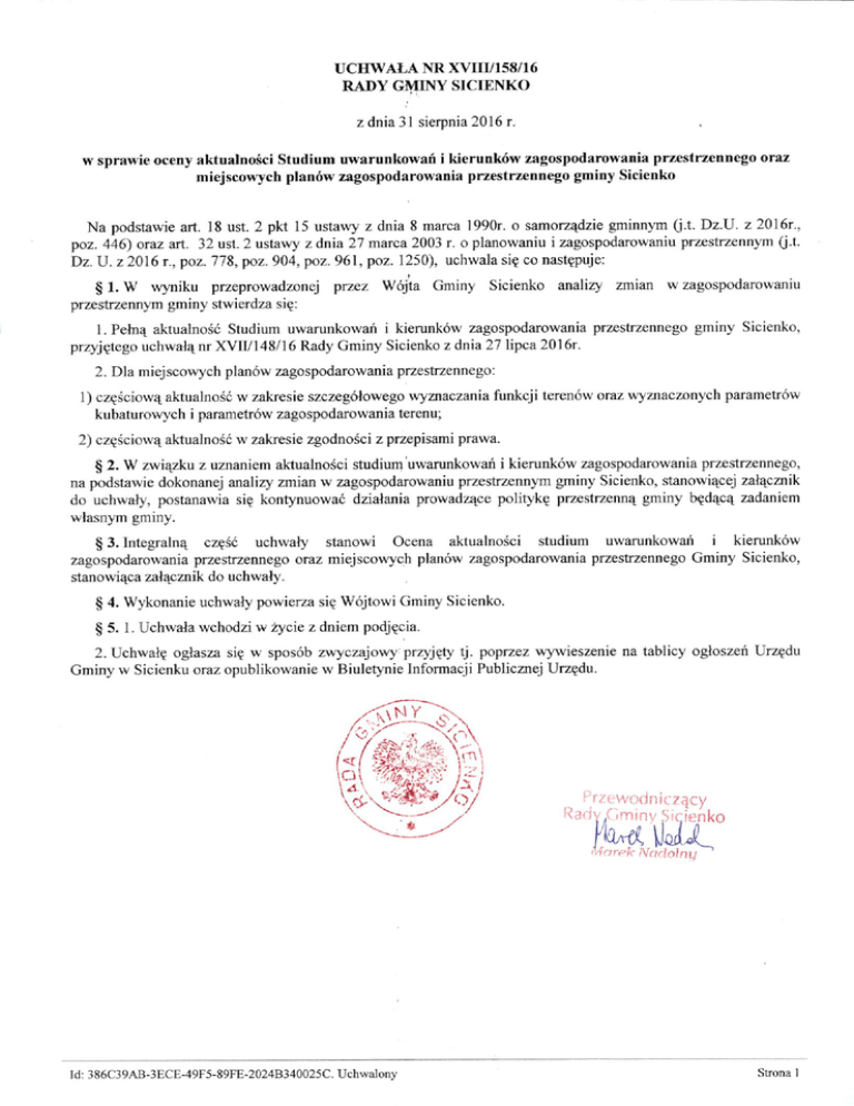 Uchwała XVIII/158/16 - Urząd Gminy w Sicienku