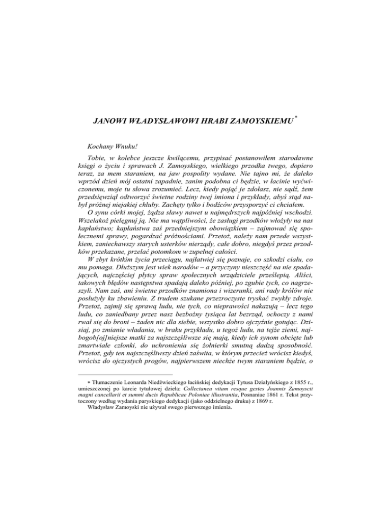 JANOWI WŁADYSŁAWOWI HRABI ZAMOYSKIEMU ∗ Kochany Wnuku! Tobie, w kolebce jeszcze kwilącemu, przypisać postanowiłem starodawne księgi o Ŝyciu i sprawach J. Zamoyskiego, wielkiego przodka twego, dopiero teraz, za mem staraniem, na jaw pospolity wydane. Nie tajno mi, Ŝe daleko wprzód dzień mój ostatni zapadnie, zanim podobna ci będzie, w łacinie wyćwiczonemu, moje tu słowa zrozumieć. Lecz, kiedy pojąć je zdołasz, nie sądź, Ŝem przedsięwziął odtworzyć świetne rodziny twej imiona i przykłady, abyś stąd nabył próŜnej niejakiej chluby. Zachęty tylko i bodźców przysporzyć ci chciałem. O synu córki mojej, Ŝądza sławy nawet u najmędrszych najpóźniej wschodzi. WszelakoŜ pielęgnuj ją. Nie ma wątpliwości, Ŝe zasługi przodków włoŜyły na nas kapłaństwo; kapłaństwa zaś przedniejszym obowiązkiem – zajmować się społecznemi sprawy, pogardzać próŜnościami. PrzetoŜ, naleŜy nam przede wszystkiem, zaniechawszy starych usterków nierządy, całe dobro, niegdyś przez przodków przekazane, przelać potomkom w zupełnej całości. W zbyt krótkim Ŝycia przeciągu, najłatwiej się poznaje, co szkodzi ciału, co mu pomaga. DłuŜszym jest wiek narodów – a przyczyny nieszczęść na nie spadających, najczęściej płytcy spraw społecznych urządziciele prześlepią. Aliści, takowych błędów następstwa spadają daleko później, po zgubie tych, co nagrzeszyli. Nam zaś, ani świetne przodków znamiona i wizerunki, ani rady królów nie posłuŜyły ku zbawieniu. Z trudem szukane przezroczyste tryskać zwykły zdroje. PrzetoŜ, zajmij się sprawą ludu, nie tych, co nieprawości nakazują – lecz tego ludu, co zaniedbany przez nasz bezboŜny tysiąca lat bezrząd, ochoczy z nami rwał się do broni – Ŝaden nic dla siebie, wszystko dobro ojczyźnie gotując. Dzisiaj, po zmianie władania, w braku przykładu, u tegoŜ ludu, na tejŜe ziemi, najbogob[oj]niejsze matki za najszczęśliwsze się mają, kiedy ich synom obcięte lub zmartwiałe członki, do uchronienia się Ŝołnierki smutną dadzą sposobność. PrzetoŜ, gdy ten najszczęśliwszy dzień zaświta, w którym przecieŜ wrócisz kiedyś, wrócisz do ojczystych progów, najpierwszem niechŜe twym staraniem będzie, o ∗ Tłumaczenie Leonarda Niedźwieckiego łacińskiej dedykacji Tytusa Działyńskiego z 1855 r., umieszczonej po karcie tytułowej dzieła: Collectanea vitam resque gestes Joannis Zamoyscii magni cancellarii et summi ducis Republicae Poloniae illustrantia, Posnaniae 1861 r. Tekst przytoczony według wydania paryskiego dedykacji (jako oddzielnego druku) z 1869 r. Władysław Zamoyski nie uŜywał swego pierwszego imienia. 8 ile sił ci starczy, dać dowody najwdzięczniejszego przywiązania do ludu; kmieci zaś takiemi uposaŜ swobodami, aŜeby ani wróg nawet dzieła dobrodziejstw naszych wydrzeć nam nigdy nie zdołał. Najmilszy wnuku, ród ojcowski i macierzyński świetnym ci się przedstawia obywatelską i wojowniczą dzielnością, szczególniej zaś niezachwianą wiernością ku rzeczypospolitej okazały. Błogiem teŜ dla ciebie godłem [są] ci znamienici męŜe, którzy raczyli cię trzymać u świętego chrztu źródła: najczcigodniejszy pradziad twój, A. ksiąŜę Czartoryski i niedawno zgasły ów wielkomyślny mąŜ, lord Dudley Stuart oraz potęŜny wymową hrabia Montalembert. Przede wszystkim jednak, niech ci przyświeca dawnego Jana Zamoyskiego umysł, prawością przejęty. Twierdził on (patrz w naszym Heidensteinie, str. 102), Ŝe z ojczyzną obejmującą wszystkie wszystkich lubości, wolną i kwitnącą, wszystko zbawione, ocalone i radości pełne. Idąc tedy za tą najzbawienniejszą radą, nie poszukiwaj skąd nasi – ci lub owi – powstali, skąd przyszli, ani jaką mową Boga wielbią lub w jaki sposób poŜytkom rzeczypospolitej starają się usłuŜyć. Tysiąc albowiem jest środków i tysiąc sposobów – niechŜe tedy kaŜdy, do tego lub owego z zacną myślą się biorący, będzie ci współwojakiem, pokrewnym i bratem. Najmilszy wnuku, błagam nieśmiertelnego Boga, aŜeby czasy twoje nie były chmurne. Wszak-ci, dopełniającym poboŜnie obowiązków zawsze, jako mówi wieszcz, bezchmurne uśmiecha się niebo. Nateraz, wdzięcznym niech będzie tobie i twoim ten nasz podarek; za łaską boŜą moŜe przygotujemy więcej. T. comes Działyński, Kórnik calendis martiis, A. D. 1855 Na pamiątkę w ParyŜu 18 listopada 1869 w rocznicę urodzin Leonardus Ursinus [Niedźwiecki]