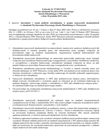 Uchwała Nr 37/2012/2013 Senatu Akademii Wychowania Fizycznego Józefa Piłsudskiego w Warszawie z dnia 18 grudnia 2012 roku w sprawie: kierunków i zasad polityki zatrudniania w grupie nauczycieli akademickich w Akademii Wychowania Fizycznego Józefa Piłsudskiego w Warszawie Działając na podstawie art. 62 ust. 1 Ustawy z dnia 27 lipca 2005 roku- Prawo o szkolnictwie wyższym (Dz. U. z 2005 r. nr 164 poz. 1365 ze zm.) oraz § 41 ust. 1 pkt 1 i ust. 2 pkt 19 Statutu AWF Warszawa oraz uwzględniając strategię Akademii do roku 2020, po rozpoznaniu na posiedzeniu w dniu 18 grudnia 2012 r. wniosku Rektora AWF Warszawa, Senat AWF Warszawa uchwala następujące kierunki polityki zatrudnienia w grupie pracowników będących nauczycielami akademickimi: §1 1. Zatrudnienie nauczycieli akademickich na stanowiskach: naukowych, naukowo-dydaktycznych lub dydaktycznych w ramach stosunku pracy lub mianowania może nastąpić wyłącznie do prowadzenia zajęć na studiach stacjonarnych, stacjonarnych studiach doktoranckich lub prowadzenia badań naukowych. 2. Zatrudnienie nauczyciela akademickiego na stanowisku pracownika naukowego może nastąpić wyłącznie pod warunkiem finansowania jego wynagrodzenia z przychodów działalności naukowej, w szczególności z projektu badawczego. Zatrudnienie następuje wyłącznie na okres, na jaki projekt badawczy przewiduje finansowanie jego wynagrodzenia wraz z pochodnymi. 3. Warunkiem zatrudnienia nauczyciela akademickiego w Uczelni w ramach stosunku pracy jest złożenie deklaracji, że AWF Warszawa, zwana dalej AWF, jest podstawowym miejscem pracy oraz złożenie oświadczeń o zaliczeniu jego dorobku naukowego do dorobku jednostki organizacyjnej, w której ma być zatrudniony. 4. Nauczyciel akademicki zatrudniony w AWF jako podstawowym miejscu pracy, obowiązkowo składa coroczne oświadczenie o wyrażeniu zgody na zaliczenie go do minimum kadrowego na studiach drugiego i pierwszego stopnia, a zatrudniony w AWF jako dodatkowym miejscu pracy do minimum kadrowego na studiach pierwszego stopnia. 5. Nie przewiduje się zwiększenia zatrudnienia nauczycieli akademickich w AWF, jako dodatkowym miejscu pracy, od 01.03.2013 r. §2 1. Zatrudnienie nauczycieli akademickich do realizacji zajęć na studiach niestacjonarnych i podyplomowych od dnia 1 października 2013 roku może nastąpić wyłącznie na podstawie umów cywilnoprawnych finansowanych z przychodów z tych studiów. 2. Zatrudnienie nauczycieli akademickich na podstawie umowy o pracę lub mianowania następuje w trybie konkursu, z zastrzeżeniem art. 118a ust. 3 Ustawy – Prawo o szkolnictwie wyższym. Zgodę na otworzenie konkursu podejmuje Rektor na wniosek dziekanów albo innych jednostek ogólnouczelnianych, w których nauczyciel akademicki ma być zatrudniony. 3. Podstawą ogłoszenia konkursu jest wysokość obciążeń dydaktycznych przekraczająca sumaryczną wysokość obciążeń zakładu (pracowni) na studiach stacjonarnych o 30% planowanego pensum dla zakładu (pracowni) lub wynika z potrzeby utrzymania/uruchomienia kierunku czy stopnia studiów, bądź jest konieczne do uzyskania/zachowania uprawnień do prowadzenia postępowań o nadanie stopni naukowych lub tytułu naukowego. 4. Struktura zatrudnienia nauczycieli akademickich w poszczególnych jednostkach organizacyjnych wydziałów lub jednostek międzywydziałowych powinna uwzględniać rodzaj, stopień, kierunek oraz profil studiów. 5. Kierownicy jednostek organizacyjnych do końca roku akademickiego 2012/2013 dostosują strukturę zatrudnienia w zakładach, katedrach i wydziałach, stosownie do rodzajów i kierunków studiów oraz profilu kształcenia. 6. Senat AWF Warszawa zaleca, aby w jednostkach organizacyjnych wydziałów (katedr) realizujących wyłącznie praktyczny profil kształcenia, stosunek nauczycieli zatrudnionych na stanowiskach naukowo-dydaktycznych do dydaktycznych wynosił 50% - 50%, a realizujących wyłącznie profil ogólnoakademicki, odpowiednio 70% - 30%. Wynik ułamkowy zaokrągla się w górę. §3 1. Nauczyciele akademiccy zatrudnieni na stanowiskach naukowo-dydaktycznych i naukowych: asystentów, adiunktów, profesorów nadzwyczajnych, podlegają obowiązkowej okresowej ocenie, co dwa lata, a profesorowie zwyczajni, zatrudnieni na podstawie mianowania, co cztery lata, na podstawie osiągnięć przedstawionych w karcie oceny nauczyciela akademickiego. Warunkiem koniecznym uzyskania oceny pozytywnej przez nauczyciela akademickiego zatrudnionego na stanowisku naukowo-dydaktycznym lub naukowym jest pozytywna ocena jego działalności naukowej dokonana przez Wydziałową Komisję ds. Oceny Nauczycieli Akademickich. 2. Podstawą oceny nauczycieli akademickich dydaktycznych i naukowych powinny być: 3. 4. zatrudnionych na stanowiskach naukowo- - prowadzone badania naukowe, szczególnie finansowane ze środków NCN, MNiSW, i NCBiR, - publikacje naukowe w recenzowanych czasopismach naukowych, przy czym każdy pracownik powinien opublikować przynajmniej jedną pracę w czasopiśmie posiadającym min. 8 punktów MNiSW, - terminowa realizacja zatwierdzonego przez dziekana, indywidualnego planu naukowego, - kształcenie młodej kadry naukowej, promocja przynajmniej 1 doktora raz na 4 lata, w przypadku stanowiska profesora. Nauczyciele akademiccy zatrudnieni na stanowiskach dydaktycznych podlegają obowiązkowej ocenie, co dwa lata. Podstawą oceny nauczycieli akademickich zatrudnionych na stanowiskach dydaktycznych powinny być: - opracowane i wdrożone programy studiów, kursów, studiów podyplomowych, specjalizacji, w tym komercyjnych, - opracowania skryptowe i metodyczne lub publikacje naukowe, jeżeli pracownik prowadzi taką działalność, - osiągnięcia w szkoleniu sportowym na poziomie międzynarodowym, - zdobyte uprawnienia zawodowe. 5. Senat zobowiązuje dziekanów do dokonywania oceny nauczycieli akademickich w terminie do dnia 30 kwietnia i przedstawienia informacji w tym zakresie Rektorowi do dnia 30 