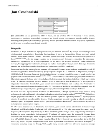 Jan Czochralski 1 Jan Czochralski Jan Czochralski Data i miejsce urodzenia 23 października 1885 Kcynia Data i miejsce śmierci 22 kwietnia 1953 Poznań Zawód chemik, metaloznawca Jan Czochralski (ur. 23 października 1885 w Kcyni, zm. 22 kwietnia 1953 w Poznaniu) – polski chemik, metaloznawca, wynalazca powszechnie stosowanej do dzisiaj metody otrzymywania monokryształów krzemu, nazwanej później metodą Czochralskiego, podstawy procesu produkcji mikroprocesorów. Najczęściej wymieniany polski uczony we współczesnym świecie techniki. Biografia Urodził się w Kcyni na Pałukach, będących wówczas pod zaborem pruskim[]. Był ósmym z dziesięciorga dzieci wielkopolskich rzemieślników, Franciszka Czochralskiego i Marty z Suchomskich. Ojciec prowadził zakład stolarski, robiąc meble domowe i trumny. Czochralski zgodnie z wolą ojca ukończył Seminarium Nauczycielskie w Kcyni[potrzebne źródło], ale nie mogąc pogodzić się z ocenami, podarł świadectwo maturalne. Po otrzymaniu świadectwa, „upewniwszy się u swojego profesora, że nie podlega już rygorom szkolnym”, podarł świadectwo mówiąc „Proszę przyjąć do wiadomości, że nigdy nie wydano bardziej krzywdzących ocen”. Brak tego dokumentu zamykał mu, w określonym czasie, drogę do dalszej kariery nauczycielskiej i naukowej. Interesował się chemią, rozpoczął pracę w aptece, gdzie prowadził eksperymenty naukowe w dziedzinie chemii. W 1904 roku wyjechał do Berlina[] i rozpoczął pracę w aptece i drogerii dr. A. Herbranda w Altglienicke, później w AEG-Kabelwerk Oberspree. Zajmował się określaniem jakości i czystości rud, olejów, smarów, metali, stopów i ich półproduktów oraz rafinowaniem miedzi[potrzebne źródło]. Uczęszczał na wykłady chemii specjalnej na Politechnice w Charlottenburgu pod Berlinem jako wolny słuchacz. Na Uniwersytecie Berlińskim chodził na wykłady na wydziale sztuki. W 1906 roku rozpoczął pierwszą naukową pracę w laboratorium firmy Kunheim & Co, a rok później w Allgemeine Elektricitäts Gesellschaft, gdzie został kierownikiem[] badania stali i żelaza. Na Politechnice w Charlottenburgu uzyskał dyplom inżyniera chemika. Na Uniwersytecie Berlińskim poznał późniejszą swoją żonę. W 1910 ożenił się z Margueritą Haase, pianistką pochodzącą z holenderskiej rodziny osiadłej w Berlinie[]. W latach 1911-1914 był asystentem Wicharda von Moellendorffa, z którym opublikował swoją pierwszą pracę poświęconą krystalografii metali, a dokładniej podwalinom późniejszej teorii dyslokacji[potrzebne źródło]. Największy rozgłos przyniosła mu odkryta w 1916 roku metoda pomiaru szybkości krystalizacji metali[1], wykorzystywana obecnie do produkcji monokryształów krzemu. Według popularnej anegdoty metodę tę odkrył przypadkowo, zanurzając przez roztargnienie pióro w tyglu z gorącą cyną zamiast w kałamarzu[]. Pomiar szybkości krystalizacji metali przynosi mu największy rozgłos. W 1917 roku przeniósł się do Frankfurtu nad Menem, gdzie został szefem laboratorium metaloznawczego Metallbank und Metallurgische Gesellschaft AG, gdzie opracował i w 1924 roku opatentował bezcynowy stop B łożyskowy dla kolejnictwa. Stop zwany był w Polsce metalem B, produkował go Ursus. Stop powoduje rewolucje w kolejnictwie, dając oszczędności i niezawodność. Wynalazek był bardzo ważny dla gospodarki Niemiec, które objęto zakazem importu cyny. Patent zakupiony został przez niemiecką kolej (Bahnmetal) oraz liczne państwa, w tym USA, ZSRR, Czechosłowację, Francję i Anglię. Metal B był wykorzystywany powszechnie do lat 60. XX wieku, gdy łożyska ślizgowe zastąpiono tocznymi. Metal B pozwolił Czochralskiemu znacznie się wzbogacić[]. Z wynalazku korzystają koleje we Francji, USA, Anglii płacąc sowicie odkrywcy. Głównym zadaniem młodego Jan Czochralski Czochralskiego było wprowadzenie aluminium do elektroniki, a więc pionierskie prace nad technologią produkcji blach, drutów i wyprasek aluminiowych, badanie stopów aluminium i standaryzacja badań metalograficznych. Metale i metalografia stały się odtąd pasją Czochralskiego. W 1924 został wiceprzewodniczącym, a w 1925 przewodniczącym Niemieckiego Towarzystwa Metaloznawczego. Henry Ford zaproponował mu pracę w laboratorium swojej firmy w Detroit, z czego Czochralski nie skorzystał. W 1925 pojawiła się propozycja powrotu do Polski i objęcia katedry na Politechnice Warszawskiej. Po rozmowach m.in. z prezydentem RP, w 1928 r. powrócił do Odrodzonej Polski na osobiste zaproszenie prezydenta prof. Ignacego Mościckiego, rezygnując ze wszystkich pełnionych w Niemczech funkcji i odrzucając posadę dyrektorską w amerykańskich zakładach Forda. W 1929 roku otrzymał doktorat honoris causa i objął posadę profesora na Wydziale Chemicznym Politechniki Warszawskiej. Specjalnie dla niego została utworzona Katedra Metalurgii i Materiałoznawstwa, która bezpośrednio współpracowała z MSW. Katedrę wyposażono w najnowocześniejszy sprzęt MSW. Czochralski zbudował Instytut Metalurgii i Metaloznawstwa. Profesor miał prawo zatrudniać tylu ludzi ilu potrzebował. To wywołało niezadowolenie u kolegów profesorów (Witold Broniewski), które w przyszłości obróciło się przeciwko profesorowi. Instytut Metalurgii i Metaloznawstwa na Politechnice, wykonywał głównie zlecenia dla wojska[]. Nie jest jasny powód przyjazdu do Polski, według badań Stefana Bratkowskiego, Czochralski współpracował z polskim wywiadem wojskowym, a z Niemiec wyjechał z powodu grożącej mu dekonspiracji. Zrzekł się obywatelstwa niemieckiego, by przyjąć polskie, ale zrzeczenie to nie było przez władze niemieckie uznawane[]. Czochralski był bogatym człowiekiem. Jak twierdził, do Polski przywiózł ok. 1,5 mln. złotych. Patenty przynosiły mu dalsze dochody. Brał ogromne sumy za konsultacje w Polsce i poza granicami. Kupił piękną willę w Warszawie na ul.