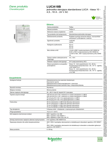 LUCA18B Charakterystyki jednostka sterująca standardowa LUCA - klasa 10 4,5...18 A - 24 V AC Główne Gama produktów TeSys Nazwa produktu TeSys U Skrócona nazwa urządzenia LUCA Typ produktu lub komponentu Standardowa jednostka sterująca Zastosowanie produktu Podstaw.wymogi ochronne dotycz. rozruszników silnikowych: przeciążenie i zwarcie Zgodność produktu LUFC00 LUFN.. Kategoria użytkowania AC-41 AC-43 AC-44 Moc silnika w kW 15 kW w 690 V prąd przemienny (AC) 50/60 Hz 9 kW w 500 V prąd przemienny (AC) 50/60 Hz 7,5 kW w 400...440 V prąd przemienny (AC) 50/60 Hz Zakres nastaw zabezpieczenia cieplnego 4.5...18 A Wartość napięcia sterującego 24 V prąd przemienny (AC) Klasa wyzwalania w przypadku przeciążenia Klasa 10 - limit częstotliwości: 40...60 Hz kompensacja temperaturowa: -25...70 °C - zgodny z IEC 60947-6-2 Klasa 10 - limit częstotliwości: 40...60 Hz kompensacja temperaturowa: -25...70 °C - zgodny z UL 508 Uzupełnienie dostępna funkcja Zabezpieczenie prze zwarciem doziemnym Kasowanie ręczne Zabezpieczenie przed przeciążeniem i zwarciem Zabezpieczenie przed zanikiem fazy i niesymetrią fazową Sposób montażu Wymienny Miejsce montażu Strona przenia Zakres napięcia sterującego 20...26.5 V dla AC obwód 24 V pracujący Typowe zużycie energii 140 mA przy 24 V AC I maximum w czasie zamykania z LUB12 220 mA przy 24 V AC I maximum w czasie zamykania z LUB32 70 mA przy 24 V AC I rms zapieczętowane z LUB12 90 mA przy 24 V AC I rms zapieczętowane z LUB32 Czas pracy 35 ms otwieranie z LUB12 dla Obwody sterowania 35 ms otwieranie z LUB32 dla Obwody sterowania 70 ms CLOSING z LUB12 dla Obwody sterowania 70 ms CLOSING z LUB32 dla Obwody sterowania Typ obciążenia 3-fazowy silnik - chłodzenie: z samoczynnym chłodzeniem Próg wyzwolenia 14,2 x Ir +/- 20 % [Ui] napięcie znamionowe izolacji 600 V zgodnie z UL 508 690 V zgodnie z IEC 60947-1 600 V zgodnie z CSA C22.2 Nr 14 [Uimp] znamionowe napięcie udarowe wytrzymywane 6 kV zgodnie z IEC 60947-6-2 Separacja obwodu dla celów bezpieczeństwa 400 V SELV pomiędzy sterowaniem a dodatkowymi obwodami zgodnie z IEC 609471 400 V SELV pomiędzy sterowanie lub dodatkowym obwodem a obwodem głównym zgodnie z IEC 60947-1 Masa produktu 0.135 kg 1/2 Informacje zawarte w tej dokumentacji zawiera ogólne opisy lub charakterystyki technicznej wykonania produktów zawartych w niniejszym dokumencie. Dokumentacja ta nie jest przeznaczona jako substytut i nie może być stosowana do określenia przydatności lub niezawodności tych produktów dla konkretnych aplikacji użytkownika. Obowiązkiem każdego takiego użytkownika lub integratora jest wykonanie odpowiedniej i pełnej analizy ryzyka, oceny i testowania produktów w odniesieniu do określonej aplikacji lub odpowiedniego stosowania korzystania z niej .Ani Schneider Electric Industries SAS, ani żaden z jej oddziałów lub spółek zależnych są ponosi odpowiedzialności za niewłaściwe wykorzystanie informacji w nim zawartych. Dane produktu Środowisko rozpraszanie ciepła 3 WdoObwody sterowania z LUB32 odporność na krótkie zaniki zasilania 3 ms odporność na zaniki napięcia 70 % 500 ms zgodnie z IEC 61000-4-11 normy EN 60947-6-2 IEC 60947-6-2 UL 508 typ E z przegrodą międzyfazową CSA C22.2 Nr 14 typ E certyfikaty produktu ABS ASEFA ATEX BV CCC CSA DNV GL GOST LROS (Lloyds register of shipping) UL stopień ochrony IP IP20 panel przedni i zaciski okablowane zgodnie z IEC 60947-1 IP20 inne lica zgodnie z IEC 60947-1 IP40 zewnętrzna strefa połączeń panelu przedniego zgodnie z IEC 60947-1 działanie ochronne TH zgodnie z IEC 60068 temperatura otoczenia dla pracy -25...70 °C temepratura otoczenia dla przechowywania -40...85 °C wysokość pracy (w metrach nad poziomem morza) 2000 m odpornośc ogniowa 650 °C zgodnie z IEC 60695-2-12 960 °C części wsporcze elementów pod napięciem zgodnie z IEC 60695-2-12 odporność na wstrząsy 10 gn otwarte bieguny mocy zgodnie z IEC 60068-2-27 15 gn zamknięte bieguny mocy zgodnie z IEC 60068-2-27 odporność na wibracje 2 gn 5...300 Hz otwarte bieguny mocy zgodnie z IEC 60068-2-6 4 gn 5...300 Hz zamknięte bieguny mocy zgodnie z IEC 60068-2-6 odporność na wyładowania elektrostatyczne 8 kV poziom 3 na wolnym powietrzu zgodnie z IEC 61000-4-2 8 kV poziom 4 na zestyku zgodnie z IEC 61000-4-2 nierozpraszająca fala uderzeniowa 1 kV tryb szeregowy zgodnie z IEC 60947-6-2 2 kV tryb wspólny zgodnie z IEC 60947-6-2 odpornośc na promieniowanie 10 V/m 3 zgodnie z IEC 61000-4-3 odporność na szybkozmienne stany przejściowe 2 kV[ ]klasa[ ]3 połączenie szeregowe zgodnie z IEC 61000-4-4 4 kV[ ]klasa[ ]4 wszytskie obwody z wyjątkiem łącza szeregowego zgodnie z IEC 61000-4-4 odporność na pola radioelektryczne 10 V zgodnie z IEC 61000-4-6 Oferta zrównoważonego rozwoju Status oferty zrównoważonego rozwoju Produkt ekologiczny Green Premium RoHS (kod daty: RRTT) Zgodność - od 1015 - Schneider Electric deklaracja zgodności REACh Referencja nie zawiera SVHC powyżej wartości progowej Profil ekologiczny produktu Dostępny Instrukcje dotyczące zakończenia okresu eksploatacji produktu Dostępny Contractual warranty Okres 18 miesięcy 2/2