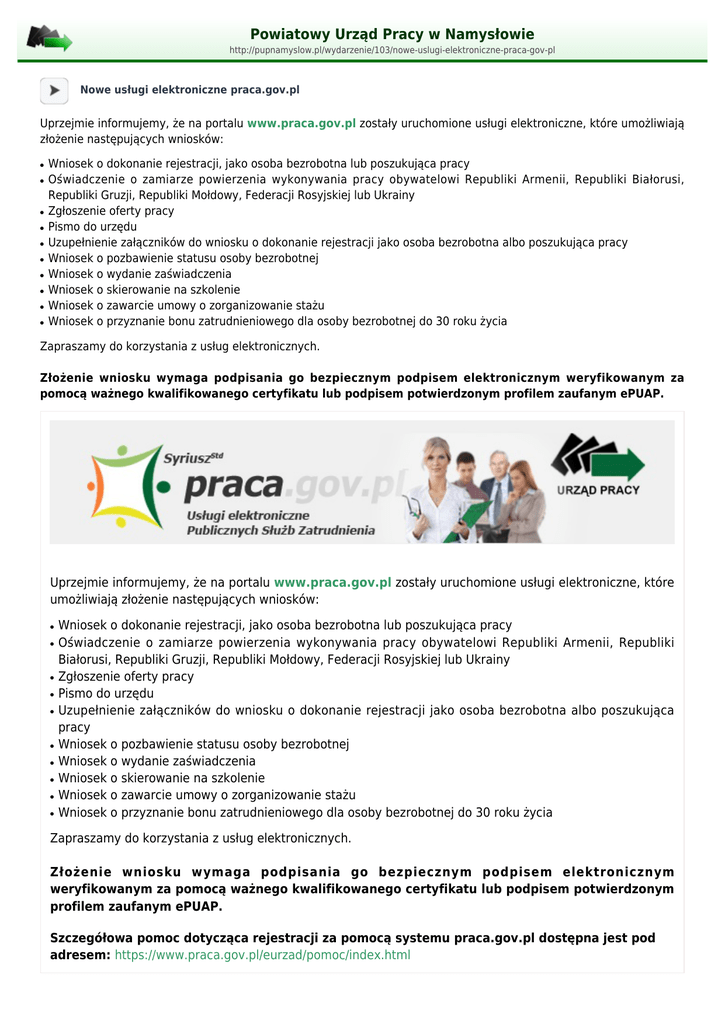 Powiatowy Urząd Pracy w Namysłowie http://pupnamyslow.pl/wydarzenie/103/nowe-uslugi-elektroniczne-praca-gov-pl Nowe usługi elektroniczne praca.gov.pl Uprzejmie informujemy, że na portalu www.praca.gov.pl zostały uruchomione usługi elektroniczne, które umożliwiają złożenie następujących wniosków: ● ● ● ● ● ● ● ● ● ● Wniosek o dokonanie rejestracji, jako osoba bezrobotna lub poszukująca pracy Oświadczenie o zamiarze powierzenia wykonywania pracy obywatelowi Republiki Armenii, Republiki Białorusi, Republiki Gruzji, Republiki Mołdowy, Federacji Rosyjskiej lub Ukrainy Zgłoszenie oferty pracy Pismo do urzędu Uzupełnienie załączników do wniosku o dokonanie rejestracji jako osoba bezrobotna albo poszukująca pracy Wniosek o pozbawienie statusu osoby bezrobotnej Wniosek o wydanie zaświadczenia Wniosek o skierowanie na szkolenie Wniosek o zawarcie umowy o zorganizowanie stażu Wniosek o przyznanie bonu zatrudnieniowego dla osoby bezrobotnej do 30 roku życia Zapraszamy do korzystania z usług elektronicznych. Złożenie wniosku wymaga podpisania go bezpiecznym podpisem elektronicznym weryfikowanym za pomocą ważnego kwalifikowanego certyfikatu lub podpisem potwierdzonym profilem zaufanym ePUAP. Uprzejmie informujemy, że na portalu www.praca.gov.pl zostały uruchomione usługi elektroniczne, które umożliwiają złożenie następujących wniosków: ● ● ● ● ● ● ● ● ● ● Wniosek o dokonanie rejestracji, jako osoba bezrobotna lub poszukująca pracy Oświadczenie o zamiarze powierzenia wykonywania pracy obywatelowi Republiki Armenii, Republiki Białorusi, Republiki Gruzji, Republiki Mołdowy, Federacji Rosyjskiej lub Ukrainy Zgłoszenie oferty pracy Pismo do urzędu Uzupełnienie załączników do wniosku o dokonanie rejestracji jako osoba bezrobotna albo poszukująca pracy Wniosek o pozbawienie statusu osoby bezrobotnej Wniosek o wydanie zaświadczenia Wniosek o skierowanie na szkolenie Wniosek o zawarcie umowy o zorganizowanie stażu Wniosek o przyznanie bonu zatrudnieniowego dla osoby bezrobotnej do 30 roku życia Zapraszamy do korzystania z usług elektronicznych. Złożenie wniosku wymaga podpisania go bezpiecznym podpisem elektronicznym weryfikowanym za pomocą ważnego kwalifikowanego certyfikatu lub podpisem potwierdzonym profilem zaufanym ePUAP. Szczegółowa pomoc dotycząca rejestracji za pomocą systemu praca.gov.pl dostępna jest pod adresem: https://www.praca.gov.pl/eurzad/pomoc/index.html