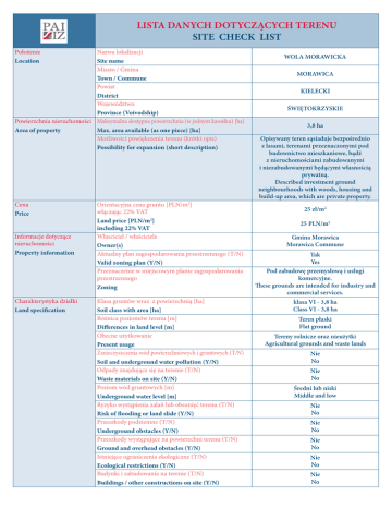 LISTA DANYCH DOTYCZĄCYCH TERENU SITE CHECK LIST Położenie Location Nazwa lokalizacji Site name Miasto / Gmina Town / Commune Powiat District Województwo Province (Voivodship) Powierzchnia nieruchomości Maksymalna dostępna powierzchnia (w jednym kawałku) [ha] Area of property Max. area available (as one piece) [ha] Możliwości powiększenia terenu (krótki opis) Possibility for expansion (short description) Cena Price Informacje dotyczące nieruchomości Property information Charakterystyka działki Land specification Orientacyjna cena gruntu [PLN/m2] włączając 22% VAT Land price [PLN/m2] including 22% VAT Własciciel / właściciele Owner(s) Aktualny plan zagospodarowania przestrzennego (T/N) Valid zoning plan (Y/N) Przeznaczenie w miejscowym planie zagospodarowania przestrzennego Zoning Klasa gruntów wraz z powierzchnią [ha] Soil class with area [ha] Różnica poziomów terenu [m] Differences in land level [m] Obecne użytkowanie Present usage Zanieczyszczenia wód powierzchniowych i gruntowych (T/N) Soil and underground water pollution (Y/N) Odpady znajdujące się na terenie (T/N) Waste materials on site (Y/N) Poziom wód gruntowych [m] Underground water level [m] Ryzyko wystąpienia zalań lub obsunięć terenu (T/N) Risk of flooding or land slide (Y/N) Przeszkody podziemne (T/N) Underground obstacles (Y/N) Przeszkody występujące na powierzchni terenu (T/N) Ground and overhead obstacles (Y/N) Istniejące ograniczenia ekologiczne (T/N) Ecological restrictions (Y/N) Budynki i zabudowania na terenie (T/N) Buildings / other constructions on site (Y/N) WOLA MORAWICKA MORAWICA KIELECKI ŚWIĘTOKRZYSKIE 3,8 ha Opisywany teren sąsiaduje bezpośrednio z lasami, terenami przeznaczonymi pod budownictwo mieszkaniowe, bądź z nieruchomościami zabudowanymi i niezabudowanymi będącymi własnością prywatną. Described investment ground neighbourhoods with woods, housing and build-up area, which are private property. 25 zł/m2 25 PLN/m2 Gmina Morawica Morawica Commune Tak Yes Pod zabudowę przemysłową i usługi komercyjne. These grounds are intended for industry and commercial services. klasa VI - 3,8 ha Class VI - 3,8 ha Teren płaski Flat ground Tereny rolnicze oraz nieużytki Agricultural grounds and waste lands Nie No Nie No Średni lub niski Middle and low Nie No Nie No Nie No Nie No Nie No Ograniczenia budowlane Building restrictions Połączenia transportowe Transport links Procent dopuszczalnej zabudowy Building coverage [%] Ograniczenia wysokości budynków [m] Building height limit [m] Strefa buforowa [m] Buffer zone [m] Inne, jeśli występują Others if any Droga dojazdowa do terenu (rodzaj drogi i jej szerokość) Access road to the plot (type and width of access road) Autostrada / droga krajowa [km] Nearest motorway / national road [km] Kolej [km] Railway line [km] Bocznica kolejowa [km] Railway siding [km] Najbliższe lotnisko międzynarodowe [km] Nearest international airport [km] Istniejąca infrastruktura Existing infrastructure Najbliższe miasto wojewódzkie [km] Nearest province capital [km] Elektryczność na terenie (T/N) Electricity (Y/N) • Odległość przyłącza od granicy terenu Connection point (distance from boundary) [m] • Napięcie Voltage [kV] • Dostępna moc Available capacity [MW] Gaz na terenie (T/N) Gas (Y/N) • Odległość przyłącza od granicy działki Connection point (distance from boundary) [m] • Wartość kaloryczna Calorific value [MJ/Nm3] • Średnica rury Pipe diameter [mm] • Dostępna objętość Available capacity [Nm3/h] Woda na terenie (T/N) Water supply (Y/N) 50% 10,5 m Nie No Strefa techniczna elektroenergetyczna -10 m 10 m zone of limitation connected with pylon Droga krajowa nr 73 National road No 73 Grunt położony jest w odległości 200 m od drogi krajowej nr 73. W odległości 15 kilometrów znajduje się także droga ekspresowa S7, a w odległości 20 km droga krajowa nr 74. These grounds are located in the distance of 200m of the national road 73. There is a car highway S7 in the distance of 15 km and national road No 74 in the distance of 20 km. Dębska Wola - 7 km Dębska Wola - 7 km Kraków-Balice 105km planowane Lotnisko Kielce-Obice - 8 km Kraków-Balice 105km planned airport Kielce-Obice - 8 km Kielce - 15km Tak Yes Punkt przyłączeniowy na terenie. Connection point is on the site. 15 kV Bez ograniczeń. No limits. Nie. No. 3km. Podłączenie należy ustalić z Zakładami Gazowniczymi w Kielcach. 3km. Connection should be fixed with Gas Company. Nie. No Istniejąca infrastruktura Existing infrastructure • Odległość przyłącza od granicy terenu Connection point (distance from boundary) [m] Istnieje dokumentacja techniczna z pozwoleniem na budowę przyłącza wodociągowego. W przypadku zainteresowania inwestora gruntem gmina na własny koszt jest w stanie doprowadzić nitkę wodociągu w ciągu 2 miesięcy. Przygotowywany jest także projekt o dofinansowanie tego przedsięwzięcia z RPO WŚ. There is technical documentation with building permit for water connection. Incase of investor’s interest of the land the city could distribute water system in about 2 months on its expense. There is also prepared an application to RPOWŚ to get financial help for this project. • Dostępna objętość Available capacity [m3/24h] Kanalizacja na terenie (T/N) Sewage discharge (Y/N) • Odległość przyłącza od granicy terenu Connection point (distance from boundary) [m] Bez ograniczeń. No limits. • Dostępna objętość Available capacity [m3/24h] • Ograniczenie zrzutu ścieków Limitation of discharge Odprowadzenie wód deszczowych na terenie (T/N) Rain water discharge (Y/N) Oczyszczalnia ścieków na terenie bądź w bezpośrednim sąsiedztwie Treatment plant (Y/N) Telefony (T/N) Telephone (Y/N) • Odległość przyłącza od granicy terenu Connection point (distance from boundary) [m] • Liczba dostępnych linii analogowych Number of available analog lines • Liczba dostępnych linii ISDN 