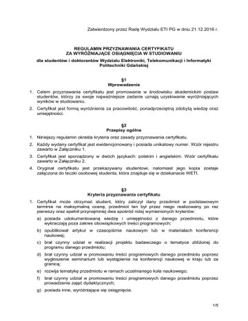 Zatwierdzony przez Radę Wydziału ETI PG w dniu 21.12.2016 r. REGULAMIN PRZYZNAWANIA CERTYFIKATU ZA WYRÓŻNIAJĄCE OSIĄGNIĘCIA W STUDIOWANIU dla studentów i doktorantów Wydziału Elektroniki, Telekomunikacji i Informatyki Politechniki Gdańskiej §1 Wprowadzenie 1. Celem przyznawania certyfikatu jest promowanie w środowisku akademickim postaw studentów, którzy za swoje najważniejsze zadanie uznają uzyskiwanie wyróżniających wyników w studiowaniu. 2. Certyfikat jest formą wyróżnienia za pracowitość, ponadprzeciętną zdobytą wiedzę oraz umiejętności. §2 Przepisy ogólne 1. Niniejszy regulamin określa kryteria oraz zasady przyznawania certyfikatu. 2. Każdy wydany certyfikat jest ewidencjonowany i posiada unikatowy numer. Wzór rejestru zawarto w Załączniku 1. 3. Certyfikat jest sporządzony w dwóch językach: polskim i angielskim. Wzór certyfikatu zawarto w Załączniku 2. 4. Oryginał certyfikatu jest przekazywany studentowi, natomiast jego kopia zostaje załączona do teczki osobowej studenta, która znajduje się w dziekanacie WETI. §3 Kryteria przyznawania certyfikatu 1. Certyfikat może otrzymać student, który zaliczył dany przedmiot w podstawowym terminie na maksymalną ocenę, przedmiot ten był przez niego realizowany po raz pierwszy oraz spełnił przynajmniej dwa spośród niżej wymienionych kryteriów: a) posiada udokumentowaną wiedzę i umiejętności z danego przedmiotu, które wykraczają poza zakres obowiązkowych treści programowych; b) opublikował artykuł w czasopiśmie naukowym lub w materiałach konferencji naukowej; c) brał czynny udział w realizacji projektu badawczego o tematyce zbliżonej do programu danego przedmiotu; d) brał czynny udział w promowaniu treści programowych danego przedmiotu poprzez wygłoszenie seminarium lub wystąpienia na konferencji naukowej w kraju lub za granicą; e) rozwija tematykę przedmiotu w ramach uczelnianego koła naukowego; f) brał czynny udział w promowaniu treści programowych danego przedmiotu poprzez prowadzenie zajęć dydaktycznych; g) posiada inne, wyróżniające się osiągnięcia. 1/5 §4 Zasady przyznawania certyfikatu 1. Wniosek o przyznanie certyfikatu, którego wzór zawiera Załącznik nr 3 do niniejszego regulaminu, składa do dziekanatu WETI prowadzący przedmiot w terminie do jednego miesiąca po zakończeniu semestru, w którym student zdał egzamin lub uzyskał zaliczenie. 2. Decyzję o przyznaniu certyfikatu podejmuje dziekan na podstawie złożonego wniosku o przyznanie certyfikatu. §5 Postanowienia końcowe 1. Decyzja o przyznaniu lub nieprzyznaniu certyfikatu jest ostateczna i nie przysługuje od niej odwołanie. 2/5 Załącznik nr 1 Wzór rejestru REJESTR CERTYFIKATÓW ZA WYRÓŻNIAJĄCE OSIĄGNIĘCIA W STUDIOWANIU Lp. stanowiąca numer certyfikatu Imię i nazwisko studenta / doktoranta Nr albumu Kierunek studiów Poziom studiów / Forma studiów Rok akademicki Semestr Przedmiot Data przyznania certyfikatu Prowadzący przedmiot Poziom studiów – I, II lub III stopnia Forma studiów – stacjonarne lub niestacjonarne 3/5 Załącznik nr 2 Wzór certyfikatu 4/5 Załącznik nr 3 Wzór wniosku o przyznanie certyfikatu WYDZIAŁ ELEKTRONIKI, TELEKOMUNIKACJI I INFORMATYKI WNIOSEK O PRZYZNANIE CERTYFIKATU ZA WYRÓŻNIAJĄCE OSIAGNIĘCIA W STUDIOWANIU Wypełnia prowadzący przedmiot I. 1. Imię i nazwisko studenta: ……………………………………………. 2. Nazwa przedmiotu w języku polskim: ……………………………………………. 3. Nazwa przedmiotu w języku angielskim: ……………………………………………. 4. Poziom studiów: ……………………………………………. 5. Forma studiów: ……………………………………………. 6. Rok akademiki: ……………………………………………. 7. Semestr: ……………………………………………. 8. Prowadzący przedmiot: ……………………………………………. 9. Uzasadnienie: ……………………………………………. …………………………………..……………………………………………………………. ………………………………………..………………………………………………………. ……………………………………………..…………………………………………………. …………………………………………………..……………………………………………. 10. Podpis prowadzącego przedmiot: ………............................. Wypełnia prowadzący przedmiot lub student ubiegający się o certyfikat II. Załączniki dokumentujące osiągnięcia studenta wymienione w §3 punkcie 1 niniejszego regulaminu: 1. 2. 3. 4. 5. …………………… …………………… …………………… …………………… …………………… 5/5
