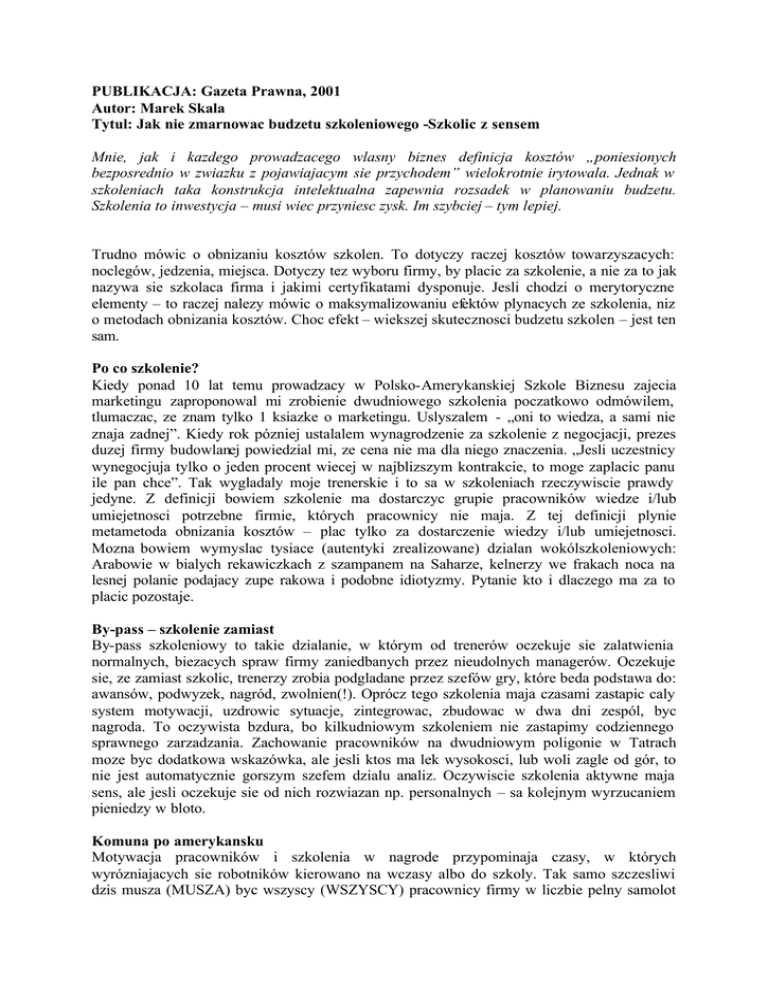 PUBLIKACJA: Gazeta Prawna, 2001 Autor: Marek Skala Tytul: Jak nie zmarnowac budzetu szkoleniowego -Szkolic z sensem Mnie, jak i kazdego prowadzacego wlasny biznes definicja kosztów „poniesionych bezposrednio w zwiazku z pojawiajacym sie przychodem” wielokrotnie irytowala. Jednak w szkoleniach taka konstrukcja intelektualna zapewnia rozsadek w planowaniu budzetu. Szkolenia to inwestycja – musi wiec przyniesc zysk. Im szybciej – tym lepiej. Trudno mówic o obnizaniu kosztów szkolen. To dotyczy raczej kosztów towarzyszacych: noclegów, jedzenia, miejsca. Dotyczy tez wyboru firmy, by placic za szkolenie, a nie za to jak nazywa sie szkolaca firma i jakimi certyfikatami dysponuje. Jesli chodzi o merytoryczne elementy – to raczej nalezy mówic o maksymalizowaniu efektów plynacych ze szkolenia, niz o metodach obnizania kosztów. Choc efekt – wiekszej skutecznosci budzetu szkolen – jest ten sam. Po co szkolenie? Kiedy ponad 10 lat temu prowadzacy w Polsko-Amerykanskiej Szkole Biznesu zajecia marketingu zaproponowal mi zrobienie dwudniowego szkolenia poczatkowo odmówilem, tlumaczac, ze znam tylko 1 ksiazke o marketingu. Uslyszalem - „oni to wiedza, a sami nie znaja zadnej”. Kiedy rok pózniej ustalalem wynagrodzenie za szkolenie z negocjacji, prezes duzej firmy budowlanej powiedzial mi, ze cena nie ma dla niego znaczenia. „Jesli uczestnicy wynegocjuja tylko o jeden procent wiecej w najblizszym kontrakcie, to moge zaplacic panu ile pan chce”. Tak wygladaly moje trenerskie i to sa w szkoleniach rzeczywiscie prawdy jedyne. Z definicji bowiem szkolenie ma dostarczyc grupie pracowników wiedze i/lub umiejetnosci potrzebne firmie, których pracownicy nie maja. Z tej definicji plynie metametoda obnizania kosztów – plac tylko za dostarczenie wiedzy i/lub umiejetnosci. Mozna bowiem wymyslac tysiace (autentyki zrealizowane) dzialan wokólszkoleniowych: Arabowie w bialych rekawiczkach z szampanem na Saharze, kelnerzy we frakach noca na lesnej polanie podajacy zupe rakowa i podobne idiotyzmy. Pytanie kto i dlaczego ma za to placic pozostaje. By-pass – szkolenie zamiast By-pass szkoleniowy to takie dzialanie, w którym od trenerów oczekuje sie zalatwienia normalnych, biezacych spraw firmy zaniedbanych przez nieudolnych managerów. Oczekuje sie, ze zamiast szkolic, trenerzy zrobia podgladane przez szefów gry, które beda podstawa do: awansów, podwyzek, nagród, zwolnien(!). Oprócz tego szkolenia maja czasami zastapic caly system motywacji, uzdrowic sytuacje, zintegrowac, zbudowac w dwa dni zespól, byc nagroda. To oczywista bzdura, bo kilkudniowym szkoleniem nie zastapimy codziennego sprawnego zarzadzania. Zachowanie pracowników na dwudniowym poligonie w Tatrach moze byc dodatkowa wskazówka, ale jesli ktos ma lek wysokosci, lub woli zagle od gór, to nie jest automatycznie gorszym szefem dzialu analiz. Oczywiscie szkolenia aktywne maja sens, ale jesli oczekuje sie od nich rozwiazan np. personalnych – sa kolejnym wyrzucaniem pieniedzy w bloto. Komuna po amerykansku Motywacja pracowników i szkolenia w nagrode przypominaja czasy, w których wyrózniajacych sie robotników kierowano na wczasy albo do szkoly. Tak samo szczesliwi dzis musza (MUSZA) byc wszyscy (WSZYSCY) pracownicy firmy w liczbie pelny samolot lub prom w drodze do Szwecji lub na Rodos. Dobra atmosfera imprezy integracyjnej nie zalezy przeciez od wydanych pieniedzy, równie dobrze mozna sie bawic w Warszawie jak i w Wiedniu. A do Wiednia pojechac na wycieczke, nie dorabiajac do wyjazdu „ideologii szkoleniowej”. Na warszawskich targach turystycznych zaprezentowano szereg propozycji szkolen motywacyjnych, w tym np. lodolamaczem na biegun pólnocny z kapiela w przerebli. Jak, kogo i do czego ma zmotywowac kilkudniowy wyjazd za ok. 20 tys. zl w sytuacji narastajacego trudnego rynku pracy i konsekwencji w postaci grozby zwolnien w wielu branzach (np. banki, reklama, audyt)? Oczywistoscia jest dobry motywacyjny wplyw wspólnego wyjazdu i dobrej zabawy na zespól pracowników, ale za Hertzbergiem – pod warunkiem, ze podstawowe czynniki warunkujace zadowolenie z pracy sa zrealizowane. Inaczej zmarnujemy kolejne pieniadze. Noc jak miesiac Innym motywem kosztowym jest miejsce szkolenia, bywa ze z jednym noclegiem drozszym niz normalny, miesieczny czynsz za mieszkanie szkolonego pracownika. Kiedys konferencje „Obnizanie kosztów spólek akcyjnych” zorganizowano w .... najdrozszym hotelu w Polsce. Nie chodzi o skapstwo, ale czy na kazdym szkoleniu musi byc losos, sola, krewetki i hotel z noclegiem za 600 zl.? Dla podkreslenia waznosci, szkolenie powinno odbywac sie w warunkach troche lepszych niz codzienne. Troche ! Oczywiscie kazdy z nas chetnie korzysta z luksusu na koszt innych, ale czy nocleg w osrodku pod Warszawa za 100 zl zamiast w centrum za 500 zl obnizy efekt szkolenia? Jestes moja Coca-cola, czyli contraining Contraining to technika, która nie zmniejsza kosztów, ale przynosi dodatkowe zyski. Nazwa to dwa terminy - consulting i trening. Pojecie to obejmuje taka sytuacje, w której rozwiazanie wygenerowane w czasie treningu zostaje wprowadzone przez pracowników szkolonej firmy do codziennej praktyki. W ten sposób efektem ubocznym szkolenia staje sie consulting. Chodzi tu o efekt uboczny, o dodatkowe pomysly, które pracownicy firmy kreuja w czasie warsztatów, a potem, uznajac je za skuteczne - wdrazaja. Technika ta pojawila sie w naszej firmie, kiedy klienci zaczeli domagac sie warsztatów i casów, ale „nie z Coca-coli, tylko z naszej branzy”. Poniewaz mielismy do dyspozycji tylko te tlumaczone, równie odlegle od polskiej praktyki jak przyslowiowe „z Coca-coli”, wiec opracowywalismy wlasne, na bazie problemów szkolonej firmy. Kilku naszych klientów zarobilo calkiem dobre pieniadze wdrazajac rozwiazania powstale przy okazji w trakcie szkoleniowych warsztatów. McDonald’s i BETIS Ritzer w swoimi ksiazkami o mackdonaldyzacji swiata podsunal nam cenna mysl, gwaltownie podnoszaca skutecznos