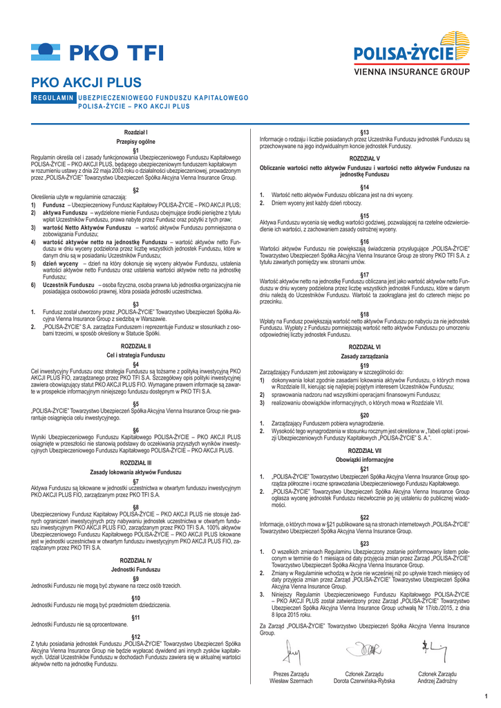 PKO AKCJI PLUS REGUL AMIN U B E Z P I E C Z E N I O W E G O F U N D U S Z U K A P I TA ŁO W E G O P O L I S A - Ż YC I E – P KO A KC J I P L U S Rozdział I Przepisy ogólne §1 Regulamin określa cel i zasady funkcjonowania Ubezpieczeniowego Funduszu Kapitałowego POLISA-ŻYCIE – PKO AKCJI PLUS, będącego ubezpieczeniowym funduszem kapitałowym w rozumieniu ustawy z dnia 22 maja 2003 roku o działalności ubezpieczeniowej, prowadzonym przez „POLISA-ŻYCIE” Towarzystwo Ubezpieczeń Spółka Akcyjna Vienna Insurance Group. §13 Informacje o rodzaju i liczbie posiadanych przez Uczestnika Funduszu jednostek Funduszu są przechowywane na jego indywidualnym koncie jednostek Funduszy. §2 Określenia użyte w regulaminie oznaczają: 1) Fundusz – Ubezpieczeniowy Fundusz Kapitałowy POLISA-ŻYCIE – PKO AKCJI PLUS; 2) aktywa Funduszu – wydzielone mienie Funduszu obejmujące środki pieniężne z tytułu wpłat Uczestników Funduszu, prawa nabyte przez Fundusz oraz pożytki z tych praw; 3) wartość Netto Aktywów Funduszu – wartość aktywów Funduszu pomniejszona o zobowiązania Funduszu; 4) wartość aktywów netto na jednostkę Funduszu – wartość aktywów netto Funduszu w dniu wyceny podzielona przez liczbę wszystkich jednostek Funduszu, które w danym dniu są w posiadaniu Uczestników Funduszu; 5) dzień wyceny – dzień na który dokonuje się wyceny aktywów Funduszu, ustalenia wartości aktywów netto Funduszu oraz ustalenia wartości aktywów netto na jednostkę Funduszu; 6) Uczestnik Funduszu – osoba fizyczna, osoba prawna lub jednostka organizacyjna nie posiadająca osobowości prawnej, która posiada jednostki uczestnictwa. §14 1. Wartość netto aktywów Funduszu obliczana jest na dni wyceny. 2. Dniem wyceny jest każdy dzień roboczy. §3 1. Fundusz został utworzony przez „POLISA-ŻYCIE” Towarzystwo Ubezpieczeń Spółka Akcyjna Vienna Insurance Group z siedzibą w Warszawie. 2. „POLISA-ŻYCIE” S.A. zarządza Funduszem i reprezentuje Fundusz w stosunkach z osobami trzecimi, w sposób określony w Statucie Spółki. Rozdział II Cel i strategia Funduszu §4 Cel inwestycyjny Funduszu oraz strategia Funduszu są tożsame z polityką inwestycyjną PKO AKCJI PLUS FIO, zarządzanego przez PKO TFI S.A. Szczegółowy opis polityki inwestycyjnej zawiera obowiązujący statut PKO AKCJI PLUS FIO. Wymagane prawem informacje są zawarte w prospekcie informacyjnym niniejszego funduszu dostępnym w PKO TFI S.A. §5 „POLISA-ŻYCIE” Towarzystwo Ubezpieczeń Spółka Akcyjna Vienna Insurance Group nie gwarantuje osiągnięcia celu inwestycyjnego. §6 Wyniki Ubezpieczeniowego Funduszu Kapitałowego POLISA-ŻYCIE – PKO AKCJI PLUS osiągnięte w przeszłości nie stanowią podstawy do oczekiwania przyszłych wyników inwestycyjnych Ubezpieczeniowego Funduszu Kapitałowego POLISA-ŻYCIE – PKO AKCJI PLUS. Rozdział III Zasady lokowania aktywów Funduszu §7 Aktywa Funduszu są lokowane w jednostki uczestnictwa w otwartym funduszu inwestycyjnym PKO AKCJI PLUS FIO, zarządzanym przez PKO TFI S.A. §8 Ubezpieczeniowy Fundusz Kapitałowy POLISA-ŻYCIE – PKO AKCJI PLUS nie stosuje żadnych ograniczeń inwestycyjnych przy nabywaniu jednostek uczestnictwa w otwartym funduszu inwestycyjnym PKO AKCJI PLUS FIO, zarządzanym przez PKO TFI S.A. 100% aktywów Ubezpieczeniowego Funduszu Kapitałowego POLISA-ŻYCIE – PKO AKCJI PLUS lokowane jest w jednostki uczestnictwa w otwartym funduszu inwestycyjnym PKO AKCJI PLUS FIO, zarządzanym przez PKO TFI S.A. Rozdział IV Jednostki Funduszu §9 Jednostki Funduszu nie mogą być zbywane na rzecz osób trzecich. §10 Jednostki Funduszu nie mogą być przedmiotem dziedziczenia. Jednostki Funduszu nie są oprocentowane. §11 §12 Z tytułu posiadania jednostek Funduszu „POLISA-ŻYCIE” Towarzystwo Ubezpieczeń Spółka Akcyjna Vienna Insurance Group nie będzie wypłacać dywidend ani innych zysków kapitałowych. Udział Uczestników Funduszu w dochodach Funduszu zawiera się w aktualnej wartości aktywów netto na jednostkę Funduszu. Rozdział V Obliczanie wartości netto aktywów Funduszu i wartości netto aktywów Funduszu na jednostkę Funduszu §15 Aktywa Funduszu wycenia się według wartości godziwej, pozwalającej na rzetelne odzwierciedlenie ich wartości, z zachowaniem zasady ostrożnej wyceny. §16 Wartości aktywów Funduszu nie powiększają świadczenia przysługujące „POLISA-ŻYCIE” Towarzystwo Ubezpieczeń Spółka Akcyjna Vienna Insurance Group ze strony PKO TFI S.A. z tytułu zawartych pomiędzy ww. stronami umów. §17 Wartość aktywów netto na jednostkę Funduszu obliczana jest jako wartość aktywów netto Funduszu w dniu wyceny podzielona przez liczbę wszystkich jednostek Funduszu, które w danym dniu należą do Uczestników Funduszu. Wartość ta zaokrąglana jest do czterech miejsc po przecinku. §18 Wpłaty na Fundusz powiększają wartość netto aktywów Funduszu po nabyciu za nie jednostek Funduszu. Wypłaty z Funduszu pomniejszają wartość netto aktywów Funduszu po umorzeniu odpowiedniej liczby jednostek Funduszu. Rozdział VI Zasady zarządzania §19 Zarządzający Funduszem jest zobowiązany w szczególności do: 1) dokonywania lokat zgodnie zasadami lokowania aktywów Funduszu, o których mowa w Rozdziale III, kierując się najlepiej pojętym interesem Uczestników Funduszu; 2) sprawowania nadzoru nad wszystkimi operacjami finansowymi Funduszu; 3) realizowaniu obowiązków informacyjnych, o których mowa w Rozdziale VII. §20 1. Zarządzający Funduszem pobiera wynagrodzenie. 2. Wysokość tego wynagrodzenia w stosunku rocznym jest określona w „Tabeli opłat i prowizji Ubezpieczeniowych Funduszy Kapitałowych „POLISA-ŻYCIE” S. A.”. Rozdział VII Obowiązki informacyjne §21 1. „POLISA-ŻYCIE” Towarzystwo Ubezpieczeń Spółka Akcyjna Vienna Insurance Group sporządza półroczne i roczne sprawozdania Ubezpieczeniowego Funduszu Kapitałowego. 2. „POLISA-ŻYCIE” To