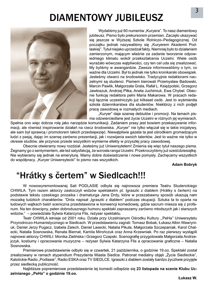 DIAMENTOWY JUBILEUSZ 3 Wydaliśmy już 60 numerów „Kuryera”. To nasz diamentowy jubileusz. Pismo było prekursorem przemian. Zaczęło ukazywać się jeszcze w Wyższej Szkole Rolniczo–Pedagogicznej. Od początku jednak nazywaliśmy się „Kuryerem Akademii Podlaskiej”. Tytuł niejako uprzedzał fakty. Niemniej było to działaniem zamierzonym, mającym właśnie za zadanie tworzenie odpowiedniego klimatu wokół przekształcenia Uczelni. Wiele osób wyrażało wówczas wątpliwości, czy ten cel uda się zrealizować. My byliśmy w awangardzie. Zawsze informowaliśmy o tym, co ważne dla Uczelni. Był to jednak nie tylko kronikarski obowiązek. Jesteśmy otwarci na środowisko. Tradycyjnie redaktorami naczelnymi są studenci. Pismem kierowali Przemysław Badowski, Marcin Pawlik, Małgorzata Grala, Rafał L. Księżpolski, Grzegorz Jawtoszuk, Andrzej Piłka, Aneta Juchimiuk, Ewa Chybel. Obecnie funkcję redaktora pełni Maria Makarowa. W pracach redakcji łącznie uczestniczyło już kilkaset osób. Jest to wyśmienita szkoła dziennikarstwa dla studentów. Niektórzy z nich podjęli pracę zawodową w rozmaitych mediach. „Kuryer” daje szansę debiutów i promocji. Na łamach pisma odzwierciedlane jest życie Uczelni w różnych jej wymiarach. Spełnia ono więc dobrze rolę jako narzędzie komunikacji. Zadaniem prasy jest bowiem przekazywanie informacji, ale również inspirowanie działań na rzecz środowiska. „Kuryer” nie tylko włączał się w takie inicjatywy, ale sam był sprawcą i promotorem takich przedsięwzięć. Niewątpliwie gazeta ta jest ośrodkiem gromadzącym ludzi z pasją, dając im szansę zarówno prezentacji, jak i rozwijania swoich talentów. Jest to ważne nie tylko w okresie studiów, ale przynosi przede wszystkim wymierne efekty w przyszłej pracy zawodowej. Obecnie otwieramy nowy rozdział. Jesteśmy już Uniwersytetem! Zmienia się więc tytuł naszego pisma. Żegnamy go z sentymentem, ale też satysfakcją, że wzrosła ranga Uczelni. Przekroczyliśmy już sześćdziesiątkę. Nie wybieramy się jednak na emeryturę. Mamy dobre doświadczenie i nowe pomysły. Zachęcamy wszystkich do współpracy. „Kuryer Uniwersytecki” to pismo nas wszystkich. Adam Bobryk “Hrátky s čertem” w Siedlcach!!! W nowowyremontowanej Sali PODLASIE odbyła się najnowsza premiera Teatru Studenckiego CHWILA. Tym razem aktorzy zaskoczyli widzów spektakelm pt. Igraszki z diabłem (Hrátky s čertem) na podstawie tekstu czeskiego prozaika i dramaturga Jana Drdy, które w przezabawny sposób ukazują nam mozaikę ludzkich charakterów. “Drda napisał „Igraszki z diabłem” podczas okupacji. Sztuka ta to oparta na ludowych wątkach baśń sceniczna przedstawiona w konwencji komediowej, gdzie sacrum miesza się z profanum. Na ten dowcipny, pełen dobrodusznego humoru spektakl zapraszamy zarówno młodszych jak i starszych widzów,” – powiedziała Sylwia Katarzyna Flis, reżyser spektaklu. Teatr CHWILA istnieje od 2001 roku. Działa przy Uczelnianym Ośrodku Kultury ,,PeHa’’ Uniwersytetu Przyrodniczo-Humanistycznego w Siedlcach. W przedstawieniu zagrali: Tomasz Bobak, Łukasz Albin Wawryniuk, Daniel Jerzy Pugacz, Izabela Zalech, Daniel Lasecki, Natalia Pikula, Małgorzata Szczepaniak, Karol Chalecki, Natalia Sosnowska, Renata Biernat, Kamila Mirończuk oraz Anna Krzewniak. Po raz pierwszy wystąpili najnowsi aktorzy CHWILI: Monika Zielińska i Grzegorz Czapski. Scenografię przygotowała Małgorzata Andrzejczyk, kostiumy i opracowanie muzyczne – reżyser Sylwia Katarzyna Flis a opracowanie graficzne – Natalia Sosnowska. Premierowe przedstawienie odbyło się w czwartek, 21 października, o godzinie 19.oo. Spektakl został zrealizowany w ramach stypendium Prezydenta Miasta Siedlce. Patronat medialny objęli „Życie Siedleckie”, Katolickie Radio „Podlasie”, Radio ESKA oraz TV SIEDLCE. Igraszki z diabłem zostały bardzo życzliwie przyjęte przez siedlecką publiczność. Najbliższe popremierowe przedstawienie tej komedii odbędzie się 23 listopada na scenie Klubu Uczelnianego „PeHa” o godzinie 19.oo. Łukasz W. TWARZ NUMERU 4 „Trzeba wykorzystywać szansę dopóki ona istnieje” Z prof. dr hab. Zofią Chyrą-Rolicz, koordynatorem ds. Wymiany Studenckiej Wydziału Humanistycznego UPH rozmawiają Maria Tarkowska i Łukasz Wawryniuk – Prosimy o krótką definicję Erasmusa. – Erasmus to podróżowanie po świecie w ramach wymiany młodzieży i kadry naukowej do uczelni, które posiadają Kartę Erasmusa. Program Erasmus dotyczy krajów będących w Unii Europejskiej i krajów stowarzyszonych. W Europie jest tych uczelni już bardzo dużo, niektóre ośrodki akademickie mają nawet 60 umów o współpracy, nasza uczelnia ma zaledwie kilkanaście, ale lista zwiększa się. Na stronie internetowej Uniwersytetu Przyrodniczo-Humanistycznego można znaleźć informacje na temat tego, które wydziały z jakimi uczelniami zagranicznymi mają podpisane kontrakty o współpracy. Studenci, którzy wyjeżdżają na Erasmusa, składają aplikacje, które są corocznie rozpatrywane. Może być to wyjazd na semestr, a nawet na rok studiów. – Studenci często skarżą się na problemy związane z zaliczaniem semestru po powrocie z wymiany. Na czym polegają i z czego wynikają te problemy? – Tak szeroką wymianę umożliwia punktacja ECTS, która jest próbą znalezienia wspólnej wartości zdobywanej wiedzy. Ze zrozumieniem tej punktacji bywają często problemy. Z założenia wynika, że student przebywający na wymianie powinien uzyskać tę samą sumę punktów, którą by uzyskał w kraju. Ale oczywiście programy i przedmioty są różne, więc nie zawsze jest to ekwiwalentna wiedza, dlatego zdarza się, że wykładowcy w kraju nie chcą uznać punktów uzyskanych za granicą. Namawiałabym więc studentów do zapoznania się z programem nauczania z tego semestru, z którego zamierzają wyjechać z kraju, następnie do zaznajomienia 