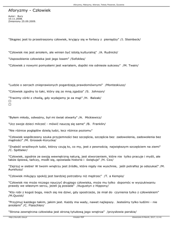 Aforyzmy, Maksymy, Wiersze, Teksty Piosenek, Życzenia Aforyzmy - Człowiek Autor: Bury 10.11.2008. Zmieniony 25.09.2009. "Skąpiec jest to przestraszony człowiek, kryjący się w fortecy z pieniędzy" /J. Steinbeck/ "Człowiek nie jest aniołem, ale winien być istotą kulturalną" /A. Rudnicki/ "Usposobienie człowieka jest jego losem" /Sofokles/ "Człowiek z nowymi pomysłami jest wariatem, dopóki nie odniesie sukcesu" /M. Twain/ "Ludzie o sercach znieprawionych pogardzają prawdomównymi" /Monteskiusz/ "Człowiek zgodny to taki, który się ze mną zgadza" /S. Johnson/ "Tracimy córki z chwilą, gdy wydajemy je za mąż" /H. Balzak/ "Byłem młody, odważny, był mi świat otwarty" /A. Mickiewicz/ "Ucz swoje dzieci milczeć - mówić nauczą się same" /B. Franklin/ "Nie różnice poglądów dzielą ludzi, lecz różnice poziomu" "Człowiek współczesny szuka przyjemności bez szczęścia, szczęścia bez zadowolenia, zadowolenia bez mądrości" /M. Grossek-Korycka/ "Znaleźć wrażliwych ludzi, którzy czują to, co my, jest z pewnością największym szczęściem na ziemi" /C. Spitteler/ "Człowiek, zgodnie ze swoją wewnętrzną naturą, jest stworzeniem, które nie tylko pracuje i myśli, ale także śpiewa, tańczy, modli się, opowiada historie i świętuje" /H. Cox/ "Zajrzyj w siebie! W twoim wnętrzu jest źródło, które nigdy nie wyschnie, jeśli potrafisz je odszukać" /M. Aureliusz/ "Człowiek miłujący spokój jest bardziej potrzebny niż mędrzec" /T. a Kempis/ "Człowiek nie może niczego nauczyć drugiego człowieka, może mu tylko dopomóc w wyszukiwaniu prawdy we własnym sercu, jeżeli ją posiada" /Augustyn z Hippony/ "Kto robi z kogoś boga, niech się nie dziwi, gdy spostrzeże, że miał do czynienia tylko z człowiekiem" /M.Quoist/ "Przyjmuj każdego takim, jakim jest. Każdy ma wady, nawet najlepszy. Jesteśmy tylko ludźmi - nie aniołami" /C. Flaischlen/ "Strona zewnętrzna człowieka jest stroną tytułową jego wnętrza" /przysłowie perskie/ http://bury81.cba.pl Kreator PDF Utworzono 8 March, 2017, 11:41 Aforyzmy, Maksymy, Wiersze, Teksty Piosenek, Życzenia "Właściwe stosunki z ludźmi to: gorliwość, ciekawość życia, uczenie się od każdego, kto coś wie i umie" /L. Schefer/ "W świecie gdzie życie tak naturalnie łączy się z życiem, gdzie kwiat nawet w powiewie wiatru łączy się z innymi kwiatami, gdzie łabędź zna wszystkie łabędzie, tylko ludzie budują sobie samotność" /A. de Saint-Exupery/ "Kwiat potrzebuje słońca, aby być kwiatem; człowiek potrzebuje miłości, aby być człowiekiem" /P. Bosmans/ "Błądzić jest rzeczą ludzką" /Seneka Starszy/ "Człowiek naprawdę posiada tylko to, co jest w nim" /O. Wilde/ "Nawet codzienność człowieka to wielkie święto - bo nie jest rzeczą zwykłą, że Ktoś strugami na ziemię wylewa miłość" /R. Mleczko/ "Szanuję to, co trwa dłużej niż ludzie" /A. de Saint-Exupery/ "Kto poniża sam jest niski" /A. de Saint-Exupery/ "Pycha działa jak zamek błyskawiczny: błyskawicznie zamyka na drugiego człowieka" /E. Lewandowska/ "Unosząc się dumą, oddalamy się od ludzi" /E. Lewandowska/ "Najniebezpieczniejszą dla człowieka chorobą jest niewydolność sumienia" /ks. S. Jasionek/ "Człowiek zdolny jest do sumiennego spełniania obowiązków dopiero wtedy, gdy narzuci sobie więzy pewnych rygorów, dyscypliny, powściągliwości i wyrzeczeń. W zamian za przyjęcie tych więzów wyzwala się z więzów samolubstwa, chciwości, lenistwa, pijaństwa, wygodnictwa - i staje się naprawdę wolny w swoim działaniu" /ks. T. Olszański/ "Pierwszym i najważniejszym zadaniem człowieka wobec talentów jakie otrzymuje, jest otworzyć na nie swe ręce i przyjąć je dobrym sercem, a więc z radością i wdzięcznością wobec Dawcy" /abp S. Nowak/ "Człowiek, który nie potrafi kochać, zatracił już swoje człowieczeństwo" /bp A. Długosz/ "W pewnym sensie każdy człowiek skazany jest na samotność, przynajmniej do jakiegoś stopnia. Mogę być otoczony tłumem przyjaciół, a jednak są we mnie sprawy, których nie zrozumie absolutnie nikt. Nikt nie potrafi dotrzeć do rdzenia duszy drugiego człowieka. I każdy człowiek posiada w swej duszy pewne zakątki, pewne rezerwaty, których nie przekroczy nawet najbliższy przyjaciel. Po prostu nie zrozumie wszystkich moich spraw, a i ja nie umiem wszystkich spraw wypowiedzieć i wyjaśnić" /ks. T. Olszański/ "Niektórzy są odważni dopiero wtedy, gdy już nie widzą żadnego innego wyjścia" /W. Faulkner/ "Wszystkie nasze nieszczęścia biorą się z jednej tylko przyczyny, mianowicie stąd, że człowiek nie umie przebywać w samotności" /B. Pascal/ "Trzeba ludzi znosić, jeśli nie umie się ich poprawić" /M. Aureliusz/ "Jesteśmy jedni dla drugich pielgrzymami, którzy różnymi drogami zdążają w trudzie na to samo spotkanie" /A. de Saint-Exupery/ "Bolesne problemy swego życia tworzy człowiek najczęściej wewnątrz siebie, tworzy wówczas, gdy szuka kompromisów, gdy usiłuje pogodzić się to, czego pogodzić się nie da" /ks. T. Olszański/ "Ludzie są jak kwiaty: stworzeni do tego, aby się rozwijać" /A. Liege/ "Człowiek, tak jak wszystko w przyrodzie, potrzebuje światła i ciepła, aby się rozwijać" /E. Lewandowska/ http://bury81.cba.pl Kreator PDF Utworzono 8 March, 2017, 11:41 Aforyzmy, Maksymy, Wiersze, Teksty Piosenek, Życzenia "Kto chce zdobyć ludzi, musi w zastaw dać własne serce" /A. Kolping/ "Dla niejednego człowieka łatwiej jest spełnić przysługę, niż ją przyjąć. Najczęściej wchodzi tu w grę podrażniona ambicja. Człowiek lubi być niezależny i jak najwięcej zawdzięczać sobie. Nie lubi prosić ani okazywać wdzięczności. Jest w tym po prostu brak poczucia rzeczywistości: nawet najbardziej niezależny człowiek na każdym kroku w swym bytowaniu i w swoim działaniu uzależniony jest od drugich" /ks. T. Olszański/ "Ludzie radośni są silni w miłości bliźniego" /A. Janssen/ "Ni