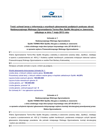Treść uchwał (wraz z informacją o wynikach głosowania) podjętych podczas obrad Nadzwyczajnego Walnego Zgromadzenia Termo-Rex Spółki Akcyjnej w Jaworznie, odbytego w dniu 7 maja 2013 roku Uchwała nr 1 Nadzwyczajnego Walnego Zgromadzenia Spółki TERMO-REX Spółka Akcyjna z siedzibą w Jaworznie z dnia siódmego maja dwa tysiące trzynastego roku (07-05-2013 r.) w sprawie wyboru Przewodniczącego Walnego Zgromadzenia § 1. --------------------------------------------------------------------------------------------------------------------------------------------Walne Zgromadzenie Termo-Rex Spółki Akcyjnej z siedzibą w Jaworznie (zwanej dalej: „Spółką”), działając w oparciu o postanowienia art. 409 § 1 Kodeksu spółek handlowych, postanawia niniejszym dokonać wyboru Przewodniczącej Walnego Zgromadzenia w osobie Pani Barbary Krakowskiej. ------------------------------------------§ 2. --------------------------------------------------------------------------------------------------------------------------------------------Niniejsza uchwała wchodzi w Ŝycie z dniem jej podjęcia.------------------------------------------------------------------------Wyniki głosowania dotyczącego Uchwały Nr 1: Liczba akcji, z których oddano waŜne głosy: 50.000.000 Procentowy udział akcji, z których oddano waŜne głosy w kapitale zakładowym Spółki: 44,25% Łączna liczba waŜnych głosów: 100.000.000 Łączna liczba niewaŜnych głosów: 0 Liczba głosów „za”: 100.000.000 Liczba głosów „przeciw”: 0 Liczba głosów „wstrzymujących się”: 0 Do Uchwały Nr 1 nie zgłoszono sprzeciwów. Uchwała nr 2 Nadzwyczajnego Walnego Zgromadzenia Spółki TERMO-REX Spółka Akcyjna z siedzibą w Jaworznie z dnia siódmego maja dwa tysiące trzynastego roku (07-05-2013 r.) w sprawie uchylenia tajności głosowania dotyczącego wyboru komisji skrutacyjnej powoływanej przez Walne Zgromadzenie § 1. --------------------------------------------------------------------------------------------------------------------------------------------Walne Zgromadzenie Termo-Rex Spółki Akcyjnej z siedzibą w Jaworznie (zwanej dalej: „Spółką”), działając w oparciu o postanowienia art. 420 § 3 Kodeksu spółek handlowych, postanawia niniejszym uchylić tajność głosowania dotyczącego powołania, dla potrzeb niniejszego Walnego Zgromadzenia, komisji skrutacyjnej i wyboru jej członków.---------------------------------------------------------------------------------------------------------------------§ 2. --------------------------------------------------------------------------------------------------------------------------------------------1 Niniejsza uchwała wchodzi w Ŝycie z dniem jej podjęcia.------------------------------------------------------------------------Wyniki głosowania dotyczącego Uchwały Nr 2: Liczba akcji, z których oddano waŜne głosy: 50.000.000 Procentowy udział akcji, z których oddano waŜne głosy w kapitale zakładowym Spółki: 44,25% Łączna liczba waŜnych głosów: 100.000.000 Łączna liczba niewaŜnych głosów: 0 Liczba głosów „za”: 100.000.000 Liczba głosów „przeciw”: 0 Liczba głosów „wstrzymujących się”: 0 Do Uchwały Nr 2 nie zgłoszono sprzeciwów. Uchwała nr 3 Nadzwyczajnego Walnego Zgromadzenia Spółki TERMO-REX Spółka Akcyjna z siedzibą w Jaworznie z dnia siódmego maja dwa tysiące trzynastego roku (07-05-2013 r.) w sprawie powołania komisji skrutacyjnej i wyboru jej członków § 1. --------------------------------------------------------------------------------------------------------------------------------------------Walne Zgromadzenie Termo-Rex Spółki Akcyjnej z siedzibą w Jaworznie (zwanej dalej: „Spółką”), odstępuje od wyboru komisji skrutacyjnej.-------------------------------------------------------------------------------------------------------------§ 2. --------------------------------------------------------------------------------------------------------------------------------------------Niniejsza uchwała wchodzi w Ŝycie z dniem jej podjęcia.------------------------------------------------------------------------Wyniki głosowania dotyczącego Uchwały Nr 3: Liczba akcji, z których oddano waŜne głosy: 50.000.000 Procentowy udział akcji, z których oddano waŜne głosy w kapitale zakładowym Spółki: 44,25% Łączna liczba waŜnych głosów: 100.000.000 Łączna liczba niewaŜnych głosów: 0 Liczba głosów „za”: 100.000.000 Liczba głosów „przeciw”: 0 Liczba głosów „wstrzymujących się”: 0 Do Uchwały Nr 3 nie zgłoszono sprzeciwów. Uchwała nr 4 Nadzwyczajnego Walnego Zgromadzenia Spółki TERMO-REX Spółka Akcyjna z siedzibą w Jaworznie z dnia siódmego maja dwa tysiące trzynastego roku (07-05-2013 r.) w sprawie przyjęcia porządku obrad Walnego Zgromadzenia § 1.----------------------------------------------------------------------------------------------------------------------------------------------Walne Zgromadzenie Termo-Rex Spółki Akcyjnej z siedzibą w Jaworznie (zwanej dalej: „Spółką”), postanawia niniejszym przyjąć porządek obrad niniejszego Walnego Zgromadzenia Spółki w brzmieniu zawartym w treści ogłoszenia o zwołaniu tego Zgromadzenia opublikowanego w dniu 10 kwietnia 2013 roku: ---------------------------- − zgodnie z właściwymi postanowieniami Kodeksu spółek handlowych – na stronie internetowej Spółki (http://www.termo-rex.com.pl), ----------------------------------------------------------------------------------------------------- 2 − zgodnie z przepisami o ofercie publicznej i warunkach wprowadzenia instrumentów finansowych do zorganizowanego systemu obrotu oraz o spółkach publicznych – w drodze raportu ESPI Nr 3/2013 „Zwołanie Nadzwyczajnego Walnego Zgromadzenia Termo-Rex S.A.”, ------------------------------------------------ − w sposób określony dla przekazywania informacji bieŜ