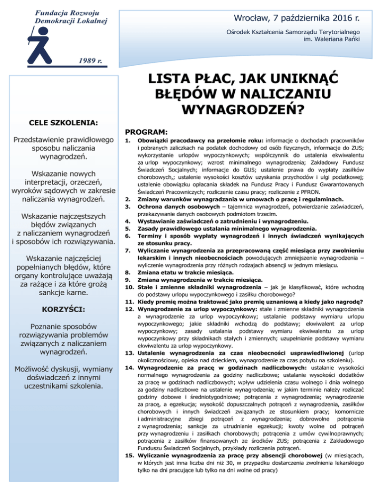 7 października 2016 r. RozwiązaniaWrocław, informatyczne Ośrodek Kształcenia Samorządu Terytorialnego im. Waleriana Pańki LISTA PŁAC, JAK UNIKNĄĆ BŁĘDÓW W NALICZANIU WYNAGRODZEŃ? CELE SZKOLENIA: PROGRAM: Przedstawienie prawidłowego sposobu naliczania wynagrodzeń. Wskazanie nowych interpretacji, orzeczeń, wyroków sądowych w zakresie naliczania wynagrodzeń. Wskazanie najczęstszych błędów związanych z naliczaniem wynagrodzeń i sposobów ich rozwiązywania. 1. 2. 3. 4. 5. 6. 7. Wskazanie najczęściej popełnianych błędów, które organy kontrolujące uważają za rażące i za które grożą sankcje karne. 8. 9. 10. KORZYŚCI: 11. 12. Poznanie sposobów rozwiązywania problemów związanych z naliczaniem wynagrodzeń. 13. Możliwość dyskusji, wymiany doświadczeń z innymi uczestnikami szkolenia. 14. 15. Obowiązki pracodawcy na przełomie roku: informacje o dochodach pracowników i pobranych zaliczkach na podatek dochodowy od osób fizycznych, informacje do ZUS; wykorzystanie urlopów wypoczynkowych; współczynnik do ustalenia ekwiwalentu za urlop wypoczynkowy; wzrost minimalnego wynagrodzenia; Zakładowy Fundusz Świadczeń Socjalnych; informacje do GUS; ustalenie prawa do wypłaty zasiłków chorobowych,; ustalenie wysokości kosztów uzyskania przychodów i ulgi podatkowej; ustalenie obowiązku opłacania składek na Fundusz Pracy i Fundusz Gwarantowanych Świadczeń Pracowniczych; rozliczenie czasu pracy; rozliczenie z PFRON. Zmiany warunków wynagradzania w umowach o pracę i regulaminach. Ochrona danych osobowych – tajemnica wynagrodzeń, potwierdzanie zaświadczeń, przekazywanie danych osobowych podmiotom trzecim. Wystawianie zaświadczeń o zatrudnieniu i wynagrodzeniu. Zasady prawidłowego ustalania minimalnego wynagrodzenia. Terminy i sposób wypłaty wynagrodzeń i innych świadczeń wynikających ze stosunku pracy. Wyliczanie wynagrodzenia za przepracowaną część miesiąca przy zwolnieniu lekarskim i innych nieobecnościach powodujących zmniejszenie wynagrodzenia – wyliczenie wynagrodzenia przy różnych rodzajach absencji w jednym miesiącu. Zmiana etatu w trakcie miesiąca. Zmiana wynagrodzenia w trakcie miesiąca. Stałe i zmienne składniki wynagrodzenia – jak je klasyfikować, które wchodzą do podstawy urlopu wypoczynkowego i zasiłku chorobowego? Kiedy premię można traktować jako premię uznaniową a kiedy jako nagrodę? Wynagrodzenie za urlop wypoczynkowy: stałe i zmienne składniki wynagrodzenia a wynagrodzenie za urlop wypoczynkowy; ustalanie podstawy wymiaru urlopu wypoczynkowego; jakie składniki wchodzą do podstawy; ekwiwalent za urlop wypoczynkowy; zasady ustalania podstawy wymiaru ekwiwalentu za urlop wypoczynkowy przy składnikach stałych i zmiennych; uzupełnianie podstawy wymiaru ekwiwalentu za urlop wypoczynkowy. Ustalenie wynagrodzenia za czas nieobecności usprawiedliwionej (urlop okolicznościowy, opieka nad dzieckiem, wynagrodzenie za czas pobytu na szkoleniu). Wynagrodzenie za pracę w godzinach nadliczbowych: ustalanie wysokości normalnego wynagrodzenia za godziny nadliczbowe; ustalanie wysokości dodatków za pracę w godzinach nadliczbowych; wpływ udzielenia czasu wolnego i dnia wolnego za godziny nadliczbowe na ustalenie wynagrodzenia; w jakim terminie należy rozliczać godziny dobowe i średniotygodniowe; potrącenia z wynagrodzenia; wynagrodzenie za pracę, a egzekucja; wysokość dopuszczalnych potrąceń z wynagrodzenia, zasiłków chorobowych i innych świadczeń związanych ze stosunkiem pracy; komornicze i administracyjne zbiegi potrąceń z wynagrodzenia; dobrowolne potrącenia z wynagrodzenia; sankcje za utrudnianie egzekucji; kwoty wolne od potrąceń przy wynagrodzeniu i zasiłkach chorobowych; potrącenia z umów cywilnoprawnych; potrącenia z zasiłków finansowanych ze środków ZUS; potrącenia z Zakładowego Funduszu Świadczeń Socjalnych, przykłady rozliczenia potrąceń. Wyliczanie wynagrodzenia za pracę przy absencji chorobowej (w miesiącach, w których jest inna liczba dni niż 30, w przypadku dostarczenia zwolnienia lekarskiego tylko na dni pracujące lub tylko na dni wolne od pracy) ADRESACI SZKOLE NIA: Pracownicy działów kadr i płac, działów finansowych, wszystkich osób zajmujących się naliczaniem wynagrodzeń. 16. Ustalenie wynagrodzenia za pracę oraz świadczenia chorobowego za ten sam dzień. 17. Ustalenie wynagrodzenia i zaliczki na podatek dochodowy od wypłat z wynagrodzenia i zasiłku chorego zleceniobiorcy. 18. Wypłata wynagrodzenia po ustaniu zatrudnienia a ulga podatkowa i koszty uzyskania przychodu. 19. Zastosowanie ulgi podatkowej w trakcie roku. 20. Pytania i dyskusja. DANE DO KONTAKTU: Ośrodek Kształcenia Samorządu Terytorialnego im. Waleriana Pańki 40-014 Katowice ul. Mariacka 1 MIEJSCE SZKOLENIA: NIP: 522-000-18-95 Tel 32 259 86 73, 32 253 84 09 Fax. 32 259 86 73 w. 22, 26 e-mail: [email protected] www.okst.pl OSOBA DO KONTAKTU: Barbara Tekień tel. 32 206 80 39, 32 206 98 43 w. 25 [email protected] KOD SZKOLENIA Wrocław, siedziba Ośrodka, ul. Piłsudskiego 49 – 57, III piętro Mapkę dojazdu do miejsca szkolenia znajdą Państwo na www.okst.pl/dojazd TERMIN SZKOLENIA: 7 października 2016 r., godz. 10.00-15.00 CENA: 339 zł netto/os. Udział w szkoleniu zwolniony z VAT w przypadku finansowania szkolenia ze środków publicznych. Cena zawiera materiały szkoleniowe, zaświadczenie o ukończeniu szkolenia, poczęstunek i serwis kawowy. RABAT 10% za każdą następną osobę zgłoszoną z tej samej instytucji. ZGŁOSZENIA: Wypełnioną kartę zgłoszenia należy przesłać mailem lub faksem lub poprzez formularz na www.okst.p do 4 października 2016 r. ☐ Katowice 1040/16D/T Nazwa nabywcy (dane do faktury) Adres nabywcy (ulica, nr domu, kod pocztowy, miejscowość) NIP Telefon Email 1. Imię i nazwisko uczestnika, stanowisko 2. Imię i nazwisko uczestnika, stanowisko 3. Imię i nazwisko uczestnika, stanowisko Oświadczam, że szkolenie dla 