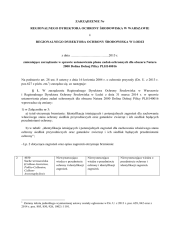 ZARZĄDZENIE Nr REGIONALNEGO DYREKTORA OCHRONY ŚRODOWISKA W WARSZAWIE i REGIONALNEGO DYREKTORA OCHRONY ŚRODOWISKA W ŁODZI z dnia ……………………………..2015 r. zmieniające zarządzenie w sprawie ustanowienia planu zadań ochronnych dla obszaru Natura 2000 Dolina Dolnej Pilicy PLH140016 Na podstawie art. 28 ust. 8 ustawy z dnia 16 kwietnia 2004 r. o ochronie przyrody (Dz. U. z 2013 r. poz.627 z późn. zm.1) zarządza się, co następuje: § 1. W zarządzeniu Regionalnego Dyrektora Ochrony Środowiska w Warszawie i Regionalnego Dyrektora Ochrony Środowiska w Łodzi z dnia 31 marca 2014 r. w sprawie ustanowienia planu zadań ochronnych dla obszaru Natura 2000 Dolina Dolnej Pilicy PLH140016 wprowadza się zmiany: 1) w Załączniku nr 3: a) tytuł otrzymuje brzmienie: Identyfikacja istniejących i potencjalnych zagrożeń dla zachowania właściwego stanu ochrony siedlisk przyrodniczych oraz gatunków zwierząt i ich siedlisk będących przedmiotami ochrony; b) w tabeli: „Identyfikacja istniejących i potencjalnych zagrożeń dla zachowania właściwego stanu ochrony siedlisk przyrodniczych oraz gatunków zwierząt i ich siedlisk będących przedmiotami ochrony”; - Lp. 2 dotycząca zagrożeń oraz opisu zagrożeń otrzymuje brzmienie: 2 4030 Suche wrzosowiska (Calluno-Genistion, Pohlio-Callunion, CallunoArctostaphylion) 1 Niewystarczająca wiedza o przedmiocie ochrony i identyfikacji zagrożeń. Niewystarczająca wiedza o przedmiocie ochrony i identyfikacji zagrożeń. Niewystarczająca wiedza o przedmiocie ochrony i identyfikacji zagrożeń. Zmiany tekstu jednolitego wymienionej ustawy zostały ogłoszone w Dz. U. z 2013 r. poz. 628, 842 oraz z 2014 r. poz. 805, 850, 926, 1002 i 1101. - Lp. 3 dotycząca zagrożeń oraz opisu zagrożeń otrzymuje brzmienie: 3 6120 Ciepłolubne, śródlądowe murawy napiaskowe (Koelerion glaucae) Niewystarczająca wiedza o przedmiocie ochrony i identyfikacji zagrożeń. Niewystarczająca wiedza o przedmiocie ochrony i identyfikacji zagrożeń. Niewystarczająca wiedza o przedmiocie ochrony i identyfikacji zagrożeń. - Lp. 6 dotycząca zagrożeń oraz opisu zagrożeń otrzymuje brzmienie: 6 7140 Torfowiska przejściowe i trzęsawiska (przeważnie z roślinnością z ScheuchzerioCaricetea) Niewystarczająca wiedza o przedmiocie ochrony i identyfikacji zagrożeń. Niewystarczająca wiedza o przedmiocie ochrony i identyfikacji zagrożeń. Niewystarczająca wiedza o przedmiocie ochrony i identyfikacji zagrożeń. - Lp. 7 dotycząca zagrożeń oraz opisu zagrożeń otrzymuje brzmienie: 7 9170 Grąd środkowoeuropejski i subkontynentalny (Galio-Carpinetum, Tilio-Carpinetum) Niewystarczająca wiedza o przedmiocie ochrony i identyfikacji zagrożeń. Niewystarczająca wiedza o przedmiocie ochrony i identyfikacji zagrożeń. Niewystarczająca wiedza o przedmiocie ochrony i identyfikacji zagrożeń. - Lp. 9 dotycząca zagrożeń oraz opisu zagrożeń otrzymuje brzmienie: 9 91F0 Łęgowe lasy dębowowiązowo-jesionowe (Ficario-Ulmetum) Niewystarczająca wiedza o przedmiocie ochrony i identyfikacji zagrożeń. Niewystarczająca wiedza o przedmiocie ochrony i identyfikacji zagrożeń. Niewystarczająca wiedza o przedmiocie ochrony i identyfikacji zagrożeń. - Lp. 10 dotycząca zagrożeń oraz opisu zagrożeń otrzymuje brzmienie: 10 91I0 Ciepłolubne dąbrowy (Quercetalia pubescenti-petraeae) Niewystarczająca wiedza o przedmiocie ochrony i identyfikacji zagrożeń. Niewystarczająca wiedza o przedmiocie ochrony i identyfikacji zagrożeń. Niewystarczająca wiedza o przedmiocie ochrony i identyfikacji zagrożeń. - Lp. 14 dotycząca zagrożeń oraz opisu zagrożeń otrzymuje brzmienie: 14 1096 Minóg strumieniowy Lampetra planeri Niewystarczająca wiedza o przedmiocie ochrony i identyfikacji zagrożeń. Niewystarczająca wiedza o przedmiocie ochrony i identyfikacji zagrożeń. Niewystarczająca wiedza o przedmiocie ochrony i identyfikacji zagrożeń. - Lp. 15 dotycząca zagrożeń oraz opisu zagrożeń otrzymuje brzmienie: 15 1130 Boleń Aspius aspius Niewystarczająca wiedza o przedmiocie ochrony i identyfikacji zagrożeń. - uchyla się lp. 20; 2) Załącznik nr 5 w tabeli: - uchyla się lp. 1; Niewystarczająca wiedza o przedmiocie ochrony i identyfikacji zagrożeń. Niewystarczająca wiedza o przedmiocie ochrony i identyfikacji zagrożeń. - Lp. 2 dotycząca działań ochronnych otrzymuje brzmienie: 2 6410 Zmiennowilgotne łąki trzęślicowe (Molinion) Utrzymanie otwartego charakteru siedliska. Działanie obligatoryjne. Ekstensywne użytkowanie powierzchni i elementów krajobrazu nieużytkowanych rolniczo. Zadanie należy rozpocząć w pierwszych 3 latach obowiązywania planu zadań ochronnych, a następnie kontynuować co roku w okresie obowiązywania planu zadań ochronnych. Działanie fakultatywne Użytkowanie łąkarskie zgodnie z wymogami odpowiednich pakietów rolno-środowiskowych. Ekstensywne użytkowanie kośne koszenie na wysokość minimum 10 cm z usunięciem pokosu (najlepiej ręczne lub lekkim sprzętem). Zaniechania stosowania nawożenia, Realizację zadania należy rozpocząć w pierwszych trzech latach obowiązywania planu zadań Działki ewidencyjne numer: powiat białobrzeski, gmina Promna, obręb Falęcice: 288, 289/1, 290/1, 291/1, 290/2, 291/3, 291/2, 292/1, 292/2, 293, 294/1, 294/2; powiat grójecki, gmina Nowe Miasto nad Pilicą : 94; powiat przysuski gmina Klwów, obręb Brzeski: 72, 74, 75, 78, 79, 80, 83, 84, 85, 87, 88, 91, 92, 93, 96, 97, 100/1, 101/2, 100/2, 101/1, 104, 105, 106, 109, 110, 113, 115, 118, 119, 122, 123, 126, 127/1, 152/1, 263, 264, 265, 266, 267, 268, 269, 270, 271, 272, 274, 284, 285, 286, 287, 288; powiat przysuski, gmina Klwów, obręb Ligęzów: 832, 833/1, 833/2, 834, 835, 836, 837, 838, 839, 840, 841, 842, 843, 844, 845, 846, 847, 848, 849, 850, 851, 852, 853, 854, 855, 856, 859, 860, 861, 862, 863, 864, 865, 870, 871, 872, 873, 874, 875, 876, 877, 878, 879, 880, 882, 883, 884, 885, 886/1, 886/2,