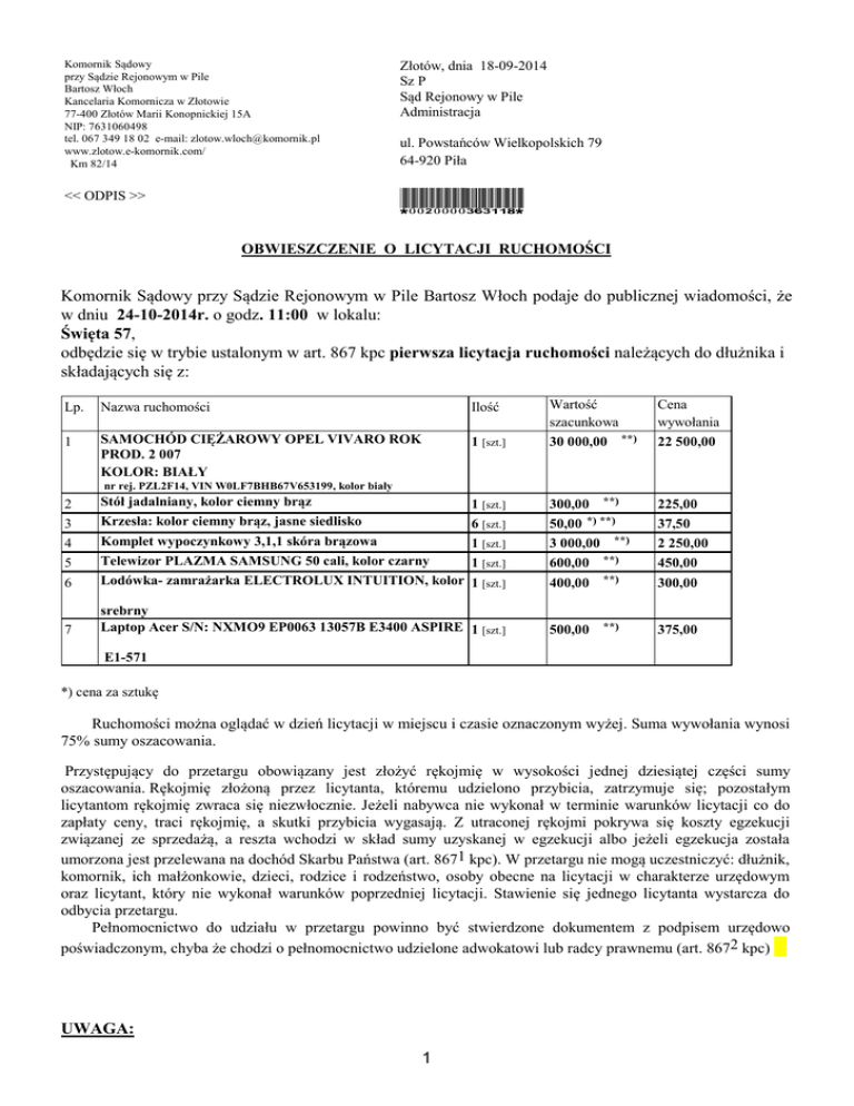 Komornik Sądowy przy Sądzie Rejonowym w Pile Bartosz Włoch Kancelaria Komornicza w Złotowie 77-400 Złotów Marii Konopnickiej 15A NIP: 7631060498 tel. 067 349 18 02 e-mail: [email protected] www.zlotow.e-komornik.com/ Km 82/14 Złotów, dnia 18-09-2014 Sz P Sąd Rejonowy w Pile Administracja << ODPIS >> *0020000363118* ul. Powstańców Wielkopolskich 79 64-920 Piła OBWIESZCZENIE O LICYTACJI RUCHOMOŚCI Komornik Sądowy przy Sądzie Rejonowym w Pile Bartosz Włoch podaje do publicznej wiadomości, że w dniu 24-10-2014r. o godz. 11:00 w lokalu: Święta 57, odbędzie się w trybie ustalonym w art. 867 kpc pierwsza licytacja ruchomości należących do dłużnika i składających się z: 1 [szt.] Wartość szacunkowa 30 000,00 **) Cena wywołania 22 500,00 1 [szt.] 6 [szt.] 1 [szt.] 1 [szt.] 1 [szt.] 300,00 **) 50,00 *) **) 3 000,00 **) 600,00 **) 400,00 **) 225,00 37,50 2 250,00 450,00 300,00 Lp. Nazwa ruchomości Ilość 1 SAMOCHÓD CIĘŻAROWY OPEL VIVARO ROK PROD. 2 007 KOLOR: BIAŁY .nr rej. PZL2F14, VIN W0LF7BHB67V653199, kolor biały 2 3 4 5 6 Stół jadalniany, kolor ciemny brąz Krzesła: kolor ciemny brąz, jasne siedlisko Komplet wypoczynkowy 3,1,1 skóra brązowa Telewizor PLAZMA SAMSUNG 50 cali, kolor czarny Lodówka- zamrażarka ELECTROLUX INTUITION, kolor 7 srebrny Laptop Acer S/N: NXMO9 EP0063 13057B E3400 ASPIRE 1 [szt.] 500,00 **) 375,00 E1-571 *) cena za sztukę Ruchomości można oglądać w dzień licytacji w miejscu i czasie oznaczonym wyżej. Suma wywołania wynosi 75% sumy oszacowania. Przystępujący do przetargu obowiązany jest złożyć rękojmię w wysokości jednej dziesiątej części sumy oszacowania. Rękojmię złożoną przez licytanta, któremu udzielono przybicia, zatrzymuje się; pozostałym licytantom rękojmię zwraca się niezwłocznie. Jeżeli nabywca nie wykonał w terminie warunków licytacji co do zapłaty ceny, traci rękojmię, a skutki przybicia wygasają. Z utraconej rękojmi pokrywa się koszty egzekucji związanej ze sprzedażą, a reszta wchodzi w skład sumy uzyskanej w egzekucji albo jeżeli egzekucja została umorzona jest przelewana na dochód Skarbu Państwa (art. 8671 kpc). W przetargu nie mogą uczestniczyć: dłużnik, komornik, ich małżonkowie, dzieci, rodzice i rodzeństwo, osoby obecne na licytacji w charakterze urzędowym oraz licytant, który nie wykonał warunków poprzedniej licytacji. Stawienie się jednego licytanta wystarcza do odbycia przetargu. Pełnomocnictwo do udziału w przetargu powinno być stwierdzone dokumentem z podpisem urzędowo poświadczonym, chyba że chodzi o pełnomocnictwo udzielone adwokatowi lub radcy prawnemu (art. 8672 kpc) UWAGA: 1 Licytacja może się nie odbyć bez podania przyczyny. Jeżeli drzwi będą zamknięte, będą otwierane na koszt i odpowiedzialność obowiązanegodłużnika. 2