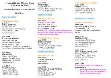 1. Festiwal Filmów Młodego Widza Wędrujące Ale Kino! Teremiski, Białowieża 10-13 września 2010 PROGRAM Piątek, 10 września godz. 17:00 PODRÓŻ TEO Meksyk 2008, 90’ reżyseria: Walter Doehner Pecanins od 12 lat, dla gimnazjum Sobota, 11 września Białowieża, Kino Żubr godz. 9:00 ŻABY I ROPUCHY Holandia 2009, 75' reżyseria: Simone van Dusseldorp od 7 lat, dla klas 1-3 SP pokaz konkursowy Białowieża, Kino Żubr godz. 13:00 MAGICZNE DRZEWO Polska 2007/2008, 84’ reżyseria: Andrzej Maleszka od 7 lat, dla klas 1 - 6 SP SPOTKANIE z odtwórcą jednej z głównych ról ADAMEM SZCZEGÓŁĄ i MAGDĄ GENSLER – kierownikiem produkcji filmu godz. 11:00 MAGICZNE DRZEWO Polska 2007/2008, 84’ reżyseria: Andrzej Maleszka od 7 lat, dla klas 1 - 6 SP SPOTKANIE Z ADAMEM SZCZEGÓŁĄ, ODTWÓRCĄ JEDNEJ Z GŁÓWNYCH RÓL Teremiski 30, Teatr w Stodole godz. 18:00 ŻABY I ROPUCHY Holandia 2009, 75' reżyseria: Simone van Dusseldorp od 7 lat, pokaz familijny godz. 13:00 KROKODYLE Niemcy 2009, 97 min. reżyseria: Christian Ditter od 10 lat, dla klas 4 - 6 SP pokaz konkursowy godz. 15:00 MAX MINSKY I JA Niemcy 2007, 94 min. reżyseria: Anna Justice od 12 lat, dla gimnazjum Teremiski 30, Teatr w Stodole godz. 18:00 MALI RABUSIE Austria, Łotwa 2009, 76 min. reżyseria: Armands Zvirbulis od 8 lat, pokaz familijny Niedziela, 12 września Białowieża, Kino Żubr godz. 13:00 ZESTAW ANIMACJI dla klas 0-6 pokaz familijny godz. 15:00 TAJEMNICA KWIATU PAPROCI Polska 2004, 70' reżyseria Tadeusz Wilkosz od 6 lat, dla klas 0-6 SP Poniedziałek, 13 września Białowieża, Kino Żubr godz. 9:30 POLSKIE ANIMACJE DLA NAJMŁODSZYCH zestaw animacji dla przedszkolaków ok. 50' godz. 11:00 MALI RABUSIE Austria, Łotwa 2009, 76 min. reżyseria: Armands Zvirbulis od 8 lat, dla klas 2-5 SP pokaz konkursowy godz. 13:00 SOS – NIESPOKOJNE LATO Norwegia 2008, 87’ reżyseria Arne Lindtner Næss od 10 lat, dla klas 4 - 6 SP pokaz konkursowy godz. 17:00 UROCZYSTA GALA FESTIWALU, w programie m.in.: − prezentacja efektu warsztatu animacji − pokaz oscarowego filmu PIOTRUŚ I WILK z beatboxem na żywo!