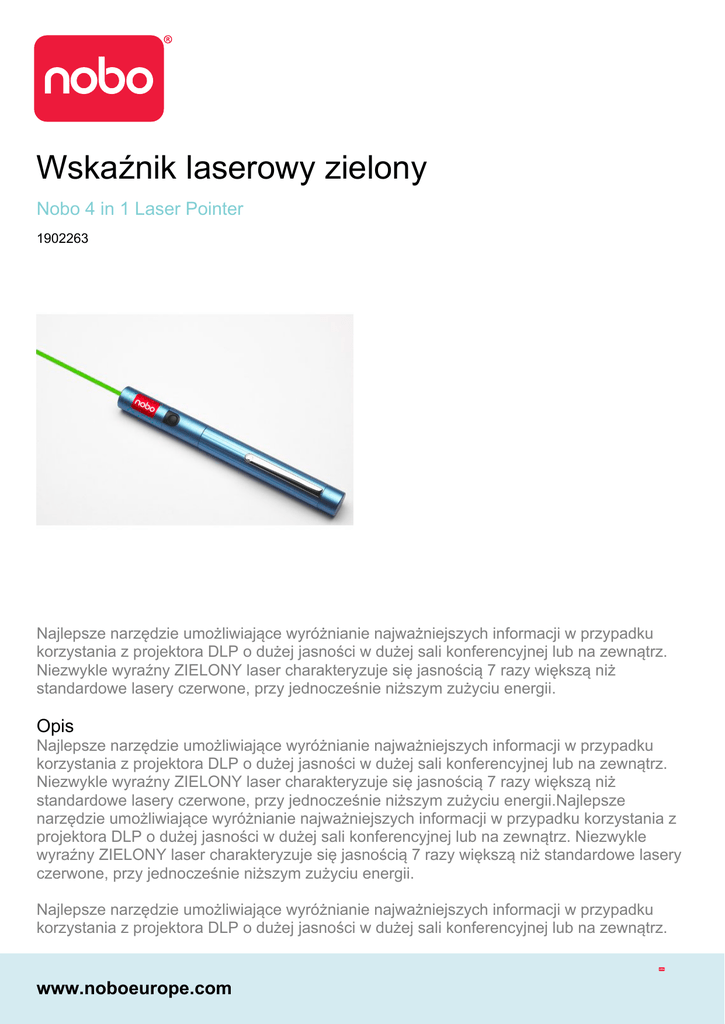 Wskaźnik laserowy zielony Nobo 4 in 1 Laser Pointer 1902263 Najlepsze narzędzie umożliwiające wyróżnianie najważniejszych informacji w przypadku korzystania z projektora DLP o dużej jasności w dużej sali konferencyjnej lub na zewnątrz. Niezwykle wyraźny ZIELONY laser charakteryzuje się jasnością 7 razy większą niż standardowe lasery czerwone, przy jednocześnie niższym zużyciu energii. Opis Najlepsze narzędzie umożliwiające wyróżnianie najważniejszych informacji w przypadku korzystania z projektora DLP o dużej jasności w dużej sali konferencyjnej lub na zewnątrz. Niezwykle wyraźny ZIELONY laser charakteryzuje się jasnością 7 razy większą niż standardowe lasery czerwone, przy jednocześnie niższym zużyciu energii.Najlepsze narzędzie umożliwiające wyróżnianie najważniejszych informacji w przypadku korzystania z projektora DLP o dużej jasności w dużej sali konferencyjnej lub na zewnątrz. Niezwykle wyraźny ZIELONY laser charakteryzuje się jasnością 7 razy większą niż standardowe lasery czerwone, przy jednocześnie niższym zużyciu energii. Najlepsze narzędzie umożliwiające wyróżnianie najważniejszych informacji w przypadku korzystania z projektora DLP o dużej jasności w dużej sali konferencyjnej lub na zewnątrz. www.noboeurope.com Niezwykle wyraźny ZIELONY laser charakteryzuje się jasnością 7 razy większą niż standardowe lasery czerwone, przy jednocześnie niższym zużyciu energii.Najlepsze narzędzie umożliwiające wyróżnianie najważniejszych informacji w przypadku korzystania z projektora DLP o dużej jasności w dużej sali konferencyjnej lub na zewnątrz. Niezwykle wyraźny ZIELONY laser charakteryzuje się jasnością 7 razy większą niż standardowe lasery czerwone, przy jednocześnie niższym zużyciu energii. Unikalne Cechy Produktów • • • • Siedem razy jaśniej! Wytrzymała konstrukcja z anodowanego aluminium. Zasięg lasera: >300 m. Dołączone dwie baterie AAA. www.noboeurope.com