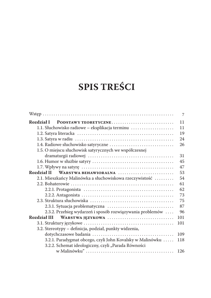 Spis treści Wstęp . . . . . . . . . . . . . . . . . . . . . . . . . . . . . . . . . . . . . . . . . . . . . . . . . . . . . . . . . . . . . 7 Rozdział I Podstawy teoretyczne . . . . . . . . . . . . . . . . . . . . . . . . . . . . 11 1.1. Słuchowisko radiowe – eksplikacja terminu . . . . . . . . . . . . . . . . . . . . . 11 1.2. Satyra literacka . . . . . . . . . . . . . . . . . . . . . . . . . . . . . . . . . . . . . . . . . . . . . . 19 1.3. Satyra w radiu . . . . . . . . . . . . . . . . . . . . . . . . . . . . . . . . . . . . . . . . . . . . . . . 24 1.4. Radiowe słuchowisko satyryczne . . . . . . . . . . . . . . . . . . . . . . . . . . . . . . . 26 1.5. O miejscu słuchowisk satyrycznych we współczesnej dramaturgii radiowej . . . . . . . . . . . . . . . . . . . . . . . . . . . . . . . . . . . . . . . . . 31 1.6. Humor w służbie satyry . . . . . . . . . . . . . . . . . . . . . . . . . . . . . . . . . . . . . . . 45 1.7. Wpływy na satyrę . . . . . . . . . . . . . . . . . . . . . . . . . . . . . . . . . . . . . . . . . . . . 47 Rozdział II Warstwa behawioralna . . . . . . . . . . . . . . . . . . . . . . . . . . 53 2.1. Mieszkańcy Malinówka a słuchowiskowa rzeczywistość . . . . . . . . . . 54 2.2. Bohaterowie . . . . . . . . . . . . . . . . . . . . . . . . . . . . . . . . . . . . . . . . . . . . . . . . . 61 2.2.1. Protagonista . . . . . . . . . . . . . . . . . . . . . . . . . . . . . . . . . . . . . . . . . . . 62 2.2.2. Antagonista . . . . . . . . . . . . . . . . . . . . . . . . . . . . . . . . . . . . . . . . . . . . 73 2.3. Struktura słuchowiska . . . . . . . . . . . . . . . . . . . . . . . . . . . . . . . . . . . . . . . . 75 2.3.1. Sytuacja problematyczna . . . . . . . . . . . . . . . . . . . . . . . . . . . . . . . . 87 2.3.2. Przebieg wydarzeń i sposób rozwiązywania problemów . . . . . 96 Rozdział III Warstwa językowa . . . . . . . . . . . . . . . . . . . . . . . . . . . . . . . 101 3.1. Struktury językowe . . . . . . . . . . . . . . . . . . . . . . . . . . . . . . . . . . . . . . . . . . . 101 3.2. Stereotypy – definicja, podział, punkty widzenia, dotychczasowe badania . . . . . . . . . . . . . . . . . . . . . . . . . . . . . . . . . . . . . . . 109 3.2.1. Paradygmat obcego, czyli John Kovalsky w Malinówku . . . . . 118 3.2.2. Schemat ideologiczny, czyli „Parada Równości w Malinówku” . . . . . . . . . . . . . . . . . . . . . . . . . . . . . . . . . . . . . . . . . . 126 6 Spis treści Rozdział IV Warstwa dźwiękowa . . . . . . . . . . . . . . . . . . . . . . . . . . . . . 134 4.1. Czas i muzyka . . . . . . . . . . . . . . . . . . . . . . . . . . . . . . . . . . . . . . . . . . . . . . . 134 4.2. Przestrzeń . . . . . . . . . . . . . . . . . . . . . . . . . . . . . . . . . . . . . . . . . . . . . . . . . . . 138 4.3. Głos, słowo i gest foniczny . . . . . . . . . . . . . . . . . . . . . . . . . . . . . . . . . . . . 141 4.4. Analiza konwersacyjna jako narzędzie dźwiękowej analizy słuchowisk radiowych . . . . . . . . . . . . . . . . . . . . . . . . . . . . . . . . . . . . . . . . 144 Zakończenie . . . . . . . . . . . . . . . . . . . . . . . . . . . . . . . . . . . . . . . . . . . . . . . . . . . . . . .151 Bibliografia . . . . . . . . . . . . . . . . . . . . . . . . . . . . . . . . . . . . . . . . . . . . . . . . . . . . . . . . 153 Teksty audialne . . . . . . . . . . . . . . . . . . . . . . . . . . . . . . . . . . . . . . . . . . . . . . . . . . 153 Literatura przedmiotu . . . . . . . . . . . . . . . . . . . . . . . . . . . . . . . . . . . . . . . . . . . . 153 Netografia . . . . . . . . . . . . . . . . . . . . . . . . . . . . . . . . . . . . . . . . . . . . . . . . . . . . . . 156 Bezpośrednie źródła . . . . . . . . . . . . . . . . . . . . . . . . . . . . . . . . . . . . . . . . . . . . . 156 Aneksy . . . . . . . . . . . . . . . . . . . . . . . . . . . . . . . . . . . . . . . . . . . . . . . . . . . . . . . . . . . . 157