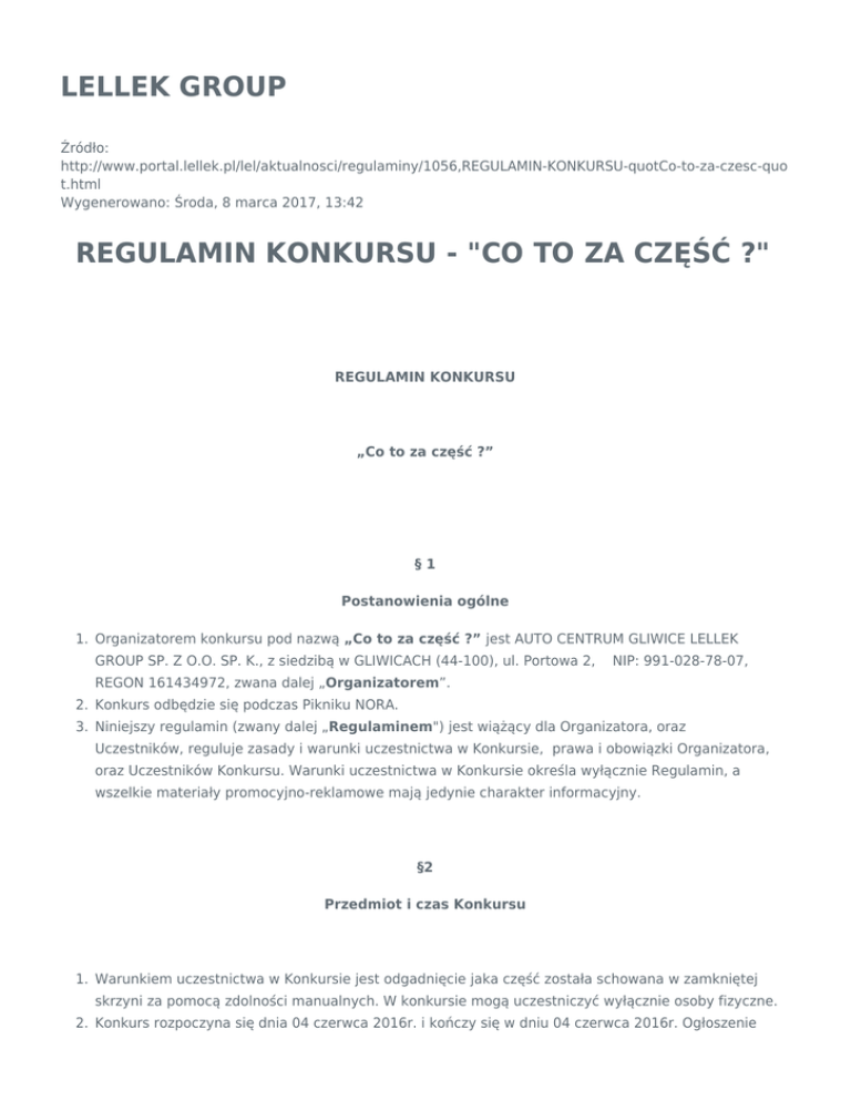 LELLEK GROUP Źródło: http://www.portal.lellek.pl/lel/aktualnosci/regulaminy/1056,REGULAMIN-KONKURSU-quotCo-to-za-czesc-quo t.html Wygenerowano: Środa, 8 marca 2017, 13:42 REGULAMIN KONKURSU - "CO TO ZA CZĘŚĆ ?" REGULAMIN KONKURSU „Co to za część ?” §1 Postanowienia ogólne 1. Organizatorem konkursu pod nazwą „Co to za część ?” jest AUTO CENTRUM GLIWICE LELLEK GROUP SP. Z O.O. SP. K., z siedzibą w GLIWICACH (44-100), ul. Portowa 2, NIP: 991-028-78-07, REGON 161434972, zwana dalej „Organizatorem”. 2. Konkurs odbędzie się podczas Pikniku NORA. 3. Niniejszy regulamin (zwany dalej „Regulaminem") jest wiążący dla Organizatora, oraz Uczestników, reguluje zasady i warunki uczestnictwa w Konkursie, prawa i obowiązki Organizatora, oraz Uczestników Konkursu. Warunki uczestnictwa w Konkursie określa wyłącznie Regulamin, a wszelkie materiały promocyjno-reklamowe mają jedynie charakter informacyjny. §2 Przedmiot i czas Konkursu 1. Warunkiem uczestnictwa w Konkursie jest odgadnięcie jaka część została schowana w zamkniętej skrzyni za pomocą zdolności manualnych. W konkursie mogą uczestniczyć wyłącznie osoby fizyczne. 2. Konkurs rozpoczyna się dnia 04 czerwca 2016r. i kończy się w dniu 04 czerwca 2016r. Ogłoszenie wyników nastąpi 04 czerwca 2016r. §3 Uczestnictwo w Konkursie 1. Uczestnictwo w Konkursie ma charakter dobrowolny. 2. W Konkursie mogą uczestniczyć osoby fizyczne, które najpóźniej w chwili przystąpienia do Konkursu ukończyły 18 lat oraz posiadają pełną zdolność do czynności prawnych. W Konkursie nie mogą uczestniczyć pracownicy Organizatora, członkowie ich organów zarządzających, podmioty i ich pracownicy współpracujący z nimi przy organizowaniu Konkursu, jak również członkowie najbliższych rodzin wymienionych osób, to jest małżonkowie, krewni i powinowaci w linii prostej (np. rodzice, dzieci, dziadkowie, wnuki), ich przysposobieni lub przysposabiający, a także rodzeństwo. 3. W celu wyjaśnienia wątpliwości związanych z udziałem Uczestnika w Konkursie, Organizator może kontaktować się z nim przy wykorzystaniu podanych przez niego danych do kontaktu oraz żądać podania szczegółowych informacji związanych z jego udziałem w Konkursie, w tym złożenia oświadczenia o określonej formie i treści oraz przedstawienia stosownych dokumentów. §4 Przebieg Konkursu oraz nagroda 1. Zwycięzcą Konkursu jest osoba, która spełniła warunki uczestnictwa w Konkursie określone w §2. I podała jaka część znajduje się w zamkniętej skrzyni bazując jedynie na zdolnościach manualnych. 2. Ogłoszenie wyników rywalizacji w ramach Konkursu następuje poprzez bezpośredni kontakt z laureatem. 3. W przypadku gdy uczestnik wytypuje prawidłowo jaka część jest w skrzyni otrzyma litrowe opakowanie oleju o wartości 99 zł. W przypadku jeśli uczestnik źle wytypuje część która znajduje się w skrzyni otrzyma nagrodę pocieszenia o wartości 49,90 zł. 4. Organem decydującym o przyznaniu nagród, o których mowa w pkt. 4.3. jest Komisja Konkursowa, w skład której wejdą osoby wskazane przez Organizatora. 5. Nagrody podlegają zwolnieniu z opodatkowania na podstawie art.21, ust.1, pkt 68a ustawy z dnia 26 lipca 1991 r. o podatku dochodowym od osób fizycznych. §5 Reklamacje 1. Reklamacje dotyczące Konkursu mogą być składane przez Uczestników do dnia 12 czerwca 2016 r. wyłącznie w formie pisemnej listem poleconym na adres AUTO CENTRUM GLIWICE LELLEK GROUP SP. Z O.O. SP.K., ul. Portowa 2, 44-100 Gliwice z dopiskiem „Przeciąganie Auta na Czas”. 2. O zachowaniu terminu, o którym mowa w zdaniu poprzednim, decyduje data wpływu reklamacji do Organizatora. §6 Postanowienia końcowe 1. Organizator nie ponosi żadnej odpowiedzialności w przypadku niemożliwości kontaktu z Uczestnikiem z powodu podania przez niego nieprawdziwych lub błędnych danych. 2. Niniejszy Regulamin jest dostępny do wglądu w biurze Organizatora i na www.lellek.com.pl. Tweetnij