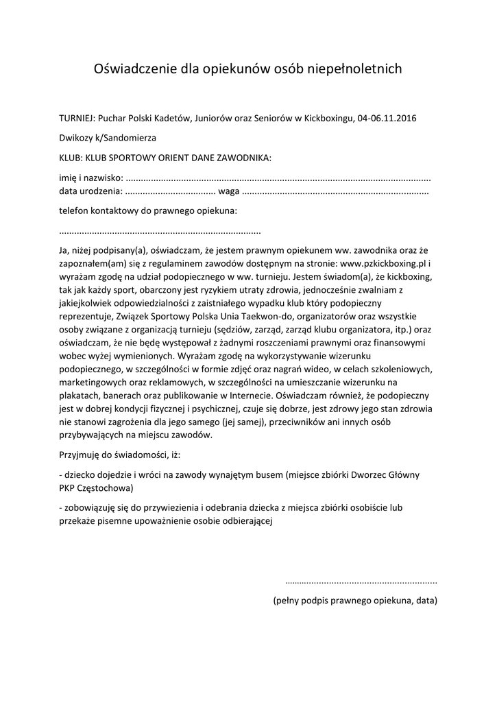 Oświadczenie dla opiekunów osób niepełnoletnich TURNIEJ: Puchar Polski Kadetów, Juniorów oraz Seniorów w Kickboxingu, 04-06.11.2016 Dwikozy k/Sandomierza KLUB: KLUB SPORTOWY ORIENT DANE ZAWODNIKA: imię i nazwisko: ......................................................................................................................... data urodzenia: .................................... waga .......................................................................... telefon kontaktowy do prawnego opiekuna: ................................................................................ Ja, niżej podpisany(a), oświadczam, że jestem prawnym opiekunem ww. zawodnika oraz że zapoznałem(am) się z regulaminem zawodów dostępnym na stronie: www.pzkickboxing.pl i wyrażam zgodę na udział podopiecznego w ww. turnieju. Jestem świadom(a), że kickboxing, tak jak każdy sport, obarczony jest ryzykiem utraty zdrowia, jednocześnie zwalniam z jakiejkolwiek odpowiedzialności z zaistniałego wypadku klub który podopieczny reprezentuje, Związek Sportowy Polska Unia Taekwon-do, organizatorów oraz wszystkie osoby związane z organizacją turnieju (sędziów, zarząd, zarząd klubu organizatora, itp.) oraz oświadczam, że nie będę występował z żadnymi roszczeniami prawnymi oraz finansowymi wobec wyżej wymienionych. Wyrażam zgodę na wykorzystywanie wizerunku podopiecznego, w szczególności w formie zdjęć oraz nagrań wideo, w celach szkoleniowych, marketingowych oraz reklamowych, w szczególności na umieszczanie wizerunku na plakatach, banerach oraz publikowanie w Internecie. Oświadczam również, że podopieczny jest w dobrej kondycji fizycznej i psychicznej, czuje się dobrze, jest zdrowy jego stan zdrowia nie stanowi zagrożenia dla jego samego (jej samej), przeciwników ani innych osób przybywających na miejscu zawodów. Przyjmuję do świadomości, iż: - dziecko dojedzie i wróci na zawody wynajętym busem (miejsce zbiórki Dworzec Główny PKP Częstochowa) - zobowiązuję się do przywiezienia i odebrania dziecka z miejsca zbiórki osobiście lub przekaże pisemne upoważnienie osobie odbierającej ……….................................................... (pełny podpis prawnego opiekuna, data)