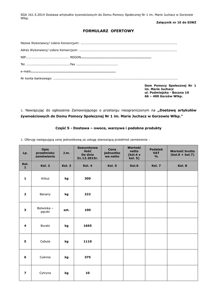 SGA 161.5.2014 Dostawa artykułów żywnościowych do Domu Pomocy Społecznej Nr 1 im. Marie Juchacz w Gorzowie Wlkp. Załącznik nr 1E do SIWZ FORMULARZ OFERTOWY Nazwa Wykonawcy/ Lidera Konsorcjum: ........................................................................................... Adres Wykonawcy/ Lidera Konsorcjum: ............................................................................................ NIP......................................... REGON…………………………………………………………… Tel. .........................................Fax ....................................... e-mail:……………………………………………………………………….. Nr konta bankowego: …................................................................................................................... Dom Pomocy Społecznej Nr 1 im. Marie Juchacz ul. Podmiejska - Boczna 10 66 – 400 Gorzów Wlkp. 1. Nawiązując do ogłoszenia Zamawiającego o przetargu nieograniczonym na ,,Dostawę artykułów żywnościowych do Domu Pomocy Społecznej Nr 1 im. Marie Juchacz w Gorzowie Wlkp.” Część 5 - Dostawa – owoce, warzywa i podobne produkty 1. Oferuję następującą cenę jednostkową za usługę stanowiącą przedmiot zamówienia : Lp. Opis przedmiotu zamówienia J.m. Szacunkowa ilość Do dnia 31.12.2015r. Cena jednostko wa netto Wartość netto (kol.4 x kol. 5) Podatek VAT % Wartość brutto (kol.6 + kol.7) Kol. 1 Kol. 2 Kol. 3 Kol. 4 Kol. 5 Kol.6 Kol. 7 Kol. 8 1 Arbuz kg 300 2 Banany kg 222 3 Botwinka – pęczki szt. 100 4 Buraki kg 1665 5 Cebula kg 1110 6 Cukinia kg 375 7 Cytryna kg 10 SGA 161.5.2014 Dostawa artykułów żywnościowych do Domu Pomocy Społecznej Nr 1 im. Marie Juchacz w Gorzowie Wlkp. 8 Czosnek szt. 259 9 Czosnek szt. 296 10 Dynia kg 150 11 Fasola szparagowa kg 120 12 Jabłka kg 2600 13 Kalarepa kg 30 14 Kapusta biała kg 3700 15 Kapusta czerwona kg 500 16 Kapusta kiszona kg 925 17 Kapusta pekińska kg 925 18 Kapusta włoska kg 925 19 Koper zielony– pęczki pęczki 250 20 Marchew kg 2600 21 Ogórek kiszony kg 278 22 Ogórek małosolny kg 180 23 Ogórki świeże kg 2220 SGA 161.5.2014 Dostawa artykułów żywnościowych do Domu Pomocy Społecznej Nr 1 im. Marie Juchacz w Gorzowie Wlkp. 24 Papryka czerwona kg 222 25 Pieczarki kg 555 26 Pomarańcza kg 50 27 Pomidor kg 2220 28 Por szt. 1665 29 Porzeczka czarna kg 200 30 Porzeczki czerwone kg 200 31 Rabarbar kg 200 32 Rzodkiewka pęczki 300 33 Sałata lodowa szt. 278 34 Sałata masłowa szt. 1500 35 Seler kg 1295 36 Szczypior pęczki 800 37 Szparagi kg 30 38 Śliwki kg 200 39 Truskawki kg 200 SGA 161.5.2014 Dostawa artykułów żywnościowych do Domu Pomocy Społecznej Nr 1 im. Marie Juchacz w Gorzowie Wlkp. 40 Wiśnie kg 200 41 Ziemniaki kg 37000 42 Ziemniaki młode kg 5000 43 Czereśnie kg 100 44 Brzoskwinie kg 100 45 Mandarynki kg 250 46 Nektarynki kg 100 47 WARTOŚĆ OFERTY BRUTTO 2. Gwarantuję świadczenie przedmiotowych dostaw przez czas określony w SIWZ 3. Oświadczam, że spełniam warunki udziału w postępowaniu określone w SIWZ i jej załącznikach. 4. Oświadczam, że akceptuję wymagania określone w SIWZ i jej załącznikach i nie wnoszę do nich uwag. 5. Oświadczam że oferuję przedmiot zamówienia zgodnie z wymaganiami określonymi w SIWZ i jej załącznikach. 6. Oświadczam, że uważam się za związanego niniejszą ofertą na czas wskazany w SIWZ. 7. Oświadczam, że zapoznałem się z załączonymi do SIWZ warunkami umowy i zobowiązuję się w przypadku wyboru mojej oferty, do zawarcia umowy na ustalonych tam warunkach, w miejscu i terminie wyznaczonym przez Zamawiającego. 8. Oświadczam, że złożona oferta uwzględnia wszystkie informacje, które Zamawiający zamieścił na swojej stronie www od dnia ogłoszenia postępowania do dnia otwarcia ofert. 9. Oświadczam, że zobowiązuje się do realizacji przedmiotowych dostaw będących przedmiotem zamówienia w terminie określonym w SIWZ. Miejscowość:....................................., dnia ........................... ......................................................................... pieczęć i podpis osoby uprawnionej/upoważnionej do reprezentowania Wykonawcy SGA 161.5.2014 Dostawa artykułów żywnościowych do Domu Pomocy Społecznej Nr 1 im. Marie Juchacz w Gorzowie Wlkp. UWAGA: 1. Wszystkie pola puste i wykropkowane muszą być wypełnione przez Wykonawcę. 2. Oferta oraz wszystkie dokumenty i oświadczenia do niej załączone, muszą być podpisane przez osobę lub w przypadku Wykonawców występujących wspólnie – przez osoby upoważnione do składania woli w imieniu Wykonawcy – zgodnie z formą reprezentacji określoną we właściwym rejestrze lub wpisie do ewidencji działalności gospodarczej. W przypadku podpisania oferty oraz wszystkich dokumentów i oświadczeń do niej załączonych przez osoby upełnomocnione – musi zostać załączone pisemne upoważnienie lub pełnomocnictwo (w formie oryginału lub kserokopii poświadczonej za zgodność z oryginałem przez notariusza – wyrok SO w Warszawie – SYGN.AKT V CA 85/07), określające zakres czynności, do których jest umocowany;. 3. Wszystkie miejsca, w których Wykonawca naniósł zmiany muszą być parafowane przez osobę podpisującą ofertę. 4. Przy obliczaniu cen należy stosować (zasady zaokrąglenia liczb zgodnie z Polską normą PN-70/N-02120 zaokrąglenia liczb do dwóch miejsc po przecinku na każdym etapie przeliczania. Jeżeli cena jest wynikiem dokonanych wyliczeń to powinna być zaokrąglona do dwóch miejsc po przecinku zgodnie z zasadą: jeżeli trzecia cyfra po przecinku jest równa 5 lub więcej to zaokrąglenie „w górę”, jeżeli trzecia cyfra po przecinku jest mniejsza niż 5 to cena będzie zaokrąglona „w dół”.