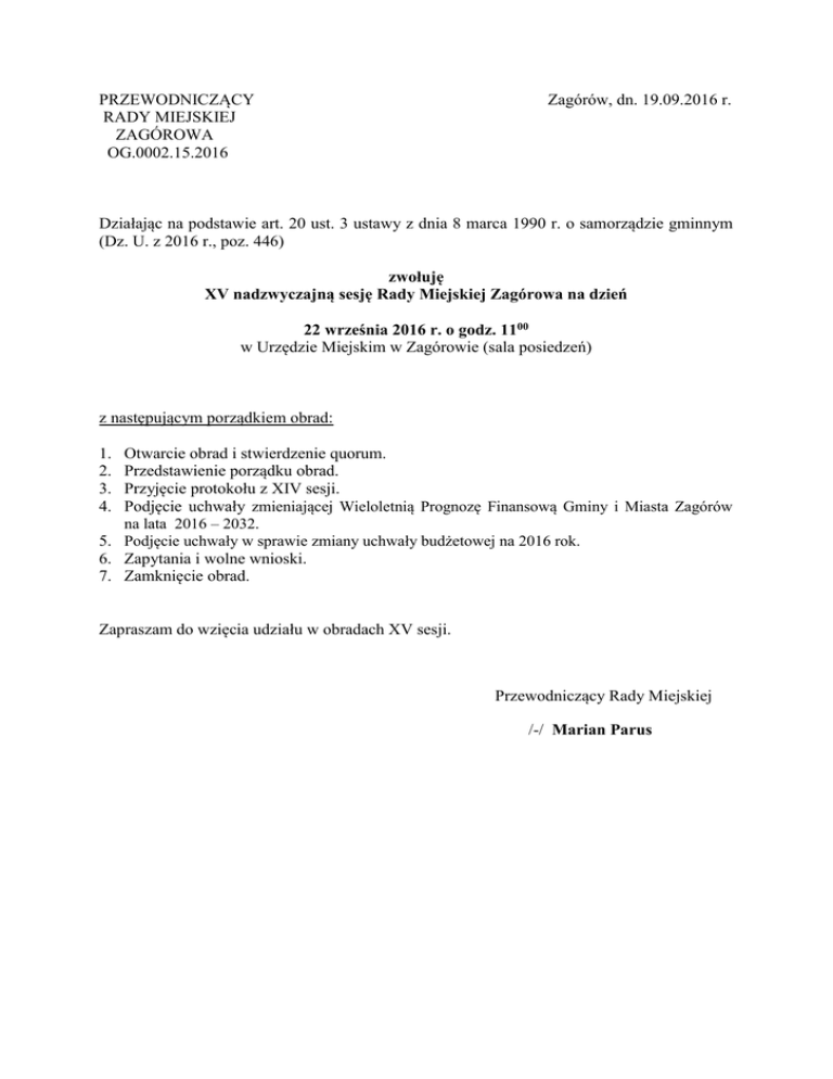 PRZEWODNICZĄCY RADY MIEJSKIEJ ZAGÓROWA OG.0002.15.2016 Zagórów, dn. 19.09.2016 r. Działając na podstawie art. 20 ust. 3 ustawy z dnia 8 marca 1990 r. o samorządzie gminnym (Dz. U. z 2016 r., poz. 446) zwołuję XV nadzwyczajną sesję Rady Miejskiej Zagórowa na dzień 22 września 2016 r. o godz. 1100 w Urzędzie Miejskim w Zagórowie (sala posiedzeń) z następującym porządkiem obrad: 1. 2. 3. 4. Otwarcie obrad i stwierdzenie quorum. Przedstawienie porządku obrad. Przyjęcie protokołu z XIV sesji. Podjęcie uchwały zmieniającej Wieloletnią Prognozę Finansową Gminy i Miasta Zagórów na lata 2016 – 2032. 5. Podjęcie uchwały w sprawie zmiany uchwały budżetowej na 2016 rok. 6. Zapytania i wolne wnioski. 7. Zamknięcie obrad. Zapraszam do wzięcia udziału w obradach XV sesji. Przewodniczący Rady Miejskiej /-/ Marian Parus