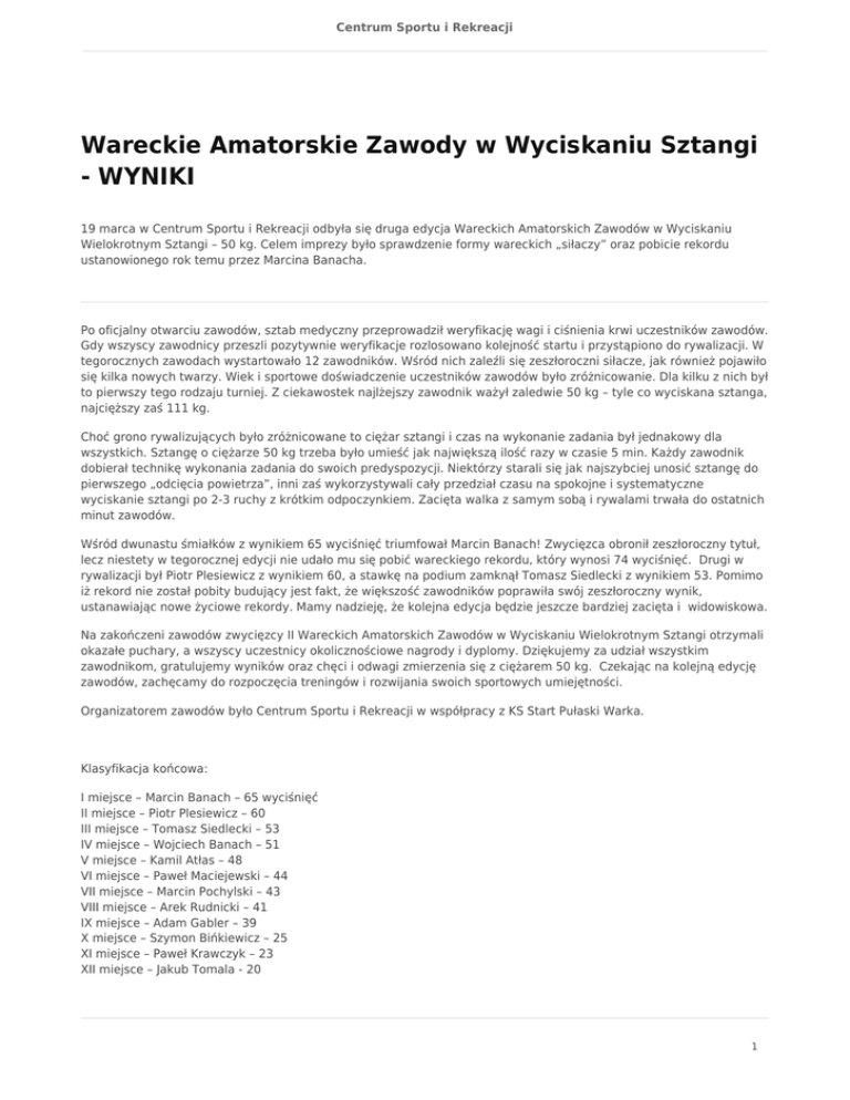 Centrum Sportu i Rekreacji Wareckie Amatorskie Zawody w Wyciskaniu Sztangi - WYNIKI 19 marca w Centrum Sportu i Rekreacji odbyła się druga edycja Wareckich Amatorskich Zawodów w Wyciskaniu Wielokrotnym Sztangi – 50 kg. Celem imprezy było sprawdzenie formy wareckich „siłaczy” oraz pobicie rekordu ustanowionego rok temu przez Marcina Banacha. Po oficjalny otwarciu zawodów, sztab medyczny przeprowadził weryfikację wagi i ciśnienia krwi uczestników zawodów. Gdy wszyscy zawodnicy przeszli pozytywnie weryfikacje rozlosowano kolejność startu i przystąpiono do rywalizacji. W tegorocznych zawodach wystartowało 12 zawodników. Wśród nich zaleźli się zeszłoroczni siłacze, jak również pojawiło się kilka nowych twarzy. Wiek i sportowe doświadczenie uczestników zawodów było zróżnicowanie. Dla kilku z nich był to pierwszy tego rodzaju turniej. Z ciekawostek najlżejszy zawodnik ważył zaledwie 50 kg – tyle co wyciskana sztanga, najcięższy zaś 111 kg. Choć grono rywalizujących było zróżnicowane to ciężar sztangi i czas na wykonanie zadania był jednakowy dla wszystkich. Sztangę o ciężarze 50 kg trzeba było umieść jak największą ilość razy w czasie 5 min. Każdy zawodnik dobierał technikę wykonania zadania do swoich predyspozycji. Niektórzy starali się jak najszybciej unosić sztangę do pierwszego „odcięcia powietrza”, inni zaś wykorzystywali cały przedział czasu na spokojne i systematyczne wyciskanie sztangi po 2-3 ruchy z krótkim odpoczynkiem. Zacięta walka z samym sobą i rywalami trwała do ostatnich minut zawodów. Wśród dwunastu śmiałków z wynikiem 65 wyciśnięć triumfował Marcin Banach! Zwycięzca obronił zeszłoroczny tytuł, lecz niestety w tegorocznej edycji nie udało mu się pobić wareckiego rekordu, który wynosi 74 wyciśnięć. Drugi w rywalizacji był Piotr Plesiewicz z wynikiem 60, a stawkę na podium zamknął Tomasz Siedlecki z wynikiem 53. Pomimo iż rekord nie został pobity budujący jest fakt, że większość zawodników poprawiła swój zeszłoroczny wynik, ustanawiając nowe życiowe rekordy. Mamy nadzieję, że kolejna edycja będzie jeszcze bardziej zacięta i widowiskowa. Na zakończeni zawodów zwycięzcy II Wareckich Amatorskich Zawodów w Wyciskaniu Wielokrotnym Sztangi otrzymali okazałe puchary, a wszyscy uczestnicy okolicznościowe nagrody i dyplomy. Dziękujemy za udział wszystkim zawodnikom, gratulujemy wyników oraz chęci i odwagi zmierzenia się z ciężarem 50 kg. Czekając na kolejną edycję zawodów, zachęcamy do rozpoczęcia treningów i rozwijania swoich sportowych umiejętności. Organizatorem zawodów było Centrum Sportu i Rekreacji w współpracy z KS Start Pułaski Warka. Klasyfikacja końcowa: I miejsce – Marcin Banach – 65 wyciśnięć II miejsce – Piotr Plesiewicz – 60 III miejsce – Tomasz Siedlecki – 53 IV miejsce – Wojciech Banach – 51 V miejsce – Kamil Atłas – 48 VI miejsce – Paweł Maciejewski – 44 VII miejsce – Marcin Pochylski – 43 VIII miejsce – Arek Rudnicki – 41 IX miejsce – Adam Gabler – 39 X miejsce – Szymon Bińkiewicz – 25 XI miejsce – Paweł Krawczyk – 23 XII miejsce – Jakub Tomala - 20 1