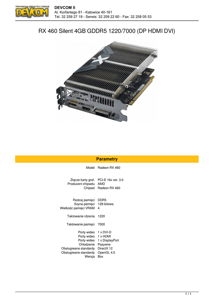 DEVCOM II Al. Korfantego 81 - Katowice 40-161 Tel. 32 259 27 19 - Serwis: 32 259 22 60 - Fax: 32 258 05 53 RX 460 Silent 4GB GDDR5 1220/7000 (DP HDMI DVI) Parametry Model Radeon RX 460 Złącze karty graf. PCI-E 16x ver. 3.0 Producent chipsetu AMD Chipset Radeon RX 460 Rodzaj pamięci DDR5 Szyna pamięci 128-bitowa Wielkość pamięci VRAM 4 Taktowanie rdzenia 1220 Taktowanie pamięci 7000 Porty wideo Porty wideo Porty wideo Chłodzenie Obsługiwane standardy Obsługiwane standardy Wersja 1 x DVI-D 1 x HDMI 1 x DisplayPort Pasywne DirectX 12 OpenGL 4.5 Box 1/1 Powered by TCPDF (www.tcpdf.org)