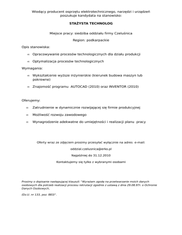 Wiodący producent osprzętu elektrotechnicznego, narzędzi i urządzeń poszukuje kandydata na stanowisko: STAŻYSTA TECHNOLOG Miejsce pracy: siedziba oddziału firmy Czeluśnica Region: podkarpackie Opis stanowiska: • Opracowywanie procesów technologicznych dla działu produkcji • Optymalizacja procesów technologicznych Wymagania: • Wykształcenie wyższe inżynierskie (kierunek budowa maszyn lub pokrewne) • Znajomość programu AUTOCAD (2010) oraz INVENTOR (2010) Oferujemy: • Zatrudnienie w dynamicznie rozwijającej się firmie produkcyjnej • Możliwość rozwoju zawodowego • Wynagrodzenie adekwatne do umiejętności i realizacji planu pracy Oferty wraz ze zdjęciem prosimy przesyłać wyłącznie na adres e-mail: [email protected] Najpóźniej do 31.12.2010 Kontaktujemy się tylko z wybranymi osobami Prosimy o dopisanie następującej klauzuli: "Wyrażam zgodę na przetwarzanie moich danych osobowych dla potrzeb realizacji procesu rekrutacji zgodnie z ustawą z dnia 29.08.97r. o Ochronie Danych Osobowych, (Dz.U. nr 133, poz. 883)".