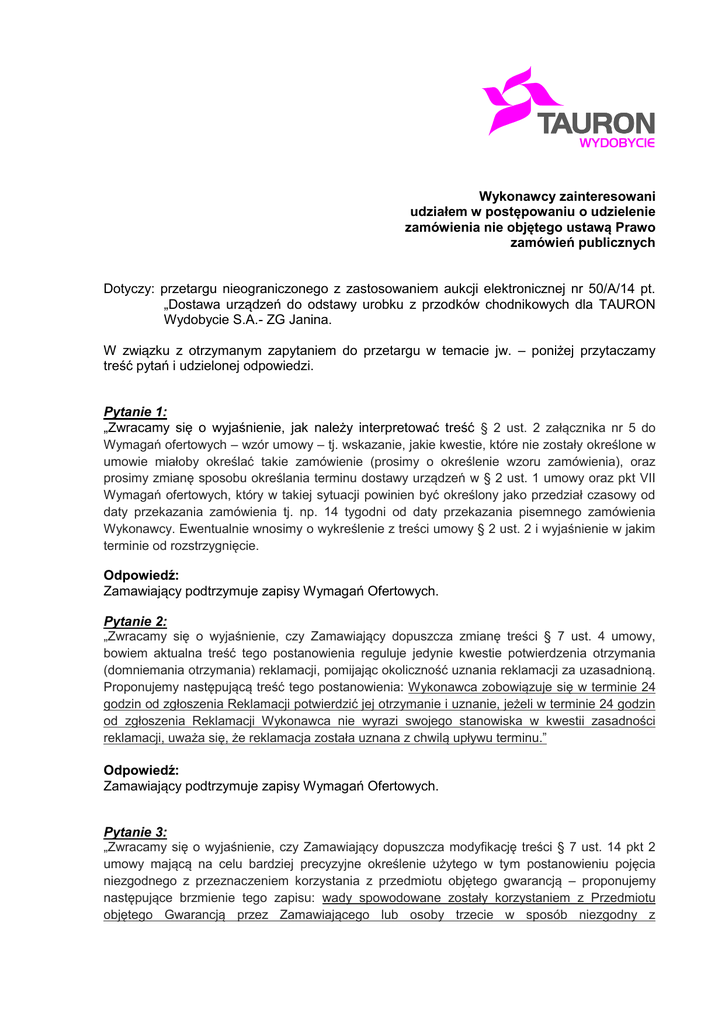 Wykonawcy zainteresowani udziałem w postępowaniu o udzielenie zamówienia nie objętego ustawą Prawo zamówień publicznych Dotyczy: przetargu nieograniczonego z zastosowaniem aukcji elektronicznej nr 50/A/14 pt. „Dostawa urządzeń do odstawy urobku z przodków chodnikowych dla TAURON Wydobycie S.A.- ZG Janina. W związku z otrzymanym zapytaniem do przetargu w temacie jw. – poniżej przytaczamy treść pytań i udzielonej odpowiedzi. Pytanie 1: „Zwracamy się o wyjaśnienie, jak należy interpretować treść § 2 ust. 2 załącznika nr 5 do Wymagań ofertowych – wzór umowy – tj. wskazanie, jakie kwestie, które nie zostały określone w umowie miałoby określać takie zamówienie (prosimy o określenie wzoru zamówienia), oraz prosimy zmianę sposobu określania terminu dostawy urządzeń w § 2 ust. 1 umowy oraz pkt VII Wymagań ofertowych, który w takiej sytuacji powinien być określony jako przedział czasowy od daty przekazania zamówienia tj. np. 14 tygodni od daty przekazania pisemnego zamówienia Wykonawcy. Ewentualnie wnosimy o wykreślenie z treści umowy § 2 ust. 2 i wyjaśnienie w jakim terminie od rozstrzygnięcie. Odpowiedź: Zamawiający podtrzymuje zapisy Wymagań Ofertowych. Pytanie 2: „Zwracamy się o wyjaśnienie, czy Zamawiający dopuszcza zmianę treści § 7 ust. 4 umowy, bowiem aktualna treść tego postanowienia reguluje jedynie kwestie potwierdzenia otrzymania (domniemania otrzymania) reklamacji, pomijając okoliczność uznania reklamacji za uzasadnioną. Proponujemy następującą treść tego postanowienia: Wykonawca zobowiązuje się w terminie 24 godzin od zgłoszenia Reklamacji potwierdzić jej otrzymanie i uznanie, jeżeli w terminie 24 godzin od zgłoszenia Reklamacji Wykonawca nie wyrazi swojego stanowiska w kwestii zasadności reklamacji, uważa się, że reklamacja została uznana z chwilą upływu terminu.” Odpowiedź: Zamawiający podtrzymuje zapisy Wymagań Ofertowych. Pytanie 3: „Zwracamy się o wyjaśnienie, czy Zamawiający dopuszcza modyfikację treści § 7 ust. 14 pkt 2 umowy mającą na celu bardziej precyzyjne określenie użytego w tym postanowieniu pojęcia niezgodnego z przeznaczeniem korzystania z przedmiotu objętego gwarancją – proponujemy następujące brzmienie tego zapisu: wady spowodowane zostały korzystaniem z Przedmiotu objętego Gwarancją przez Zamawiającego lub osoby trzecie w sposób niezgodny z Strona 2 z 2 dokumentacją techniczno – ruchową lub instrukcją obsługi, za które Wykonawcy nie ponosi odpowiedzialności”. Odpowiedź: Zamawiający podtrzymuje zapisy Wymagań Ofertowych. Pytanie 4: „Mając na uwadze, iż na etapie zawarcia umowy Wykonawcy nie przysługują jeszcze żadne prawa z tytułu rękojmi za wady fizyczne sprzętu objętego gwarancją zwracamy się o zmianę treści § 7 ust. 20 umowy na następującą „Wykonawca przeniesie uprawnienia z tytułu rękojmi, które będą przysługiwały Wykonawcy za wady fizyczne Przedmiotu objętego Gwarancją na Zamawiającego, o ile przeniesienie nie będzie sprzeciwiało się postanowieniom umowy pomiędzy Wykonawcą a producentem. Powyższe nie uchybia uprawnieniom z rękojmi przysługującym Zamawiającemu względem Wykonawcy.” Odpowiedź: Zamawiający podtrzymuje zapisy Wymagań Ofertowych Pytanie 5: „Zwracamy się o modyfikację treści § 8 ust. 1 pkt 1 – 3 poprzez zastąpienie każdorazowo występującego w tych postanowieniach słowa „opóźnienia” słowem „zwłoki”. Odpowiedź: Zamawiający podtrzymuje zapisy Wymagań Ofertowych. Pytanie 6: „Zwracamy się o wyjaśnienie czy Zamawiający dopuszcza możliwość modyfikacji treść § 8 ust. 3 w taki sposób aby możliwość dochodzenia odszkodowania uzupełniającego przysługiwało zarówno Zamawiającemu jak i Wykonawcy. Proponujemy następującą treść tego postanowienia: „Żądanie odszkodowania przenoszącego wysokość zastrzeżonej kary umownej jest dopuszczalne, a tym samym każda ze Stron może dochodzić od drugiej Strony odszkodowania uzupełniającego na zasadach ogólnych, przewidzianych w Kodeksie cywilnym do wartości brutto umowy”. Odpowiedź: Zamawiający podtrzymuje zapisy Wymagań Ofertowych. Pytanie 7: „Zwracamy się o wyjaśnienie czy Zamawiający dopuszcza modyfikację § 10 pkt 7 załącznika nr 5 do WO – wzór umowy – w ten sposób, aby oświadczenie o wyrażeniu zgody na publikację, było składane przez obydwie strony umowy, w przypadku, gdy Wykonawcy lub jego podmiot dominujący również jest spółką publiczną”. Odpowiedź: Zamawiający podtrzymuje zapisy Wymagań Ofertowych.