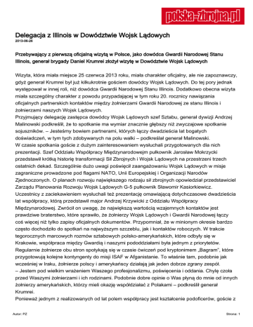 Delegacja z Illinois w Dowództwie Wojsk Lądowych 2013-06-26 Przebywający z pierwszą oficjalną wizytą w Polsce, jako dowódca Gwardii Narodowej Stanu Illinois, generał brygady Daniel Krumrei złożył wizytę w Dowództwie Wojsk Lądowych Wizyta, która miała miejsce 25 czerwca 2013 roku, miała charakter oficjalny, ale nie zapoznawczy, gdyż generał Krumrei był już kilkukrotnie gościem dowódcy Wojsk Lądowych. Do tej pory jednak występował w innej roli, niż dowódca Gwardii Narodowej Stanu Illinois. Dodatkowo obecna wizyta miała szczególny charakter z powodu przypadającej w tym roku 20. rocznicy nawiązania oficjalnych partnerskich kontaktów między żołnierzami Gwardii Narodowej ze stanu Illinois i żołnierzami naszych Wojsk Lądowych. Przyjmujący delegację zastępca dowódcy Wojsk Lądowych szef Sztabu, generał dywizji Andrzej Malinowski podkreślił, że to spotkanie ma wymiar znacznie głębszy niż zwyczajowe spotkanie sojuszników. – Jesteśmy bowiem partnerami, których łączy dwadzieścia lat bogatych doświadczeń, w tym tych zdobywanych na polu walki – podkreślał generał Malinowski. W czasie spotkania goście z dużym zainteresowaniem wysłuchali przygotowanych dla nich prezentacji. Szef Oddziału Współpracy Międzynarodowejm pułkownik Jarosław Mokrzycki przedstawił krótką historię transformacji Sił Zbrojnych i Wojsk Lądowych na przestrzeni trzech ostatnich dekad. Szczególnie dużo uwagi poświęcił zaangażowaniu Wojsk Lądowych w misje zagraniczne prowadzone pod flagami NATO, Unii Europejskiej i Organizacji Narodów Zjednoczonych. O planach rozwoju największego rodzaju sił zbrojnych opowiedział przedstawiciel Zarządu Planowania Rozwoju Wojsk Lądowych G-5 pułkownik Sławomir Kasiorkiewicz. Uczestnicy z zaciekawieniem wysłuchali też prezentację omawiającą dotychczasowe dwadzieścia lat współpracy, którą przedstawił major Andrzej Krzywicki z Oddziału Współpracy Międzynarodowej. Zwrócił on uwagę, że największą wartością wzajemnych kontaktów jest prawdziwe braterstwo, które sprawiło, że żołnierzy Wojsk Lądowych i Gwardii Narodowej łączy coś więcej niż tylko zapisy oficjalnych dokumentów. Przypomniał, że w minionym okresie bardzo często dochodziło do spotkań na najwyższym szczeblu, jak i kontaktów roboczych. W trakcie tegorocznych marcowych rozmów sztabowych polsko-amerykańskich, które odbyły się w Krakowie, współpraca między Gwardią i naszymi pododdziałami była jednym z priorytetów. Regularnie żołnierze obu stron spotykają się w czasie ćwiczeń pod kryptonimem „Bagram”, które przygotowują kolejne kontyngenty do misji ISAF w Afganistanie. To właśnie tam, podobnie jak wcześniej w Iraku, żołnierze polscy i amerykańscy działają jak jeden dobrze zgrany zespół. – Jestem pod wielkim wrażeniem Waszego profesjonalizmu, poświęcenia i oddania. Chylę czoła przed Waszymi żołnierzami i ich rodzinami. Podobnie dobre opinie o Was płyną do mnie od innych żołnierzy amerykańskich, którzy mieli okazję współdziałać z Polakami – podkreślił generał Krumrei. Ponieważ jednym z realizowanych od lat polem współpracy jest kształcenie podoficerów, goście z Autor: PZ Strona: 1 uwagą zapoznali się ze zmianami, jakie zachodzą w strukturze wewnętrznej i procesie kształcenia przedstawicieli tego korpusu osobowego. Prezentujący tę tematykę pomocnik dowódcy ds. podoficerów chorąży Krzysztof Podkuliński zwrócił uwagę na fakt, że wiele z wprowadzanych obecnie w Polsce rozwiązań, nawiązuje do doświadczeń, które przyniosła współpraca z Gwardią Narodową Illinois. W trakcie dyskusji, jaka wywiązała się po zakończeniu prezentacji, jej uczestnicy zwracali uwagę na potrzebę wypracowania nowych form współpracy. – Obie strony muszą liczyć się z ograniczeniami finansowymi, które dotykają nas dzisiaj. Ale jestem przekonany, że nie oznacza to zawężenia naszej współpracy, a jedynie jej przeorientowanie na to, co wydarzy się po zakończeniu misji w Afganistanie – podkreślał generał Krumrei. Z kolei pułkownik Mokrzycki zaproponował, by w czasie rozmowy roboczej postarać się wyspecyfikować listę priorytetów, które w pierwszej kolejności powinny znaleźć się w orbicie zainteresowań obu stron. – Nasze doświadczenia są najcenniejszą wartością dwudziestu lat współpracy. Korzystaliśmy z nich między innymi tworząc naszą ustawę o weteranach. Dlatego jestem przekonany, że właśnie wymiana doświadczeń powinna być tym, na czym skupimy się po zakończeniu misji w Afganistanie. Tym bardziej, że jest to taka forma działalności, która nie powinna generować dużych kosztów – zasygnalizował szef Zarządu Zasobów Osobowych G-1 pułkownik Eugeniusz Szajbel. Miłym akcentem spotkania na warszawskiej Cytadeli była wymiana upominków, której w imieniu dowódcy Wojsk Lądowych dokonał generał dywizji Andrzej Malinowski. Na pamiątkę wizyty generał Krumrei dokonał także wpisu w Księdze Pamiątkowej Dowództwa. *** Współpraca Wojsk Lądowych i Gwardii Narodowej Stanu Illinois została oficjalnie zapoczątkowana 14 lipca 1993 roku. Nasi żołnierze wspólnie działali w Iraku i obecnie w Afganistanie; razem biorą udział w ćwiczeniach pod kryptonimem „Bagram”. Polscy oficerowie i podoficerowie szkolą się na kursach różnego typu organizowanych i prowadzonych przez instruktorów z Illinois. Zaledwie kilka dni temu zakończył się dwutygodniowy pobyt grupy żołnierzy 10 Brygady Kawalerii Pancernej ze Świętoszowa na szkoleniu w Illinois. Źródło: Jacek Matuszak Autor: PZ Strona: 2