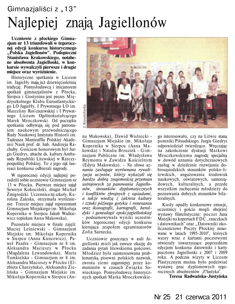 Gimnazjaliści z „13" Najlepiej znają Jagiellonów Uczniowie z płockiego Gimna zjum nr 13 triumfowali w tegorocz nej edycji konkursu historycznego „Polska Jagiellonów". Podopieczni Stanisława Krakowskiego, notabe ne absolwenta Jagiellonki, w kon kursie wywalczyli pierwsze i drugie miejsce oraz wyróżnienie. Historyczne spotkania w Liceum im. Jagiełły mają już dziewięcioletnią tradycję. Pomysłodawcą i inicjatorem spotkań gimnazjalistów z Płocka, Sierpca i Gostynina jest prezes Mię dzyszkolnego Klubu Euroatlantyckiego LO Jagiełły, I Prywatnego LO im. Marceliny Ros'ciszewskiej i I Prywat nego Liceum Ogólnokształcącego Marek Mroczkowski. Od początku spotkania odbywają się pod patrona tem naukowym przewodniczącego Rady Naukowej Instytutu Historii im. Tadeusza Manteuffla Polskiej Akade mii Nauk prof. dr. hab. Andrzeja Ra chuby. Gościem honorowym był Jurgis Giedrys, attache ds. kultury Amba sady Republiki Litewskiej w Rzeczy pospolitej Polskiej. To z jego rąk lau reaci konkursu odbierali nagrody. W tegorocznej edycji najlepiej po radzili sobie uczniowie Gimnazjum nr 13 w Płocku. Pierwsze miejsce zajął Seweryn Kokociński, drugie Michał Żmigrodzki. Uczennica tej szkoły, Ka rolina Zaleska, otrzymała wyróżnie nie. Trzecie miejsce zajął reprezentant Gimnazjum Miejskiego im. Mikołaja Kopernika w Sierpcu Jakub Waśkiewicz (opiekun Anna Makowska). Pozostałe miejsca w finale zajęli: Maciej Leśniewski - Gimnazjum Miejskie im. Mikołaja Kopernika w Sierpcu (Anna Kuncewicz), Pa weł Pazdra - Gimnazjum nr 8 im. Aleksandra Macieszy w Płocku (Magdalena Lewandowska), Marta Tumkielska - Gimnazjum nr 8 im. Aleksandra Macieszy w Płocku (El żbieta Charzyńska), Aleksandra Zie lińska - Gimnazjum Miejskie im. Mikołaja Kopernika w Sierpcu (An na Makowska), Dawid Woźnicki Gimnazjum Miejskie im. Mikołaja Kopernika w Sierpcu (Anna M a kowska) i Natalia Brzuziek - G i m nazjum Publiczne im. Władysława Reymonta w Zawidzu Kościelnym (Edyta Makowska). - Na słowa uz nania zasługuje wyrównana rywali zacja uczniów, którzy wykazali się bardzo dobrą znajomością przemian ustrojowych za panowania Jagiello nów, stosunków dyplomatycznych i konfliktów zbrojnych z sąsiadami, a także wiedzą z zakresu kultury i sztuki późnego gotyku i renesansu oraz ikonografii, kartografii, heral dyki i genealogii epoki jagiellońskiej - podsumowywała wyniki uczestni ków tegorocznej edycji konkursu kierująca zespołem egzaminatorów Zofia Sarnecka. Uczniowie goszczący w auli Ja giellonki mieli jak zawsze okazję do zadania pytań litewskiemu gościowi. Młodzież była zainteresowana prob lematyką pisowni polskich nazwisk, zwrotu ziemi zagarniętej przez ko munistów w czasach Związku So wieckiego. Pomysłodawcę historycz nych spotkań Marka Mroczkowskie go interesowało, czy na Litwie staną pomniki Piłsudskiego. Jurgis Giedrys odpowiedział twierdząco. Wręczając na zakończenie dyskusji Markowi Mroczkowskiemu nagrodę specjalną w dowód uznania dotychczasowych zasług w dziedzinie rozwijania do brosąsiedzkich stosunków polsko-li tewskich, angażowania środowisk naukowych, oświatowych, samorzą dowych, kulturalnych, a przede wszystkim zachęcania młodzieży do poznawania dobrych stosunków bila teralnych. Kiedy opadły konkursowe emocje, uczestnicy i goście mogli obejrzeć wystawy filatelistyczne: poczet Jana Matejki na kopertach F D C , znaczkach i datownikach" oraz „Datowniki oko licznościowe Poczty Płockiej stoso wane w latach 1995-2010", których wzory wraz z kartami pocztowymi otwierały towarzyszące poprzednim edycjom konkursu datowniki i karty pocztowe Jagiellonki z 2007 i 2009 roku. A podczas wizyty w Liceum Plastycznym można było podziwiać wystawę prac dyplomowych tego rocznych absolwentów ,J?lastyka". Teresa Radwańska-Justyńska Nr 25 21 czerwca 2011