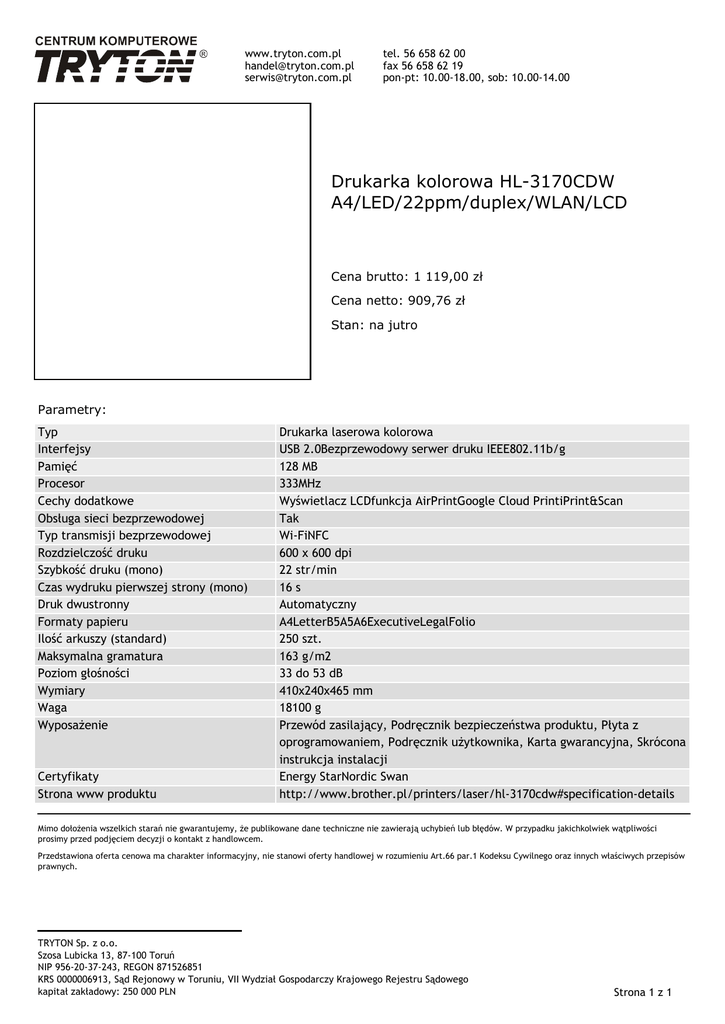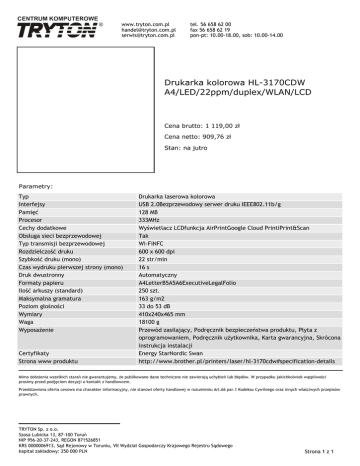 www.tryton.com.pl [email protected] [email protected] tel. 56 658 62 00 fax 56 658 62 19 pon-pt: 10.00-18.00, sob: 10.00-14.00 Drukarka kolorowa HL-3170CDW A4/LED/22ppm/duplex/WLAN/LCD Cena brutto: 1 119,00 zł Cena netto: 909,76 zł Stan: na jutro Parametry: Typ Interfejsy Pamięć Procesor Cechy dodatkowe Obsługa sieci bezprzewodowej Typ transmisji bezprzewodowej Rozdzielczość druku Szybkość druku (mono) Czas wydruku pierwszej strony (mono) Druk dwustronny Formaty papieru Ilość arkuszy (standard) Maksymalna gramatura Poziom głośności Wymiary Waga Wyposażenie Certyfikaty Strona www produktu Drukarka laserowa kolorowa USB 2.0Bezprzewodowy serwer druku IEEE802.11b/g 128 MB 333MHz Wyświetlacz LCDfunkcja AirPrintGoogle Cloud PrintiPrint&Scan Tak Wi-FiNFC 600 x 600 dpi 22 str/min 16 s Automatyczny A4LetterB5A5A6ExecutiveLegalFolio 250 szt. 163 g/m2 33 do 53 dB 410x240x465 mm 18100 g Przewód zasilający, Podręcznik bezpieczeństwa produktu, Płyta z oprogramowaniem, Podręcznik użytkownika, Karta gwarancyjna, Skrócona instrukcja instalacji Energy StarNordic Swan http://www.brother.pl/printers/laser/hl-3170cdw#specification-details Mimo dołożenia wszelkich starań nie gwarantujemy, że publikowane dane techniczne nie zawierają uchybień lub błędów. W przypadku jakichkolwiek wątpliwości prosimy przed podjęciem decyzji o kontakt z handlowcem. Przedstawiona oferta cenowa ma charakter informacyjny, nie stanowi oferty handlowej w rozumieniu Art.66 par.1 Kodeksu Cywilnego oraz innych właściwych przepisów prawnych. TRYTON Sp. z o.o. Szosa Lubicka 13, 87-100 Toruń NIP 956-20-37-243, REGON 871526851 KRS 0000006913, Sąd Rejonowy w Toruniu, VII Wydział Gospodarczy Krajowego Rejestru Sądowego kapitał zakładowy: 250 000 PLN Strona 1 z 1