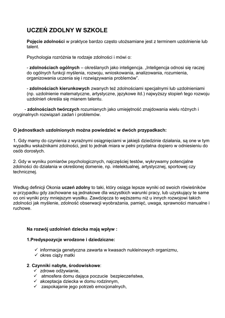 UCZEŃ ZDOLNY W SZKOLE Pojęcie zdolności w praktyce bardzo często utożsamiane jest z terminem uzdolnienie lub talent. Psychologia rozróżnia te rodzaje zdolności i mówi o: - zdolnościach ogólnych – określanych jako inteligencja. „Inteligencja odnosi się raczej do ogólnych funkcji myślenia, rozwoju, wnioskowania, analizowania, rozumienia, organizowania uczenia się i rozwiązywania problemów”. - zdolnościach kierunkowych zwanych też zdolnościami specjalnymi lub uzdolnieniami (np. uzdolnienie matematyczne, artystyczne, językowe itd.) najwyższy stopień tego rozwoju uzdolnień określa się mianem talentu. - zdolnościach twórczych rozumianych jako umiejętność znajdowania wielu różnych i oryginalnych rozwiązań zadań i problemów. O jednostkach uzdolnionych można powiedzieć w dwóch przypadkach: 1. Gdy mamy do czynienia z wyraźnymi osiągnięciami w jakiejś dziedzinie działania, są one w tym wypadku wskaźnikami zdolności, jest to jednak miara w pełni przydatna dopiero w odniesieniu do osób dorosłych. 2. Gdy w wyniku pomiarów psychologicznych, najczęściej testów, wykrywamy potencjalne zdolności do działania w określonej domenie, np. intelektualnej, artystycznej, sportowej czy technicznej. Według definicji Okonia uczeń zdolny to taki, który osiąga lepsze wyniki od swoich rówieśników w przypadku gdy zachowane są jednakowe dla wszystkich warunki pracy, lub uzyskujący te same co oni wyniki przy mniejszym wysiłku. Zawdzięcza to węższemu niż u innych rozwojowi takich zdolności jak myślenie, zdolność obserwacji wyobrażania, pamięć, uwaga, sprawności manualne i ruchowe. Na rozwój uzdolnień dziecka mają wpływ : 1.Predyspozycje wrodzone i dziedziczne: informacja genetyczna zawarta w kwasach nukleinowych organizmu, okres ciąży matki 2. Czynniki nabyte, środowiskowe: zdrowe odżywianie, atmosfera domu dająca poczucie bezpieczeństwa, akceptacja dziecka w domu rodzinnym, zaspokajanie jego potrzeb emocjonalnych, bycie z ludźmi, korygowanie egoizmu, agresji. wsparcie psychiczne w chwilach niepowodzeń, umiejętność relaksu, różnorodne bodźce stymulujące, wrażenia, doświadczenia, wspomaganie przez rodziców rozwoju umysłowego i zainteresowań dziecka, poświęcanie czasu na rozmowy, wspólne zabawy, spacery, hobby, szukanie odpowiedniej literatury. dostrzeganie prac i pomysłów dziecka, wyrażanie akceptacji bądź konstruktywnej krytyki, korzystna stymulacja rozwoju intelektu i zainteresowań atmosfera w szkole otoczenie ucznia zdolnego mądrą opieka pedagogiczną. Uczeń zdolny charakteryzuje się określonymi cechami pozytywnymi: ponadprzeciętny intelekt; szybkie zapamiętywanie, prawidłowe kojarzenie i rozumowanie; dociekliwość, duża liczba pytań; szeroki wachlarz zainteresowań, dużo wiadomości pozaszkolnych; umiejętność skupienia uwagi przez dłuższy czas; bogata wyobraźnia, oryginalne pomysły; potrzeba ukazania swoich myśli, wrażeń, emocji; adekwatne postrzeganie swoich możliwości; samoświadomość; niezależna postawa, umiejętność obrony swojego stanowiska. U uczniów zdolnych zauważa się też cechy utrudniające pełne wykorzystanie potencjału intelektualnego : tendencję do izolowania się. nadmierną koncentrację na sobie, absorbowanie całej uwagi nauczyciela. kwestionowanie zdania nauczyciela, wykłócanie się z nim, upór. kłopoty w przechodzeniu od wiedzy do umiejętności, demonstrowanie wiedzy encyklopedycznej i braki w wiedzy praktycznej. brak wytrwałości w wykonywaniu zadań rutynowych. czasem mniejszą sprawność fizyczną. różne problemy psychologiczne: o chwiejność emocjonalna, nieśmiałość, nadpobudliwość psychoruchową, zachowania agresywne, neurotyzm, introwersję, wrażliwość, niepewność siebie, podatność na działanie stresu, często perfekcjonizm i problemy w radzeniu sobie z porażką. Z powodu bardzo różnych cech osobowości i sposobów funkcjonowania, ucznia zdolnego można zdefiniować w dwóch aspektach: społecznym – uczeń, który się dobrze uczy, ma wzorowe zachowanie i inne osiągnięcia w szkole ( nie zadaje dziwnych pytań, nie kłamie, nie ma dziwnych pomysłów ), grzeczny prymus; psychologicznym – uczeń, który ma wysoki poziom inteligencji, duże osiągnięcia, wysoki poziom twórczy – czyli charakteryzuje go niepokój poznawczy, umie oderwać się od utartych schematów, potrafi znaleźć się w nowej sytuacji, ma pomysły nowych rozwiązań starych problemów, nie boi się nowych rzeczy. Opieka nad uczniem zdolnym powinna obejmować dwa zasadnicze obszary: sfera intelektualna – działania nauczycieli, instruktorów, trenerów według przyjętego dla każdego ucznia programu; rola szkoły to tworzenie kół zainteresowań oraz organizacyjne umożliwienie indywidualnego toku nauki lub korzystania z zajęć akademickich; sfera emocjonalno - społeczna – działanie psychologów i pedagogów poprzez kształcenie w uczniach umiejętności radzenia sobie z negatywnymi emocjami lub cechami własnej osobowości poprzez odpowiednie działania terapeutyczne, rozwijanie inteligencji emocjonalnej, stymulowanie motywacji, wspieranie. Syndrom Nieadekwatnych Osiągnięć Szkolnych to problem negatywnej sytuacji szkolnej dziecka, w której nie wykorzystuje ono swoich możliwości związanych z potencjałem intelektualnym i twórczym- dotyczy ono blisko 10- 15% populacji dzieci i młodzieży. Jest to niewykorzystywanie możliwości przejawiających się w dużej rozbieżności pomiędzy ocenami i zachowaniami szkolnymi dziecka a jego wysokim potencjałem, takim jak: inteligencja czy twórczość, mierzonym za pomocą wystandaryzowanych testów, opinii nauczyciela i rodziców. Przyczyny niechęci ucznia zdolnego do nauki szkolnej: 1.Warunki opieki nad dzieckiem i nauką dziecka: zapracowani rodzice, niezorganizowany czas wolny dziecka, brak wyrobienia w dziecku nawyków uczenia się, brak ze strony rodziców współpracy i zainter