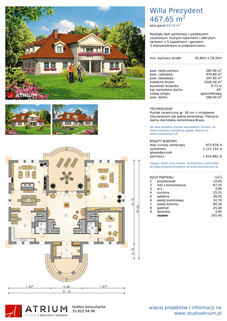 Willa Prezydent 467,65 m2 plus garaż 84.55 m2 Rozległy dom parterowy z poddaszem użytkowym, licznymi lukarnami i odkrytym tarasem, z 5 sypialniami i garażem 3-stanowiskowym w podpiwniczeniu min. wymiary działki pow. netto parteru pow. całkowita pow. zabudowy kubatura brutto wysokość budynku kąt nachylenia dachu rodzaj stropu pow. dachu 35,90m x 29,33m 282.90 m2 970,60 m2 347,95 m2 3206,30 m3 9.73 m 45° gęstożebrowy 566.00 m2 TECHNOLOGIA Pustak ceramiczny gr. 30 cm + ocieplenie (styropianem lub wełną mineralną). Pokrycie dachu dachówką cementową Braas. Do tego projektu możesz wprowadzić zmiany, na które wyrazimy bezpłatną zgodę. Więcej na www.studioatrium.pl KOSZTY BUDOWY stan surowy zamknięty systemem gospodarczym pod klucz 973 878 zł 1 121 155 zł 1 624 862 zł Uwaga! Dane szacunkowe. Zestawienie materiałów do tego projektu dostępne na www.studioatrium.pl RZUT PARTERU 1 przedsionek 2 hall z komunikacją 3 w.c. 4 kuchnia 5 jadalnia 6 pokój kominkowy 7 pokój dzienny 8 gabinet 9 łazienka razem telefon konsultanta 33 822 94 96 [m2] 10,45 67,25 3,95 25,25 26,55 32,70 60,35 25,00 3,95 255,45 więcej projektów i informacji na www.studioatrium.pl RZUT PIWNICY 1 piwnica 2 spiżarnia 3 kotłownia 4 łącznik 5 piwnica 6 sala ćwiczeń 7 łazienka 8 sauna 9 garaż 10 zaplecze garażu razem telefon konsultanta 33 822 94 96 [m2] 46,45 28,05 14,30 5,80 37,80 31,85 4,35 8,25 60,00 24,55 261,40 więcej projektów i informacji na www.studioatrium.pl RZUT PODDASZA 1 hall z komunikacją 2 pokój 3 łazienka 4 garderoba 5 pokój 6 pokój 7 pokój 8 pokój 9 pokój 10 garderoba 11 łazienka razem telefon konsultanta 33 822 94 96 Powered by TCPDF (www.tcpdf.org) [m2] 34,75 21,25 10,75 9,35 22,55 23,20 22,30 26,95 21,00 9,35 10,75 212,20 więcej projektów i informacji na www.studioatrium.pl