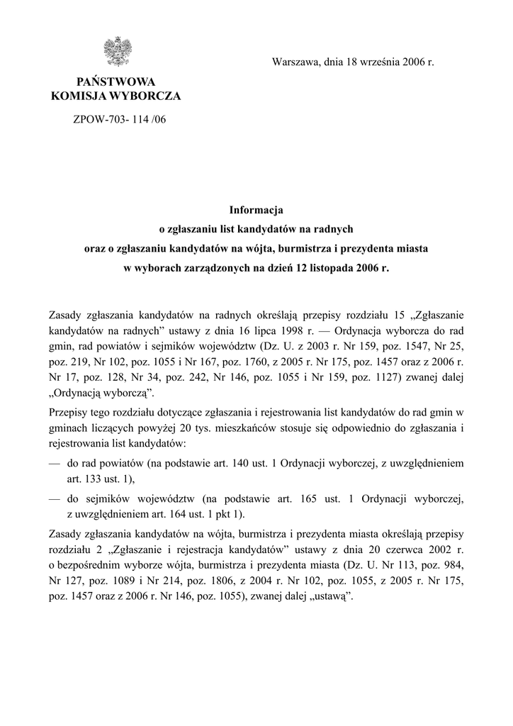 Warszawa, dnia 18 września 2006 r. PAŃSTWOWA KOMISJA WYBORCZA ZPOW-703- 114 /06 Informacja o zgłaszaniu list kandydatów na radnych oraz o zgłaszaniu kandydatów na wójta, burmistrza i prezydenta miasta w wyborach zarządzonych na dzień 12 listopada 2006 r. Zasady zgłaszania kandydatów na radnych określają przepisy rozdziału 15 „Zgłaszanie kandydatów na radnych” ustawy z dnia 16 lipca 1998 r. — Ordynacja wyborcza do rad gmin, rad powiatów i sejmików województw (Dz. U. z 2003 r. Nr 159, poz. 1547, Nr 25, poz. 219, Nr 102, poz. 1055 i Nr 167, poz. 1760, z 2005 r. Nr 175, poz. 1457 oraz z 2006 r. Nr 17, poz. 128, Nr 34, poz. 242, Nr 146, poz. 1055 i Nr 159, poz. 1127) zwanej dalej „Ordynacją wyborczą”. Przepisy tego rozdziału dotyczące zgłaszania i rejestrowania list kandydatów do rad gmin w gminach liczących powyżej 20 tys. mieszkańców stosuje się odpowiednio do zgłaszania i rejestrowania list kandydatów: — do rad powiatów (na podstawie art. 140 ust. 1 Ordynacji wyborczej, z uwzględnieniem art. 133 ust. 1), — do sejmików województw (na podstawie art. 165 ust. 1 Ordynacji wyborczej, z uwzględnieniem art. 164 ust. 1 pkt 1). Zasady zgłaszania kandydatów na wójta, burmistrza i prezydenta miasta określają przepisy rozdziału 2 „Zgłaszanie i rejestracja kandydatów” ustawy z dnia 20 czerwca 2002 r. o bezpośrednim wyborze wójta, burmistrza i prezydenta miasta (Dz. U. Nr 113, poz. 984, Nr 127, poz. 1089 i Nr 214, poz. 1806, z 2004 r. Nr 102, poz. 1055, z 2005 r. Nr 175, poz. 1457 oraz z 2006 r. Nr 146, poz. 1055), zwanej dalej „ustawą”. -2I. 1. Zgłaszanie list kandydatów na radnych 1) Prawo zgłaszania list kandydatów na radnych w wyborach do rad gmin, rad miejskich, rad dzielnic m. st. Warszawy, rad powiatów i sejmików województw przysługuje komitetom wyborczym, które otrzymały odpowiednio od Państwowej Komisji Wyborczej lub od właściwego komisarza wyborczego postanowienie o przyjęciu zawiadomienia o utworzeniu komitetu wyborczego i zamiarze zgłaszania kandydatów na radnych (art. 95 ust. 1 i art. 99 ust. 4 Ordynacji wyborczej). 2) Kandydaci na radnych zgłaszani są w formie list kandydatów na radnych, odrębnie dla każdego z okręgów wyborczych, do właściwych terytorialnych komisji wyborczych; za listę kandydatów uważa się także zgłoszenie jednego kandydata w okręgu wyborczym w gminie liczącej do 20 tys. mieszkańców (art. 95 ust. 2 Ordynacji wyborczej). Komitet wyborczy może zgłosić w okręgu tylko jedną listę kandydatów (art. 98 ust. 1 Ordynacji wyborczej). W przypadku utworzenia koalicji wyborczej i powołania koalicyjnego komitetu wyborczego w celu zgłoszenia wspólnych list kandydatów do danej rady lub sejmiku województwa komitet wyborczy partii politycznej wchodzącej w skład koalicji nie może samodzielnie, albo w innej koalicji wyborczej zgłaszać list kandydatów na radnych, jeżeli w okręgu wyborczym została zgłoszona wspólna lista kandydatów (art. 95 ust. 3 Ordynacji wyborczej). 3) Listy kandydatów na radnych zgłasza się do właściwej terytorialnej komisji wyborczej najpóźniej w 30 dniu przed dniem wyborów, tj. do 13 października 2006 r. do godz. 24.00 (art. 101 ust. 1 Ordynacji wyborczej). Po dniu 13 października 2006 r., zgłoszenie listy kandydatów na radnych jest możliwe wyłącznie w sytuacji przewidzianej w art. 108 Ordynacji wyborczej, czyli wówczas gdy w terminie przewidzianym dla zgłoszenia list kandydatów w okręgu wyborczym nie zostaną zgłoszone co najmniej dwie listy kandydatów, a liczba zgłoszonych kandydatów jest równa liczbie radnych wybieranych w okręgu lub mniejsza. Terytorialna komisja wyborcza wzywa wówczas komitety wyborcze, poprzez rozplakatowanie obwieszczeń, do dokonania dodatkowych zgłoszeń list kandydatów w terminie 5 dni od dnia ich rozplakatowania. Pełnomocnik komitetu wyborczego lub osoba upoważniona, która dokonała zgłoszenia listy kandydatów na radnych może do 10. dnia przed dniem wyborów zgłosić nowego kandydata na radnego, jeżeli komisja wyborcza zawiadomi pełnomocnika, iż skreśliła z zarejestrowanej listy komitetu kandydata, który zmarł -3(pod warunkiem, że śmierć kandydata spowodowała, że liczba kandydatów w okręgu wyborczym jest równa liczbie radnych wybieranych w tym okręgu lub mniejsza od niej). Zgłoszenie nowego kandydata nie wymaga poparcia podpisami wyborców (art. 110 ust. 2 Ordynacji wyborczej). Terytorialną komisją wyborczą jest: a) gminna, miejska, dzielnicowa komisja wyborcza — właściwa do przyjęcia zgłoszeń i rejestracji list kandydatów na radnych w wyborach odpowiednio do rady gminy, rady miejskiej, rady miasta na prawach powiatu, Rady m. st. Warszawy, rady dzielnicy m. st. Warszawy, b) powiatowa komisja wyborcza — właściwa do przyjęcia zgłoszeń i rejestracji list kandydatów na radnych do rady powiatu, c) wojewódzka komisja wyborcza — właściwa do przyjęcia zgłoszeń i rejestracji list kandydatów na radnych do sejmiku województwa. Nadzór nad przestrzeganiem prawa przez terytorialne komisje wyborcze sprawuje właściwy komisarz wyborczy (art. 12 ust. 1 pkt 1, 4 i 7 oraz ust. 2 Ordynacji wyborczej), który rozpatruje skargi na działalność terytorialnych komisji wyborczych i udziela komisjom wyjaśnień. 4) Lista kandydatów na radnych zgłaszana w okręgu wyborczym w wyborach do: a) rady gminy (miejskiej) w gminie (mieście) liczącej do 20 tys. mieszkańców musi zawierać co najmniej 1 kandydata, a najwyżej tylu kandydatów, ilu radnych wybieranych jest w danym okręgu wyborczym (art. 98 ust. 2 pkt 1 Ordynacji wyborczej), b) rady gminy (miejskiej) w gminie (mieście) liczącej powyżej 20 tys. mieszkańców, rady miasta na prawach powiatu, Rady m. st. Warszawy, rady dzielnicy m. st. Warszawy, nie może zawierać mniej niż 5 kandydatów, z tym że liczba kandydatów nie może być większa niż dwukrotność liczby radnych wybieranych w danym okr