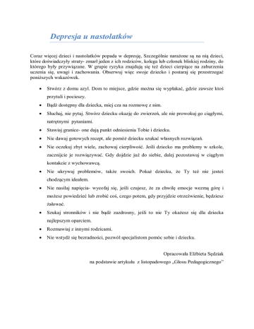 Depresja u nastolatków Coraz więcej dzieci i nastolatków popada w depresję, Szczególnie narażone są na nią dzieci, które doświadczyły straty- zmarł jeden z ich rodziców, kolega lub członek bliskiej rodziny, do którego były przywiązane. W grupie ryzyka znajdują się też dzieci cierpiące na zaburzenia uczenia się, uwagi i zachowania. Obserwuj więc swoje dziecko i postaraj się przestrzegać poniższych wskazówek. Stwórz z domu azyl. Dom to miejsce, gdzie można się wypłakać, gdzie zawsze ktoś przytuli i pocieszy. Bądź dostępny dla dziecka, miej cza na rozmowę z nim. Słuchaj, nie pytaj. Stwórz dziecku okazję do zwierzeń, ale nie prowokuj go ciągłymi, natrętnymi pytaniami. Stawiaj granice- one dają punkt odniesienia Tobie i dziecku. Nie dawaj gotowych recept, ale pomóż dziecku szukać własnych rozwiązań. Nie oczekuj zbyt wiele, zachowaj cierpliwość. Jeśli dziecko ma problemy w szkole, zacznijcie je rozwiązywać. Gdy dojdzie już do siebie, dalej pozostawaj w ciągłym kontakcie z wychowawcą. Nie ukrywaj problemów, także swoich. Pokaż dziecku, że Ty też nie jesteś chodzącym ideałem. Nie nasilaj napięcia- wycofaj się, jeśli czujesz, że za chwilę emocje wezmą górę i możesz powiedzieć lub zrobić coś, czego potem, gdy przyjdzie otrzeźwienie, będziesz żałować. Szukaj stronników i nie bądź zazdrosny, jeśli to nie Ty okażesz się dla dziecka najlepszym oparciem. Rozmawiaj z innymi rodzicami. Nie wstydź się bezradności, pozwól specjalistom pomóc sobie i dziecku. Opracowała Elżbieta Sędziak na podstawie artykułu z listopadowego „Głosu Pedagogicznego”