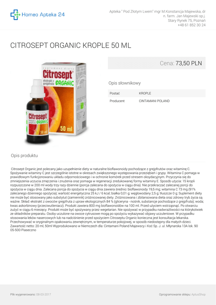 Apteka " Pod Złotym Lwem" mgr M.Konstancja Majewska, dr n. farm. Jan Majewski sp.j. Stary Rynek 75, Poznań +48 61 852 30 24 CITROSEPT ORGANIC KROPLE 50 ML Cena: 73,50 PLN Opis słownikowy Postać KROPLE Producent CINTAMANI POLAND Opis produktu Citrosept Organic jest polecany jako uzupełnienie diety w naturalne bioflawonoidy pochodzące z grejpfrutów oraz witaminę C. Spożywanie witaminy C jest szczególnie istotne w okresach zwiększonego występowania przeziębień i grypy. Witamina C pomaga w prawidłowym funkcjonowaniu układu odpornościowego i w ochronie komórek przed stresem oksydacyjnym. Przyczynia się do zmniejszenia uczucia zmęczenia i znużenia oraz pomaga w regeneracji zredukowanej formy witaminy E. Sposób użycia: 15 kropli rozpuszczone w 200 ml wody trzy razy dziennie (porcja zalecana do spożycia w ciągu dnia). Nie przekraczać zalecanej porcji do spożycia w ciągu dnia. Zalecana porcja do spożycia w ciągu dnia zawiera średnio: bioflawonoidy 19,5 mg; witamina C 73 mg (91% zalecanego dziennego spożycia); wartość energetyczna 25 kJ / 6 kcal; białka 0,01 g; węglowodany 2,5 g; tłuszcze 0 g; Suplement diety nie może być stosowany jako substytut (zamiennik) zróżnicowanej diety. Zróżnicowana i zbilansowana dieta oraz zdrowy tryb życia są ważne. Skład: ekstrakt z owoców grejpfruta z upraw ekologicznych 84 % (gliceryna - nośnik, substancje pochodzące z grejpfruta); woda; kwas askorbinowy (przeciwutleniacz). Produkt zawiera 800 mg bioflawonoidów na 100 ml. Przed użyciem wstrząsnąć. Po otwarciu zużyć w ciągu 6 miesięcy. Produkt może być spożywany przez wegetarian. Nie spożywać w przypadku nadwrażliwości na którykolwiek ze składników preparatu. Osoby uczulone na owoce cytrusowe mogą po spożyciu wykazywać objawy uczuleniowe. W przypadku stosowania leków nasercowych lub na nadciśnienie przed spożyciem Citroseptu Organic konieczna jest konsultacja lekarska. Przechowywać w oryginalnym opakowaniu zewnętrznym, w temperaturze pokojowej, w sposób niedostępny dla małych dzieci. Zawartość netto: 20 ml, 50ml Wyprodukowano w Niemczech dla: Cintamani Poland Majewscy i Koć Sp. J. ul. Młynarska 13A lok. 90 05-500 Piaseczno Plik wygenerowano: 08-03-2017 Powered by TCPDF (www.tcpdf.org) Oprogramowanie sklepu: AptusShop