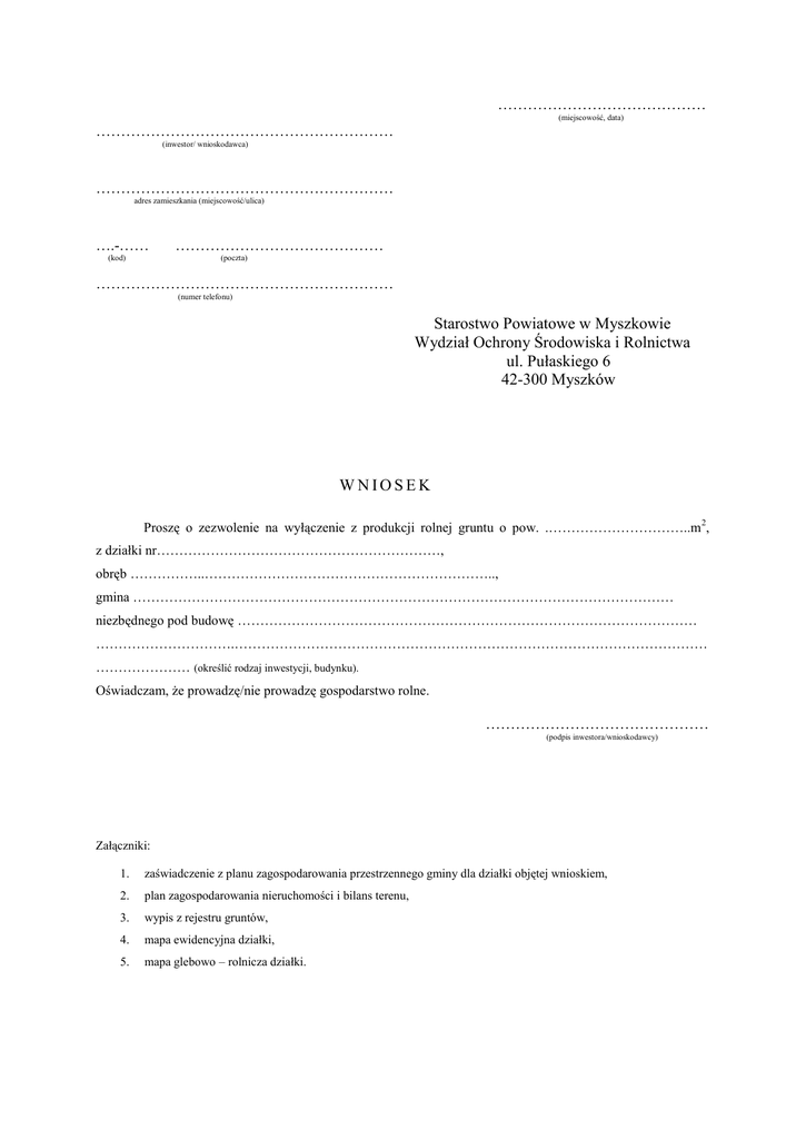 …………………………………… (miejscowość, data) …………………………………………………… (inwestor/ wnioskodawca) …………………………………………………… adres zamieszkania (miejscowość/ulica) ….-…… (kod) …………………………………… (poczta) …………………………………………………… (numer telefonu) Starostwo Powiatowe w Myszkowie Wydział Ochrony Środowiska i Rolnictwa ul. Pułaskiego 6 42-300 Myszków WNIOSEK Proszę o zezwolenie na wyłączenie z produkcji rolnej gruntu o pow. .…………………………..m 2, z działki nr………………………………………………………, obręb ……………..……………………………………………………….., gmina ………………………………………………………………………………………………………… niezbędnego pod budowę ………………………………………………………………………………………… ………………………….…………………………………………………………………………………………… ………………… (określić rodzaj inwestycji, budynku). Oświadczam, że prowadzę/nie prowadzę gospodarstwo rolne. ……………………………………… (podpis inwestora/wnioskodawcy) Załączniki: 1. zaświadczenie z planu zagospodarowania przestrzennego gminy dla działki objętej wnioskiem, 2. plan zagospodarowania nieruchomości i bilans terenu, 3. wypis z rejestru gruntów, 4. mapa ewidencyjna działki, 5. mapa glebowo – rolnicza działki.