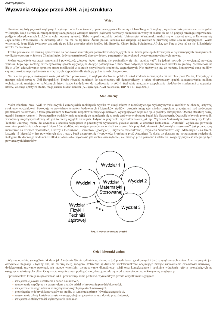 Andrzej Jajszczyk Wyzwania stojące przed AGH, a jej struktura Wstęp Ukazanie się listy pięciuset najlepszych wyższych uczelni w świecie, opracowanej przez Uniwersytet Jiao Tong w Szanghaju, wywołało duże poruszenie, szczególnie w Europie. Rząd niemiecki, zaniepokojony słabą pozycją własnych uczelni (najwyżej notowany niemiecki uniwersytet znalazł się na 48 pozycji rankingu) zapowiedział podjęcie zdecydowanych kroków w celu poprawy sytuacji. Słabo wypadły uczelnie polskie. Uniwersytet Warszawski znalazł się w trzeciej setce, a Uniwersytety Jagielloński i Wrocławski - w czwartej. AGH nie ma na tej liście. Żadna polska uczelnia nie znajduje się również w pierwszej setce uczelni europejskich. Warto wspomnieć, że na liście światowej znalazło się po kilka uczelni z takich krajów, jak: Brazylia, Chiny, Indie, Południowa Afryka, czy Turcja. Jest też na niej kilkadziesiąt uczelni technicznych. Trzeba podkreślić, że ranking opracowano na podstawie mierzalnych parametrów obejmujących m.in.: liczbę prac opublikowanych w najważniejszych czasopismach, czy liczbę cytowań w Science Citation Index. Jedyna uznaniowość dotyczy doboru parametrów branych pod uwagę oraz przypisanych im wag. Można oczywiście wzruszyć ramionami i powiedzieć: „jeszcze jeden ranking, nie powinniśmy się nim przejmować”. Są jednak powody by wyciągnąć poważne wnioski. Tego typu rankingi w zdecydowany sposób wpływają na decyzje potencjalnych studentów dotyczące wyboru przez nich uczelni za granicą. Nieobecność na liście „500” zdecydowanie ogranicza nasze możliwości w zakresie pozyskiwania studentów zagranicznych. Nie łudźmy się też, że możemy konkurować ceną studiów, czy możliwościami pozyskiwania zewnętrznych stypendiów dla studiujących u nas obcokrajowców. Nasza niska pozycja rankingowa może już wkrótce powodować, że najlepsi absolwenci polskich szkół średnich zaczną wybierać uczelnie poza Polską, korzystając z naszego członkostwa w Unii Europejskiej. Trzeba również pamiętać, że nadchodzący niż demograficzny, a także obserwowany spadek zainteresowania studiami technicznymi, zmniejszy w najbliższych latach liczbę kandydatów do studiowania w AGH. Stąd takie znaczenie uzupełniania niedoborów studentami z zagranicy, którzy, wnosząc opłaty za studia, mogą zasilać budżet uczelni (A. Jajszczyk, AGH na szóstkę, BIP nr 117, maj 2003). Stan obecny Moim zdaniem, brak AGH w światowych i europejskich rankingach wynika w dużej mierze z nieefektywnego wykorzystywania zasobów w obecnej sztywnej strukturze wydziałowej. Powoduje to powielanie tematów badawczych i kierunków studiów, utrudnia integrację między zespołami pracującymi nad podobnymi problemami naukowymi, a także przeszkadza w tworzeniu zespołów interdyscyplinarnych, występujących wspólnie np. o projekty europejskie. Obecną strukturę naszej uczelni ilustruje rysunek 1. Poszczególne wydziały mają tendencję do zamykania się w sobie zarówno w obszarze badań jak i kształcenia. Oczywiście bywają przypadki współpracy międzywydziałowej, ale jest to raczej wyjątek niż reguła. Jedynie w przypadku wydziałów takich, jak np.: Wydziału Matematyki Stosowanej czy Fizyki i Techniki Jądrowej mamy do czynienia z szeroką współpracą z pozostałymi wydziałami, głównie zresztą w obszarze kształcenia. „Autarkia” wydziałów powoduje rozrzutne powielanie tych samych kierunków studiów, nie mające precedensu w skali światowej. Na przykład, kierunek „Informatyka stosowana” jest prowadzony niezależnie na czterech wydziałach, a każdy z kierunków: „Górnictwo i geologia”, „Inżynieria materiałowa”, „Inżynieria Środowiska”, czy „Metalurgia” - na trzech. Łącznie 13 kierunków jest powielanych dwu-, trzy-, bądź czterokrotnie (wypowiedź Prorektora prof. Antoniego Tajdusia wygłoszona na poszerzonym posiedzeniu Kolegium Rektorskiego w dniu 9.01.2004.) Łatwo sobie wyobrazić jak wielkie oszczędności, nie mówiąc już o poziomie kształcenia, mogłaby przynieść integracja tych powtarzanych kierunków. Rys. 1. Obecna struktura uczelni Cele i kierunki zmian Wyższa uczelnia, szczególnie tak duża jak Akademia Górniczo-Hutnicza, nie może być przedmiotem gwałtownych i bardzo ryzykownych zmian. Alternatywą nie jest oczywiście stagnacja - byłaby ona, na dłuższą metę, zabójcza. Potrzebne są działania wielokierunkowe obejmujące bieżące usprawnienia działalności naukowej i dydaktycznej, usuwanie patologii, ale przede wszystkim wypracowanie długofalowej wizji oraz konsekwentne i spokojne wdrażanie reform pozwalających na osiągnięcie założonych celów. Oczywiście wizja też musi podlegać modyfikacjom zależnym od zmian otoczenia, w którym się znajdujemy. Spośród celów, które jako społeczność AGH powinniśmy sobie postawić, wymieniłbym przede wszystkim następujące: zwiększenie jakości kształcenia i badań naukowych, rozszerzenie współpracy z przemysłem, a także udział w kreowaniu przedsiębiorczości, zwiększenie naszego udziału w międzynarodowych projektach naukowych, przyciągnięcie dobrych kandydatów na studia, w tym studia płatne (również z zagranicy), rozszerzenie oferty kształcenia ustawicznego, obejmującego także kształcenie przez Internet, zwiększenie efektywności wykorzystania środków. Proponowana koncepcja Istotę proponowanej dalej koncepcji można podsumować następująco: zasadniczym celem modyfikacji struktury AGH powinno być zwiększenie elastyczności w kształtowaniu zespołów badawczych i zespołów dydaktycznych, tak aby móc lepiej reagować na zmieniające się potrzeby. Abstrahując od formalnej struktury Uczelni, obejmującej wydziały, katedry i inne jednostki, optymalne przydzielanie pracowników do zadań badawczych i przedsięwzięć dydaktycznych powinno być oparte na kwalifikacjach tych pracowników, potrzebach 