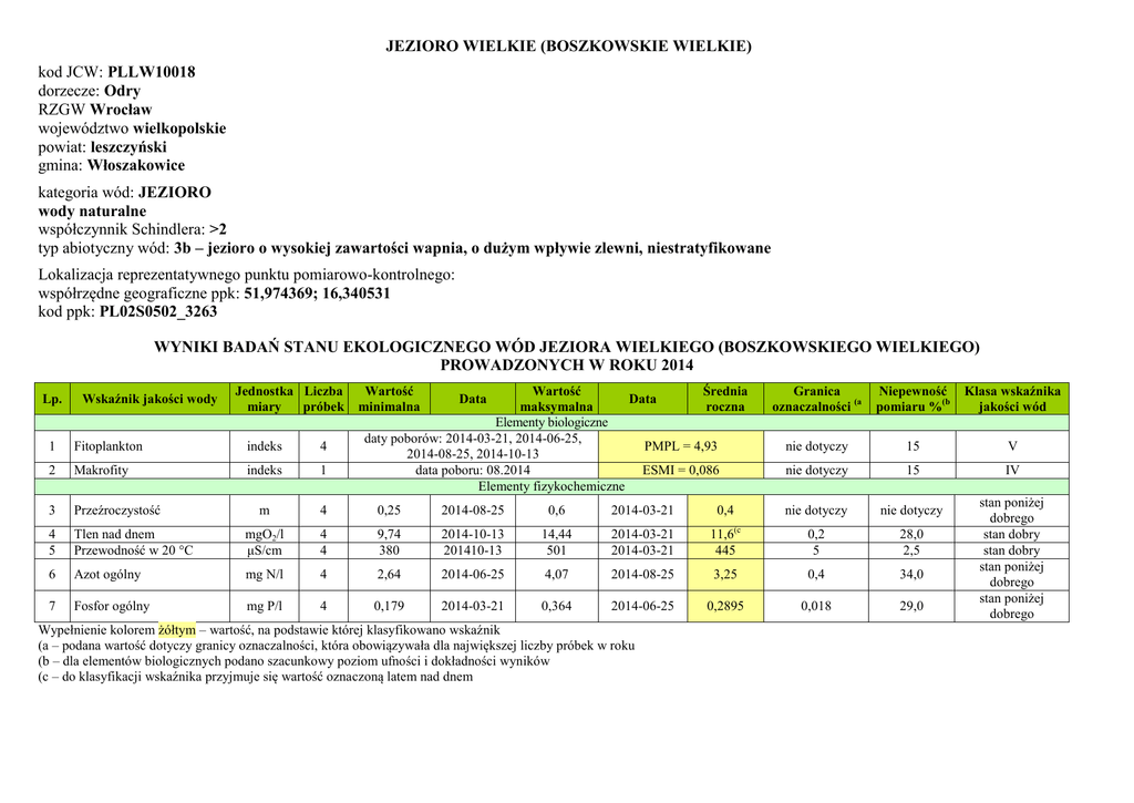 JEZIORO WIELKIE (BOSZKOWSKIE WIELKIE) kod JCW: PLLW10018 dorzecze: Odry RZGW Wrocław województwo wielkopolskie powiat: leszczyński gmina: Włoszakowice kategoria wód: JEZIORO wody naturalne współczynnik Schindlera: >2 typ abiotyczny wód: 3b – jezioro o wysokiej zawartości wapnia, o dużym wpływie zlewni, niestratyfikowane Lokalizacja reprezentatywnego punktu pomiarowo-kontrolnego: współrzędne geograficzne ppk: 51,974369; 16,340531 kod ppk: PL02S0502_3263 WYNIKI BADAŃ STANU EKOLOGICZNEGO WÓD JEZIORA WIELKIEGO (BOSZKOWSKIEGO WIELKIEGO) PROWADZONYCH W ROKU 2014 Lp. Wskaźnik jakości wody Jednostka Liczba miary próbek Wartość minimalna Wartość Średnia Data maksymalna roczna Elementy biologiczne daty poborów: 2014-03-21, 2014-06-25, PMPL = 4,93 2014-08-25, 2014-10-13 data poboru: 08.2014 ESMI = 0,086 Elementy fizykochemiczne Data Granica oznaczalności (a Niepewność pomiaru %(b Klasa wskaźnika jakości wód nie dotyczy 15 V nie dotyczy 15 IV 1 Fitoplankton indeks 4 2 Makrofity indeks 1 3 Przeźroczystość m 4 0,25 2014-08-25 0,6 2014-03-21 0,4 nie dotyczy nie dotyczy 4 5 Tlen nad dnem Przewodność w 20 °C mgO2/l μS/cm 4 4 9,74 380 2014-10-13 201410-13 14,44 501 2014-03-21 2014-03-21 11,6(c 445 0,2 5 28,0 2,5 6 Azot ogólny mg N/l 4 2,64 2014-06-25 4,07 2014-08-25 3,25 0,4 34,0 7 Fosfor ogólny mg P/l 4 0,179 2014-03-21 0,364 2014-06-25 0,2895 0,018 29,0 Wypełnienie kolorem żółtym – wartość, na podstawie której klasyfikowano wskaźnik (a – podana wartość dotyczy granicy oznaczalności, która obowiązywała dla największej liczby próbek w roku (b – dla elementów biologicznych podano szacunkowy poziom ufności i dokładności wyników (c – do klasyfikacji wskaźnika przyjmuje się wartość oznaczoną latem nad dnem stan poniżej dobrego stan dobry stan dobry stan poniżej dobrego stan poniżej dobrego KLASYFIKACJA ELEMENTÓW BIOLOGICZNYCH, FIZYKOCHEMICZNYCH I HYDROMORFOLOGICZNYCH W JEDNOLITEJ CZĘŚCI WÓD Klasyfikacja elementów: biologicznych – V (STAN ZŁY) fizykochemicznych – STAN PONIŻEJ DOBREGO hydromorfologicznych – I KLASA