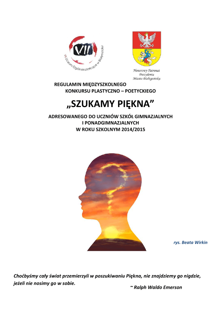 REGULAMIN MIĘDZYSZKOLNEGO KONKURSU PLASTYCZNO – POETYCKIEGO „SZUKAMY PIĘKNA” ADRESOWANEGO DO UCZNIÓW SZKÓŁ GIMNAZJALNYCH I PONADGIMNAZJALNYCH W ROKU SZKOLNYM 2014/2015 rys. Beata Wirkin Choćbyśmy cały świat przemierzyli w poszukiwaniu Piękna, nie znajdziemy go nigdzie, jeżeli nie nosimy go w sobie. ~ Ralph Waldo Emerson Pojęcie piękna należy do podstawowych wartości, jakie zdefiniowała filozofia u samych swoich początków. Jednak współcześnie pojęcie piękna stało się terminem niejasnym. Obecnie nie zawsze jest ono utożsamiane z prawdą, dobrem i harmonią zawartą w należytych proporcjach wyrażalnych matematycznie, tak jak to określali Grecy. Zjawiska określane niegdyś mianem brzydkich, złych czy strasznych aktualnie przestają być tak postrzegane, czego przykładem mogą być popularne w kulturze młodzieżowej motywy śmierci i wampiryzmu. W obliczu niebezpiecznego relatywizmu pojęć widzimy potrzebę ratowania PIĘKNA. W obliczu zalewającego nas kiczu i brzydoty zasadnym staje się określenie granic i znalezienie definicji, które pomogą rozpoznać piękno i to wszystko, co się za tym pojęciem kryje. I. ORGANIZATOR KONKURSU Klasa sztuk pięknych VII Liceum Ogólnokształcącego w Białymstoku. II. CELE KONKURSU 1. Rozbudzenie wśród młodzieży zainteresowania pięknem poprzez stawianie pytań: co to jest piękno i jak można je opisać? gdzie można piękno znaleźć? jaka jest różnica pomiędzy pięknem a kiczem, pięknem a brzydotą? czy piękno jest zjawiskiem obiektywnym czy subiektywnym? czy piękno jeszcze istnieje we współczesnym świecie? 2. Ukazanie rozległej problematyki piękna, która przejawia się nie tylko w estetyce otaczającego świata czy sztuce lecz również w miłości, dobru, w relacjach międzyludzkich, w szlachetnych postawach, współczuciu, empatii, poświęceniu, pomocy itp. 3. Rozwijanie wrażliwości i wyobraźni uczniów. 4. Doskonalenie umiejętności wyrażania piękna poprzez wypowiedzi plastyczne oraz poetyckie. 5. Promocja młodych artystów. III. ZASADY I TRYB PRZEPROWADZENIA KONKURSU 1. Przesłanie pracy na konkurs jest jednoznaczne z przekazaniem pełnych majątkowych praw autorskich na rzecz organizatorów konkursu. Nadesłane prace nie podlegają zwrotowi i przechodzą na własność organizatora, pozostając do jego dyspozycji z prawem bezpłatnego rozpowszechniania. 2. Brak spełnienia warunków określonych w regulaminie będzie stanowił podstawę do dyskwalifikacji pracy. 3. Dane osobowe uczestników służą wyłącznie do prawidłowego przeprowadzenia konkursu. Kategoria plastyczna 1. Każdy uczestnik powinien wykonać i przesłać jedną pracę plastyczną w dowolnie wybranej technice: a) malarstwo (farba plakatowa, akrylowa, akwarela, tempera, klejówka, kredki i tusze kolorowe), b) rysunek i grafika (linoryt, drzeworyt, monotypia, techniki mieszane). 2. Wymiary prac są dowolne, jednak nie większe niż 70 x 100 cm. 3. Każdą pracę należy opatrzyć włożyć do koperty lub innego opakowania, a na odwrocie każdej pracy napisać lub przykleić kartę informacyjną z następującymi danymi: a) imię i nazwisko oraz wiek autora, b) tytuł pracy, c) adres z kodem pocztowym oraz telefon placówki rekomendującej pracę, d) telefon oraz adres e-mail autora, e) imię i nazwisko instruktora (nauczyciela), pod którego kierunkiem została wykonana praca. Kategoria poetycka 1. Każdy uczestnik konkursu powinien przesłać 3 własne wiersze. Mogą one tworzyć cykl lub być niezależnymi od siebie tekstami. 2. Utwory należy przesłać w formie wydruków komputerowych, w trzech egzemplarzach (czcionka Times New Roman, wielkość 12) 3. Każdą kartkę należy oznaczyć na odwrocie godłem autora. Na pracy nie należy umieszczać żadnych innych danych. 4. Prace konkursowe, należy włożyć do dużej koperty oznaczonej godłem wraz z drugą mniejszą zaklejoną kopertą opatrzoną tym samym godłem, która zawierać będzie kartę informacyjną z następującymi danymi: a) imię i nazwisko oraz wiek autora, b) tytuł pracy, c) adres z kodem pocztowym oraz telefon placówki rekomendującej pracę, d) telefon oraz adres e-mail autora, e) imię i nazwisko instruktora (nauczyciela), pod którego kierunkiem została wykonana praca. VI. ZASADY OCENIANIA I NAGRADZANIA 1. Jury przyzna nagrody i wyróżnienia za najlepsze utwory PLASTYCZNE i POETYCKIE w dwóch kategoriach wiekowych: I. KATEGORIA: szkoły gimnazjalne, II. KATEGORIA: szkoły ponadgimnazjalne. 2. Wyniki konkursu zostaną zamieszczone na stronie internetowej: www.7lo.bialystok.pl 3. Prace konkursowe należy nadesłać lub dostarczyć, w ostatecznym terminie, do dnia 01.06. 2015 roku na adres VII Liceum Ogólnokształcące ul. Wierzbowa 7 15-743 Białystok 4. Ogłoszenie wyników, wręczenie nagród i otwarcie wystawy odbędzie się w VII Liceum Ogólnokształcącym w Białymstoku, dnia 12.06.2015r. o godz. 11.00. 5. Prace nagrodzone i wyróżnione przechodzą na własność organizatorów. Pozostałe prace mogą być odebrane w terminie do dnia 23.06.2015 roku. VII. UWAGI KOŃCOWE 1. Prace niespełniające wymogów regulaminu oraz zniszczone w wyniku niewłaściwego opakowania, nie będą brane pod uwagę. 2. Telefon kontaktowy: Renata Kaczyńska-Łuba VII LO 85 664 93 31 VIII. FUNDATORZY NAGRÓD Konkurs jest współfinansowany przez Departament Edukacji i Kultury w Białymstoku oraz VII Liceum Ogólnokształcące w Białymstoku.