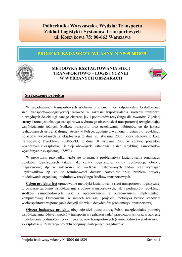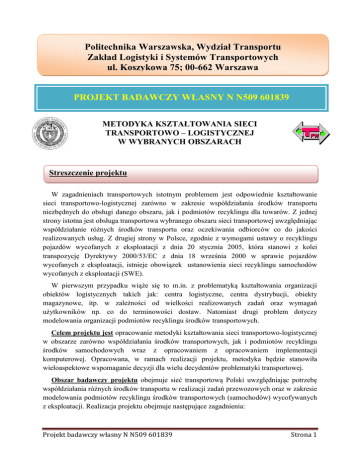 Politechnika Warszawska, Wydział Transportu Zakład Logistyki i Systemów Transportowych ul. Koszykowa 75; 00-662 Warszawa PROJEKT BADAWCZY WŁASNY N N509 601839 METODYKA KSZTAŁTOWANIA SIECI TRANSPORTOWO – LOGISTYCZNEJ W WYBRANYCH OBSZARACH Streszczenie projektu W zagadnieniach transportowych istotnym problemem jest odpowiednie kształtowanie sieci transportowo-logistycznej zarówno w zakresie współdziałania środków transportu niezbędnych do obsługi danego obszaru, jak i podmiotów recyklingu dla towarów. Z jednej strony istotna jest obsługa transportowa wybranego obszaru sieci transportowej uwzględniając współdziałanie różnych środków transportu oraz oczekiwania odbiorców co do jakości realizowanych usług. Z drugiej strony w Polsce, zgodnie z wymogami ustawy o recyklingu pojazdów wycofanych z eksploatacji z dnia 20 stycznia 2005, która stanowi z kolei transpozycję Dyrektywy 2000/53/EC z dnia 18 września 2000 w sprawie pojazdów wycofanych z eksploatacji, istnieje obowiązek ustanowienia sieci recyklingu samochodów wycofanych z eksploatacji (SWE). W pierwszym przypadku wiąże się to m.in. z problematyką kształtowania organizacji obiektów logistycznych takich jak: centra logistyczne, centra dystrybucji, obiekty magazynowe, itp. w zależności od wielkości realizowanych zadań oraz wymagań użytkowników np. co do terminowości dostaw. Natomiast drugi problem dotyczy modelowania organizacji podmiotów recyklingu środków transportowych. Celem projektu jest opracowanie metodyki kształtowania sieci transportowo-logistycznej w obszarze zarówno współdziałania środków transportowych, jak i podmiotów recyklingu środków samochodowych wraz z opracowaniem z opracowaniem implementacji komputerowej. Opracowana, w ramach realizacji projektu, metodyka będzie stanowiła wieloaspektowe wspomaganie decyzji dla wielu decydentów problematyki transportowej. Obszar badawczy projektu obejmuje sieć transportową Polski uwzględniając potrzebę współdziałania różnych środków transportu w realizacji zadań przewozowych oraz w zakresie modelowania podmiotów recyklingu środków transportowych (samochodów) wycofywanych z eksploatacji. Realizacja projektu obejmuje następujące zagadnienia: Projekt badawczy własny N N509 601839 Strona 1 – analizę i ocenę wpływu ukształtowania organizacji centrów logistycznych przy uwzględnieniu regularnych struktur hierarchicznej sieci logistycznej na współdziałanie środków transportowych dla wybranych obszarów sieci transportowej, – projektowanie obiektów logistycznych takich jak: bazy przeładunkowe, magazyny kompletacyjne, centrów dystrybucyjne, itp. w funkcji potrzeb danego obszaru oraz analiza i ocena wpływu struktury dostaw i wysyłek na pracochłonność procesu komisjonowania w aspekcie modelowania współdziałania środków transportowych w zakresie obsługi transportowej wybranego obszaru, – modelowanie terminowych dostaw w wieloszczeblowym systemie dystrybucji; – modelowanie lokalizacji podmiotów recyklingu środków transportowych wycofywanych z eksploatacji. Na potrzeby realizacji projektu zostanie skonstruowany model sieci transportowologistycznej w aspekcie jej kształtowania dla zdefiniowanych obszarów transportu przy uwzględnieniu kryteriów oceny efektywności wykorzystania różnych środków transportu. Modele matematyczne sformułowane adekwatnie do analizowanych problemów sieci transportowej pozwolą na opracowanie algorytmów wspomagania decyzji w zakresie racjonalnego wykorzystania środków transportu oraz lokalizacji podmiotów recyklingu samochodów wycofywanych z eksploatacji. Wymiernym wynikiem projektu będą aplikacje komputerowe wspomagania decyzji decydentów dla zdefiniowanych obszarów transportu. Planowany wynik końcowy będzie mieć charakter oryginalnego narzędzia w postaci metodyki kształtowania sieci transportowologistycznej w obszarze współdziałania środków transportu oraz modelowania lokalizacji podmiotów recyklingu samochodów wycofywanych z eksploatacji. OKRES REALIZACJI PROJEKTU – 10.09.2010 ÷ 09.09.2012 KIEROWNIK PROJEKTU prof. dr hab. inż. Marianna Jacyna Politechnika Warszawska Wydział Transportu Zakład Logistyki i Systemów Transportowych tel.: 22 234 60 17 e-mail: [email protected] Projekt badawczy własny N N509 601839 Strona 2