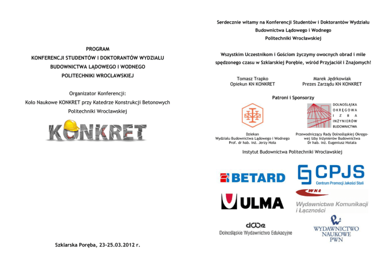 Serdecznie witamy na Konferencji Studentów i Doktorantów Wydziału Budownictwa Lądowego i Wodnego Politechniki Wrocławskiej PROGRAM KONFERENCJI STUDENTÓW I DOKTORANTÓW WYDZIAŁU BUDOWNICTWA LĄDOWEGO I WODNEGO POLITECHNIKI WROCŁAWSKIEJ Organizator Konferencji: Koło Naukowe KONKRET przy Katedrze Konstrukcji Betonowych Wszystkim Uczestnikom i Gościom życzymy owocnych obrad i mile spędzonego czasu w Szklarskiej Porębie, wśród Przyjaciół i Znajomych! Tomasz Trapko Opiekun KN KONKRET Marek Jędrkowiak Prezes Zarządu KN KONKRET Patroni i Sponsorzy Politechniki Wrocławskiej Dziekan Wydziału Budownictwa Lądowego i Wodnego Prof. dr hab. inż. Jerzy Hoła Przewodniczący Rady Dolnośląskiej Okręgowej Izby Inżynierów Budownictwa Dr hab. inż. Eugeniusz Hotała Instytut Budownictwa Politechniki Wrocławskiej Szklarska Poręba, 23-25.03.2012 r. Komitet Organizacyjny: Dr inż. Tomasz Trapko - Przewodniczący Informacje ogólne Konferencja Studentów i Doktorantów Wydziału Budownictwa Lądowe- Dr inż. Michał Musiał go i Wodnego Politechniki Wrocławskiej odbędzie się w dniach 23- Dr inż. Wojciech Pawlak 25.03.2012 r. w Ośrodku Konferencyjno-Szkoleniowym RADOŚĆ Politechni- Mgr inż. Ewelina Kusa ki Wrocławskiej w Szklarskiej Porębie. Inż. Marek Jędrkowiak Ośrodek Konferencyjno-Szkoleniowy Inż. Grzegorz Górnik RADOŚĆ Inż. Dariusz Krupicki Politechniki Wrocławskiej Inż. Mateusz Kuśnierek Szklarska Poręba, ul. Muzealna 5 Inż. Grzegorz Matla tel.: 75 717 23 14 Inż. Karol Kaczkowski e-mail: [email protected] Komitet Naukowy: Rejestracja Gości odbędzie się 23.03.2012 r w piątek w godz. 1200-1300. Prof. dr hab. inż. Jan Biliszczuk W czasie rejestracji Uczestnicy Konferencji otrzymają materiały konfe- Dr hab. inż. Bożena Hoła, prof. PWr. rencyjne, identyfikator, materiały reklamowe sponsorów oraz zostaną Prof. dr hab. inż. Jerzy Hoła zakwaterowani w ośrodku. Dr hab. inż. Eugeniusz Hotała, prof. PWr. Prof. dr hab. inż. Jerzy Jasieńko Prof. dr hab. inż. Mieczysław Kamiński Autorów referatów prosimy o dostarczenie swojej prezentacji, na płycie CD lub nośniku USB, podczas rejestracji na Konferencję. Dr hab. inż. Marek Krużyński, prof. PWr. Dr hab. inż. Dariusz Łydżba, prof. PWr. Prof. dr hab. inż. Cezary Madryas Informacje dla osób prezentujących referaty: Całkowity czas przeznaczony na każdy referat wynosi 15 minut. 5-cio Prof. dr hab. inż. Kazimierz Rykaluk minutowa dyskusja nad przedstawionymi referatami odbędzie się po wy- Prof. dr hab. inż. Antoni Szydło głoszeniu każdej prezentacji. Ze względu na napięty program obrad Prze- Dr hab. inż. Andrzej Ubysz, prof. PWr. wodniczący poszczególnych sesji będą proszeni o bezwzględne przestrze- Dr inż. Tomasz Trapko – Sekretarz ganie ram czasowych. Do dyspozycji osób prezentujących referaty będzie: komputer, rzutnik multimedialny, ekran, wskaźnik laserowy i mikrofon. RAMOWY PROGRAM KONFERENCJI 900 1200 – 1300 1300 45 13 – 1430 1430 – 1700 1700 – 1730 1730 – 1930 2000 800 00 9 – 1030 1030 – 1100 1100 – 1230 1300 00 14 – 1600 1600 – 1630 1630 – 1815 1900 00 20 – do rana 00 10 13oo Piątek, 23.03.2012 r. Wyjazd z Wrocławia do Szklarskiej Poręby (zbiórka o godz. 850 przed budynkiem A-1) Rejestracja gości Obiad Otwarcie Konferencji, referat otwierający Sesja I Kawa, herbata, ciasto Wyjście na basen i kręgle Kolacja Sobota, 24.03.2012 r. Śniadanie Sesja II Kawa, herbata, ciasto Sesja III Obiad Mecz piłkarski lub turniej w kręgle Kawa, herbata, ciasto Sesja IV Podsumowanie Konferencji i wręczenie nagród Bankiet (DJ od 2000 do 0300) Niedziela, 25.03.2012 r. Śniadanie Wyjazd do Wrocławia PROGRAM KONFERENCJI 1400-1430 1430-1445 1445-1500 1500-1515 1515-1530 1530-1545 1545-1600 1600-1615 1615-1700 Piątek, 23.03.2012 r. Otwarcie konferencji – 1345-1430 Przewodniczący: Tomasz Trapko, Marek Jędrkowiak Referat otwierający Janusz Pędziwiatr Wszystko, co chcecie wiedzieć o słupach, ale wstydzicie się zapytać Piątek, 23.03.2012 r. Sesja I – 1430-1700 Budownictwo betonowe Przewodniczący: Michał Musiał, Tomasz Trapko Jędrkowiak Marek Analiza techniczno-ekonomiczna oraz zasady planowania i nadzorowania montażu konstrukcji prefabrykowanych Krupicki Dariusz Belki żelbetowe wzmacnianie betonami BWW Maćków Joanna Konstrukcje nośne żelbetowych budynków poddanych obciążeniu spowodowanemu wybuchem – zasady projektowania Stępczak Mateusz, Laskowski Kamil Projektowanie stropów płytowo-słupowych Szczepaniak Martyna Zabezpieczanie konstrukcji z betonu a działanie pożaru Szybiński Józef Metody pomiaru i naprawy otuliny w kontekście ochrony korozyjnej stali zbrojeniowej Urbańska Dorota Budownictwo z prefabrykatów wielkowymiarowych – wczoraj i dziś. Wrocławskie osiedle „Manhattan” jako przykład z lat 70 – konstrukcja, problemy i uszkodzenia Referat promocyjny Nowak Dariusz - ULMA Construccion Polska S.A. Technologia deskowań na przykładach realizacji firmy ULMA 900-915 915-930 930-945 945-1000 00 15 15 30 10 -10 10 -10 1100-1130 1130-1145 1145-1200 1200-1215 1215-1230 Sobota, 24.03.2012 r. Sesja II – 900-1030 Innowacyjna gospodarka Przewodniczący: Wojciech Pawlak Baranowski Przemysław, Kowerski Sebastian Elektrownie wiatrowe – w cieniu olbrzymów Iżykowska Magdalena Recykling betonu konstrukcyjnego Kaczmarek Mateusz, Rudner Paweł Papier jako materiał konstrukcyjny – analiza badań wytrzymałościowych tulei papierowych Maszczak Mateusz Recykling w budownictwie Baszak Paweł Obwodnica Jeleniej Góry – przebieg realizacji Al Naassan Michał Podłoże gruntowe i materiały budowlane w Syrii Sobota, 24.03.2012 r. Sesja III – 1100-1230 Konstrukcje stalowe i murowe Przewodniczący: Janusz Pędziwiatr, Tomasz Trapko Referat promocyjny Piotrowska Magdalena – Centrum Promocji Jakości Stali Stal zbrojeniowa B500SP o wysokiej ciągliwości ze znakiem jakości EPSTAL – właściwości, badania, zasto