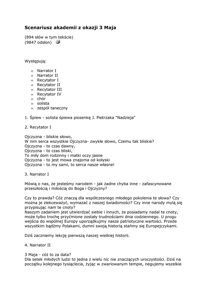 Scenariusz akademii z okazji 3 Maja (894 słów w tym tekście) (9847 odsłon) Występują: • • • • • • • • • Narrator I Narrator II Recytator I Recytator II Recytator III Recytator IV chór solista zespół taneczny 1. Śpiew - solista śpiewa piosenkę J. Pietrzaka "Nadzieja" 2. Recytator I Ojczyzna - bliskie słowo, W nim serca wszystkie Ojczyzna- zwykłe słowo, Czemu tak bliskie? Ojczyzna - to czas dawny, Ojczyzna - to czas bliski, To miły dom rodzinny i matki oczy jasne Ojczyzna - to jest mowa znajoma od kołyski Ojczyzna - to my sami, to serca nasze własne! 3. Narrator I Mówią o nas, Ŝe jesteśmy narodem - jak Ŝadne chyba inne - zafascynowane przeszłością i miłością do Boga i Ojczyzny? Czy to prawda? CóŜ znaczą dla współczesnego młodego pokolenia te słowa? Czy moŜna je zlekcewaŜyć, wymazać z naszej świadomości? Czy inne narody mylą się przypisując nam te cnoty? Naszym zadaniem jest utwierdzać siebie i innych, Ŝe posiadamy nadal te cnoty, moŜe tylko trochę przyćmione zostały trudnościami dnia codziennego. U progu wejścia do wspólnej Europy uporządkujmy nasze patriotyczne wartości. Przede wszystkim bądźmy Polakami, dumni swoją historią stańmy się Europejczykami. Dziś zaczniemy lekcję pierwszą naszej wielkiej historii. 4. Narrator II 3 Maja - cóŜ to za data? Dla setek młodych ludzi to jedna z wielu nic nie znaczących uroczystości. Dziś na początku kolejnego tysiąclecia, Ŝyjąc w zwariowanym tempie, negujemy wszelkie wartości, odrzucamy jakiekolwiek formy czczenia przeszłości, wysuwając na plan pierwszy Ŝycie teraźniejszością. Buntujemy się więc przeciwko pompatycznym i górnolotnym słowom. Nudzą nas wiece, uroczystości, apele, rocznice, święta. Ale czy tak musi i powinno być? PrzecieŜ naród, który nie zna swojej przeszłości, umiera i nie buduje przyszłości. Dla czego więc czcimy 3 Maja? 5. Narrator I Jest wiosna 1791 roku. Stosunki w Europie zaczęły się układać dla Polski niepomyślnie. Rosja chce zdobyć sobie swobodę działania w Polsce. Rząd pruski porozumiał się z Austrią i zmierza do odnowienia stosunków w z carycą, co staje się kolejnym zagroŜeniem dla Polski. 6 Narrator II W kraju, przeciwnicy reform, rozwijają swą działalność, szukają poparcia u obcych dworów, podburzają zacofaną szlachtę, gdyŜ ewentualne reformy ratujące kraj, zabierały im niszczące Polskę przywileje. 7. Narrator I Ostatnią próbą ratowania zagroŜonej ojczyzny było przygotowanie i wprowadzenie przez Polaków- patriotów- mimo sprzeciwów wielu- waŜnego dokumentu -Konstytucji. 8. Aktor - poseł patriota Wielkie dni przeŜywa Warszawa. Oto juŜ drugi dzień obraduje sejm. Toczy się tu walka o losy Polski. Bo dalej tak być nie moŜe, aby ci, których obchodzą tylko własne, prywatne sprawy, mogli rządzić państwem. NaleŜy zmienić dawne, niesprawiedliwe i złe prawa, które prowadzą Polskę do zguby. 9. Narrator II Udało się! Sejm Czteroletni po wielu trudach, tłumaczeniach, uchwalił Konstytucję dokument, który dawał Polsce szansę - był to dzień 3 Maja 1791r. W atmosferze ogromnego uniesienia patriotycznego król Polski złoŜył przysięgę na Konstytucję. Była to druga Konstytucja na świecie, fakt ten, świadczy o wielkiej dojrzałości politycznej polskich patriotów! 10. Narrator I Dlaczego radość tak wielka? Akt ten wprowadzał prawdziwą wolność, jednocześnie likwidując, to, co niszczyło Polskę i ciągnęło ją na dno Europy! Nasi przodkowie Ŝyjący 213 lat temu wiedzieli, rozumieli, czym jest prawdziwa wolność i potrafili znaleźć wyjście dla upadającej Ojczyzny. Największą ich wartością była Ojczyzna! Wiwat im! 11. Chór Wiwat Maj, Trzeci maj ............... 12. Recytator II O ty dniu radosny, O ty Trzeci Maju, zapachniałeś kwieciem w całym polskim kraju! 13. Recytator I Jak tu ciebie Trzeci Maju dziś powitać Gdy tak wschodzisz promienistych błękitach?! Prawda, prawda Czarnoleski Janie: "Serce roście patrząc na te czasy!" Tętnem krwi zaszumiały nasze miasta jak lasy Ludzki wzrok oddawszy marzeniom Planują co jeszcze zmienią By trwalsze, piękniejsze było Ŝycie Polaka By potomni trud ich wspominali po wiekach. 14. Chór Jak długo w sercach naszych ......................... 15. Narrator II Okres wolności i nadziei trwał krótko, Polska zniknęła z mapy Europy na 123 lata, ale dzieło Sejmu Wielkiego pozostało na zawsze symbolem odrodzenia, ostatniej próby, mądrości Polaków. Symbol ten zawsze będzie utoŜsamiany z Polską i Polakami, tak jak ............................ 16. Polonez (z Pana Tadeusza) 17. Narrator I Jak długo symbole te kojarzone będą z Polska i Polakami zaleŜy wyłącznie od nas Polaków, a przede wszystkim, od młodych Polaków! Dziś czasy równie nie są łatwe, nie jest teŜ łatwo być prawdziwym Polakiem. To właśnie po to przypominamy tych, którzy rozproszeni przez lata po całym świecie Ŝyli i działali na rzecz Ojczyzny. To po to przypominamy karty historii, by czerpać z nich siłę i mądrość, wartości, które pozwalały Polakom przetrwać, bo ..... 18. Recytator III A jak cię kto zapyta: Kto ty taki, skąd ty rodem? Mów, Ŝeś z tego łanu Ŝyta, śeś z tych łąk, co pachną miodem. Mów, Ŝe jesteś z takiej chaty, co Piastowską chatą była. śeś z tej ziemi, której kwiaty Gorzka rosa wykarmiła. 19. Recytator IV Bez tej miłości moŜna Ŝyć Mieć serce suche jak orzeszek Malutki los naparstkiem pić Z dala od zgryzot i pocieszeń, Na własną miarę znać nadzieję, W mroku kryjówkę sobie uwić, O blasku próchna mówić "dnieje", O blasku słońca nic nie mówić. Ziemio ojczysta, ziemio jasna, Nie będę powalonym drzewem. Codziennie Mocniej w Ciebie wrastam Radością, smutkiem, dumą, gniewem Nie będę jak zerwana nić. Odrzucam pusto brzmiące słowa. MoŜna nie kochać cię - i Ŝyć, Ale nie moŜna owocować. 20. Polonez Ogińskiego (muzyka). Monika W 