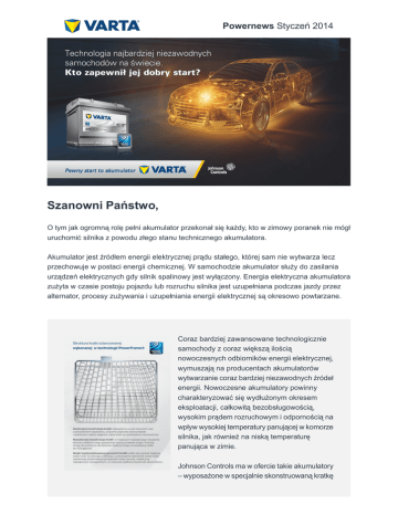 Powernews Styczeń 2014 Szanowni Państwo, O tym jak ogromną rolę pełni akumulator przekonał się każdy, kto w zimowy poranek nie mógł uruchomić silnika z powodu złego stanu technicznego akumulatora. Akumulator jest źródłem energii elektrycznej prądu stałego, której sam nie wytwarza lecz przechowuje w postaci energii chemicznej. W samochodzie akumulator służy do zasilania urządzeń elektrycznych gdy silnik spalinowy jest wyłączony. Energia elektryczna akumulatora zużyta w czasie postoju pojazdu lub rozruchu silnika jest uzupełniana podczas jazdy przez alternator, procesy zużywania i uzupełniania energii elektrycznej są okresowo powtarzane. Coraz bardziej zawansowane technologicznie samochody z coraz większą ilością nowoczesnych odbiorników energii elektrycznej, wymuszają na producentach akumulatorów wytwarzanie coraz bardziej niezawodnych źródeł energii. Nowoczesne akumulatory powinny charakteryzować się wydłużonym okresem eksploatacji, całkowitą bezobsługowością, wysokim prądem rozruchowym i odpornością na wpływ wysokiej temperatury panującej w komorze silnika, jak również na niską temperaturę panująca w zimie. Johnson Controls ma w ofercie takie akumulatory – wyposażone w specjalnie skonstruowaną kratkę PowerFrame wraz z dodatkiem srebra do stopu ołowiu. PowerFrame to opatentowana przez Johnson Controls technologia produkcji kratki akumulatora metodą sztancowania. Zastosowana zarówno w akumulatorach do samochodów osobowych VARTA dynamic trio jak i ciężarowych - VARTA Promotive. Przy technologii sztancowania Power Frame z rozwalcowanego stopu przy komputerowej kontroli precyzyjnie, kilkuetapowo sztancujemy taśmę stopu, uzyskując najbardziej optymalną geometrię kratki. Poprzez sztancowanie kratki unikamy jej wytapiania, rozciągania i odlewania, niwelując ryzyko powstawania mikro pęknięć - miejsc w których kratka może szybko korodować. Zwiększamy też jej odporność na: drgania, wstrząsy i erozję masy czynnej. Ponad to produkcja kratek PowerFrame pozwala na zmniejszenie zużycia energii o 20% i zapewnia o 20% niższą emisję gazów cieplarnianych do atmosfery w porównaniu do innych metod produkcji. Dzięki zastosowaniu PowerFrame akumulatory samochodowe mogą pracować dłużej, zapewniając większą moc rozruchową i optymalne natężenie przepływu prądu. Są nie tylko całkowicie bezobsługowe, ale posiadają również wyższe parametry elektryczne, odporność na ekstremalne temperatury oraz częste cykle ładowania i rozładowania. Zoptymalizowana konstrukcja płyty w miejscach największego skupienia przepływu ładunku elektrycznego powoduje, że akumulator niezależnie od warunków atmosferycznych czy to podczas mrozów czy upału, jest w stanie nie tylko zgromadzić w sobie odpowiednią ilość energii, ale także przekazać ją szybko do odbiorników energii elektrycznej w pojeździe, które jej potrzebują do prawidłowego i niezawodnego funkcjonowania. Więcej informacji na stronie http://www.varta-automotive.pl/ > Battery Search > Business Portal A Johnson Controls Inc. Company Johnson Controls Akumulatory Sp. z o.o. Ul. Ceglana 4 40-514 Katowice Polska Tel: 0048 32 608 69 50 51 Fax: 0048 32 209 55 83 E-mail: [email protected]