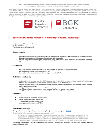PFR to grupa instytucji finansowych i doradczych dla przedsiębiorców, samorządów i osób prywatnych inwestująca w zrównoważony rozwój społeczny i wzrost gospodarczy kraju. Bank Gospodarstwa Krajowego to państwowy bank rozwoju, który inicjuje i realizuje programy służące wzrostowi ekonomicznemu Polski. Stanowi centrum kompetencyjne w finansowaniu projektów infrastrukturalnych, eksportu, spółek komunalnych i samorządów. Rozwija systemy poręczeń i gwarancji mające na celu pobudzanie przedsiębiorczości. Angażuje się w programy służące poprawie sytuacji na rynku mieszkaniowym i dostępu Polaków do mieszkań. Zarządza programami europejskimi i dystrybuuje środki unijne w skali krajowej i regionalnej. Specjalista w Biurze Wdrożenia Centralnego Systemu Bankowego Miejsce pracy: Warszawa, Polska Nr ref.: 270/2017 Termin zgłoszeń: 28 luty 2017 Główne zadania: odpowiedzialność za rozwój produktów firmy zgodnie z procedurami, wymogami oraz standardami jakościowymi prowadzenie dokumentacji realizowanych procesów, analiza, projektowanie rozwiązań, kodowanie, testy jednostkowe oraz tworzenie dokumentacji technicznej. Oczekujemy: wykształcenia wyższego (na kierunku: informatyka, bazy danych, programowanie), doświadczenia: rok w sektorze finansowym, doświadczenia: rok doświadczenia w programowaniu JAVA. Dodatkowo oczekujemy: znajomości web service (apache CXF), baz danych (SQL, JPA), spring, xml oraz zagadnień związanych z SOA i integracją aplikacji znajomość podstaw języka SQL i baz danych, znajomości pozostałych technologii wchodzących w skład redhat jboss fuse esb apache camel, apache karaf, apache activeMQ), umiejętności projektowania rozwiązań informatycznych, umiejętności pracy w środowisku linux, eclipse, maven, git, gerrit, soaui, shell. Oferujemy: pracę w pełnym wymiarze czasu pracy, pakiet prywatnej opieki medycznej, Pracowniczy Program Emerytalny, bogaty pakiet świadczeń z ZFŚS. Dodatkowe informacje: Osoby zainteresowane prosimy o przesłanie aplikacji za pomocą przycisku Aplikuj Do aplikacji prosimy dołączyć klauzulę następującej treści: „Wyrażam zgodę na przetwarzanie i przechowywanie przez Bank Gospodarstwa Krajowego Al. Jerozolimskie 7, 00-955 Warszawa, moich danych osobowych w celu przeprowadzenia procesu rekrutacji, w tym ewentualnych przyszłych procesów rekrutacyjnych, zgodnie z przepisami ustawy z dnia 29 sierpnia 1997r. o ochronie danych osobowych (Dz. U. z 2002r., nr 101, poz. 926 z późn. zm.).” Uprzejmie informujemy, że skontaktujemy się jedynie z wybranymi osobami. Prowadzący proces rekrutacji zapewniają poufność.