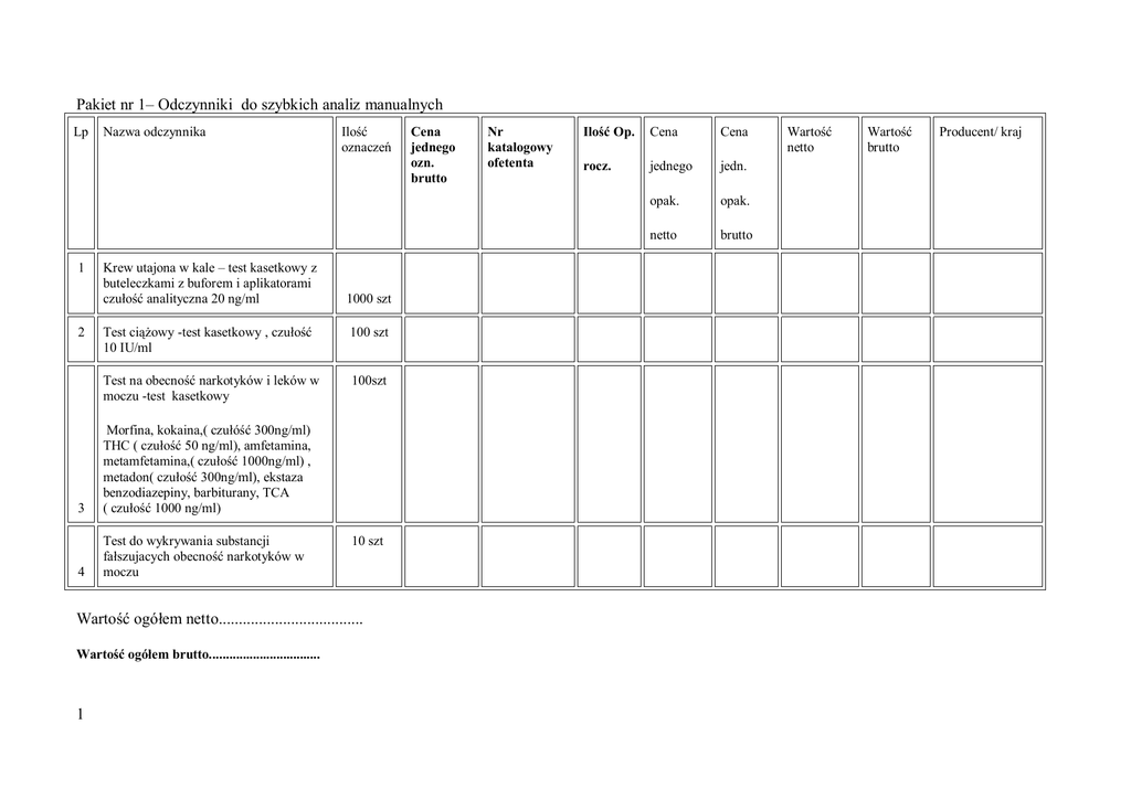 Pakiet nr 1– Odczynniki do szybkich analiz manualnych Lp 1 2 Nazwa odczynnika Krew utajona w kale – test kasetkowy z buteleczkami z buforem i aplikatorami czułość analityczna 20 ng/ml Ilość oznaczeń 1000 szt Test ciążowy -test kasetkowy , czułość 10 IU/ml 100 szt Test na obecność narkotyków i leków w moczu -test kasetkowy 100szt 3 Morfina, kokaina,( czułóść 300ng/ml) THC ( czułość 50 ng/ml), amfetamina, metamfetamina,( czułość 1000ng/ml) , metadon( czułość 300ng/ml), ekstaza benzodiazepiny, barbiturany, TCA ( czułość 1000 ng/ml) 4 Test do wykrywania substancji fałszujacych obecność narkotyków w moczu 10 szt Wartość ogółem netto.................................... Wartość ogółem brutto................................. 1 Cena jednego ozn. brutto Nr katalogowy ofetenta Ilość Op. Cena Cena rocz. jednego jedn. opak. opak. netto brutto Wartość netto Wartość brutto Producent/ kraj Pakiet nr 2 Odczynniki do wykrywania antygenu Giargia Lamblia w kale L p Nazwa odczynnika Ilość oznacze ń Cena jednego oznaczenia brutto Nr katalogo wy ofetenta Ilość Op rocz 1 Test do wykrywania antygenu Giagia Lamblia w kale ( tast Elisa z przeciwciałami monoklonalnymi i 1 etapem płukania ) 1200 Wartość ogółem netto.................................... Wartość ogółem brutto................................... 2 Cena jednego opak. netto Cena jednego opak. brutto Wartość netto Wartość brutto Producent/ kraj Pakiet nr 3 ŻELE DO PROTEINOGRAMÓW Zestaw przygotowany do pracy z aparatem DENSYTOMETR DS-2 l p opis Zestaw do elektroforezy składający się z: płytek z agarozą, bufora w postaci 1 płynnej , barwnika- czerń amidowa ,odbarwiacza, pasków bibuły i folii do nanoszenia próbek Ilość oznacze ń Cena jednego oznaczenia brutto Ilość Nr katalogowy ofetenta Op rocz Cena jednego opak. netto Cena jednego opak. brutto Wartość netto Wartość brutto Producent/ kraj 1200 Wymagania Zamawiającego: 1.Żel utrwalany metodą chemiczną, rozdział białek na 6 frakcji, rozdział max 20 min., instrukcja zawiera wartości referencyjne dla wszystkich 6 frakcji oraz wartości powtarzalności w żelu i między żelami oraz czułości testu. 2.Zamawiający wymaga załączenia do oferty ulotki informacyjnej dotyczącej oferowanego żelu do proteinogramów. W języku polskim 3.Płytki z miejscem max na 10 próbek 3 Warunki dodatkowe bezwględnie wymagane dla Pakietów 1, 2, 3 Podać w którym folderze katalogu firmowym lub dokumencie i na której stronie znajdują się informacje potwierdzające stawiane wymagania 1 Wyroby muszą bezwzględnie spełniać wymagania ustawy o wyrobach medycznych z dn 20.04.2004 ( Dz.U.z 2004r nr 93, poz 896 ) tak/nie Oświadczenie wykonawcy 2 Bezwzględny wymóg dołączenia do oferty : aktualnego dokumentu potwierdzającego dopuszczenie do obrotu, a w przypadku gdy prawo nie wymaga dopuszczenia do obrotu- należy dostarczyć dokument potwierdzający znak zgodności CE dla tego wyrobu tak/nie Dołączyć do oferty i podać nr strony w ofercie 3 Oferowane wyroby muszą spełniać wymagania zasadnicze określone w Rozp.MZ z 3.112004r w sprawie wymagań zasadniczych dla wyrobów medycznych do diagnostyki in vitro ( Dz.U.z dn.3.11.2004r nr 251 poz.2515 ) oraz załącznikach do wymienionego rozporządzenia. tak/nie Oświadczenie wykonawcy 4 Dołączenie do oferty ulotk/instrukcji w języku polskim tak/nie 5 Dołączenie kart charakterystyki substancji niebezpiecznych w formie wydruku lub elektronicznej przy pierwszj dostawie odczynników tak/nie Niespełnienie któregokolwiek z powyższych wymagań oraz warunków granicznych lub brak jakiegokolwiek z wymaganych dokumentów spowoduje odrzucenie oferty. …..................................................................................................................... z y c d O n ik ob d da a ńm nu a ln y a h c .p .N L ZW A BA A N IA D ;/M E DA O T / c h e C o d d a . Z a im we ó i N n r k tlo g a . Ilo ć C ś e n p a o a . V k T A a wa to ru c ilo ś ćd e r y ia j.m .o f e ta rn f k w a p o g ń a e to n (zh ł) i(% ) 1 d c a jO o i io n y z c ś o k t o d g e w h .c tu s n z l n g a m e n y z ty e ru a ik ji(W to c a m u rR e e ln a id ) z s c o g ś ć ło u /m l U 8 a lk p o m 5 n .d d .je o 0 5 m l 2 o z y c d ik la n s o k te y d w mn o u k o y z o le a lk p o m 5 n .d d .je o 0 1 m l 3 w t le s e T a k s u a k z (c y a w tk ć ś ło r ty lik n u 1 w e a n z c ą g jo a n 0 l) /m 0 8 O z n 4 Ile t w s T ó k u m im r u h n z c o t 1 a o in m rfic ra g a p 0 , ro y n tz e m t o s a k e w y d w y k w o wa ry i a n ty k o rk wi z ó s ta e w 0 4 O z n 5 Ig t Ig s e /T G s e a k y M we o tk f ils y S – d z n o e ń z c a e c rz p iw ia łw s w ic ro u wk y i e s la 0 3 O z n 6 T t p s e k o s a y d w y k w o wa ry i n n e n g ty u 0 3 s z t 7 T r y ia tG s e iL k d s a p lia d b m e w o l n a k w z o e łk ia .b a 0 5 s z t 8 T 9 n k tB s e J tk – c e s a a d s e n y w o my w o u a z c o rw k i a n g e ty n H lic n a c b o rp y te ri w lo le a k 0 1 s z t 0 T 1 t im s e u n r o h c o t g a m fic z ra d o y n y k w a n w ry l b ia in w m u o c m u z z ś ć ło u u g 0 1 l /m 0 2 O n . z z e a R m r u a w i k n Pw r1 .T 2 frn ć e ś ło a je z c d o wk o id n y ś in lo ie m w ó p m o c 6 w (w o k .a s ie jd p ń a m te tk 8 s o -n .2 c e y w o t.C s r z k o h ju ls e s n lo )ś a w ru ą y c b " e e a d h c tk o a o a ra w wu to " rto ś a W e to n ć wa ć b ś rto t o ru rd u P n t/ e c łj z k ł K z j l ra Po ć w a d tó ry k fo ld m rz e e , tl o a u k o d firm u g c m n e y w o a m in e b lu re j tó k in o fs a rm t c o p je iz tw n rn ie u d jd a ją a z ię c s e WR A NK U ID O AT D OW K BE E WZ Z LĘ G N IE D WY AG M NE A w ia ta s e w n a g m y i n a . W 1 y ro y m b sz ąb u ez w lę d zg ie sp n ełn iaćw y ag an m i u staw y wy o b ach ro m ed y czn y h zd ia2 0 n k ie tn w ia 2 r . 4 0 ś w o d c ia i e n e z k o y w wc a n y . (D 2 z.B e U .z2w lę 0