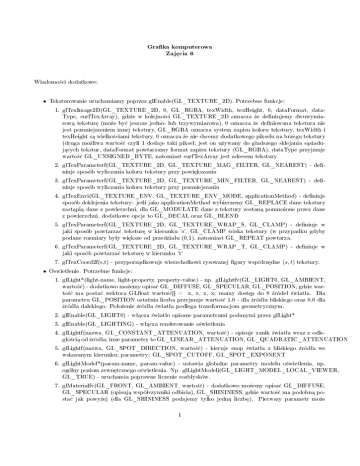 Graka komputerowa Zaj¦cia 6 Wiadomo±ci dodatkowe: • Teksturowanie uruchamiamy poprzez glEnable(GL_TEXTURE_2D). Potrzebne funkcje: 1. glTexImage2D(GL_TEXTURE_2D, 0, GL_RGBA, texWidth, texHeight, 0, dataFormat, dataType, surfTexArray), gdzie w kolejno±ci GL_TEXTURE_2D oznacza »e deniujemy dwuwymiarow¡ tekstur¦ (mo»e by¢ jeszcze jedno- lub trzywymiarowa), 0 oznacza »e deniowana tekstura nie jest pomniejszeniem innej tekstury, GL_RGBA oznacza system zapisu koloru tekstury, texWidth i texHeight s¡ wielko±ciami tekstury, 0 oznacza »e nie chcemy dodatkowego pikselu na brzegu tekstury (druga mo»liwa warto±¢ czyli 1 dodaje taki piksel; jest on u»ywany do gªadszego sklejania s¡siaduj¡cych tekstur, dataFormat powtarzamy format zapisu tekstury (GL_RGBA), dataType przyjmuje warto±¢ GL_UNSIGNED_BYTE, natomiast surfTexArray jest adresem tekstury. 2. glTexParameterf(GL_TEXTURE_2D, GL_TEXTURE_MAG_FILTER, GL_NEAREST) - deniuje sposób wyliczania koloru tekstury przy powi¦kszaniu 3. glTexParameterf(GL_TEXTURE_2D, GL_TEXTURE_MIN_FILTER, GL_NEAREST) - deniuje sposób wyliczania koloru tekstury przy pomniejszaniu 4. glTexEnvi(GL_TEXTURE_ENV, GL_TEXTURE_ENV_MODE, applicationMethod) - deniuje sposób doklejenia tekstury: je±li jako applicationMethod wybierzemy GL_REPLACE dane tekstury zast¡pi¡ dane z powierzchni, dla GL_MODULATE dane z tekstury zostan¡ pomno»one przez dane z powierzchni, dodatkowe opcje to GL_DECAL oraz GL_BLEND 5. glTexParameterf(GL_TEXTURE_2D, GL_TEXTURE_WRAP_S, GL_CLAMP) - deniuje w jaki sposób powtarza¢ tekstur¦ w kierunku 's', GL_CLAMP ±ciska tekstury (w przypadku gdyby podane rozmiary byªy wi¦ksze od przedziaªu (0,1), natomiast GL_REPEAT powtarza. 6. glTexParameterf(GL_TEXTURE_2D, GL_TEXTURE_WRAP_T, GL_CLAMP) - deniuje w jaki sposób powtarza¢ tekstur¦ w kierunku 't' 7. glTexCoord2f(s,t) - przyporz¡dkowuje wierzchoªkowi rysowanej gury wspóªrz¦dne (s, t) tekstury. • Oswietlenie. Potrzebne funkcje: 1. glLight*(light-name, light-property, property-value) - np. glLightfv(GL_LIGHT0, GL_AMBIENT, warto±¢) - dodatkowo mo»emy opisa¢ GL_DIFFUSE, GL_SPECULAR, GL_POSITION, gdzie warto±¢ ma posta¢ wektora GLoat warto±¢[] = x, x, x, x; mamy dost¦p do 8 ¹ródeª ±wiatªa. Dla parametru GL_POSITION ostatnia liczba przyjmuje warto±¢ 1.0 - dla ¹ródªa bliskiego oraz 0.0 dla ¹ródªa dalekiego. Poªo»enie ¹ródªa ±wiatªa podlega transformacjom geometrycznym. 2. glEnable(GL_LIGHT0) - wª¡cza ±wiatªo opisane parametrami podanymi przez glLight* 3. glEnable(GL_LIGHTING) - wª¡cza renderowanie o±wietlenia 4. glLightf(nazwa, GL_CONSTANT_ATTENUATION, warto±¢) - opisuje zanik ±wiatªa wraz z odlegªo±ci¡ od ¹ródªa; inne parametry to GL_LINEAR_ATTENUATION, GL_QUADRATIC_ATTENUATION 5. glLightf(nazwa, GL_SPOT_DIRECTION, warto±¢) - kieruje snop ±wiatªa z bliskiego ¹ródªa we wskazanym kierunku; parametry: GL_SPOT_CUTOFF, GL_SPOT_EXPONENT 6. glLightModel*(param-name, param-value) - ustawia globalne parametry modelu o±wietlenia, np. ogólny poziom zewn¦trznego o±wietlenia. Np. glLightModeli(GL_LIGHT_MODEL_LOCAL_VIEWER, GL_TRUE) - uruchamia poprawne liczenie rozbªysków. 7. glMaterialfv(GL_FRONT, GL_AMBIENT, warto±¢) - dodatkowo mo»emy opisa¢ GL_DIFFUSE, GL_SPECULAR (opisuj¡ wspóªczynniki odbicia), GL_SHININESS, gdzie warto±¢ ma podobn¡ posta¢ jak powy»ej (dla GL_SHININESS podajemy tylko jedn¡ liczb¦). Pierwszy parametr mo»e 1 przyj¡¢ równie» warto±¢ GL_BACK lub GL_FRONT_AND_BACK. 8. glShadeModel(GL_SMOOTH) - sposób obliczania koloru dla o±wietlonej powierzchni - GL_SMOOTH wylicza ±redni¡ pomi¦dzy wierzchoªkami, GL_FLAT przypisuje jeden kolor caªej powierzchni. 9. glNormal3f(x,x,x) - podaje jednostkowy wektor prostopadªy do powierzchni skierowany na zewn¡trz. Zadania: 1. Prosz¦ uruchomi¢ teksturowanie i narysowa¢ sze±cian ze ±cianami oklejonymi tekstur¡ w czarno-biaª¡ szachownic¦. 2. Wykorzystuj¡c program GIMP, prosz¦ narysowa¢ tekstur¦, zapisa¢ j¡ w formacie 'c' i wykorzysta¢ do narysowania sze±cianu. 3. Prosz¦ uruchomi¢ o±wietlenie i narysowa¢ o±wietlony obracaj¡cy si¦ stolik z czajnikiem. Prosz¦ sprawdzi¢ zachowanie si¦ obrazu przy zmianie parametrów o±wietlenia i materiaªów. 2