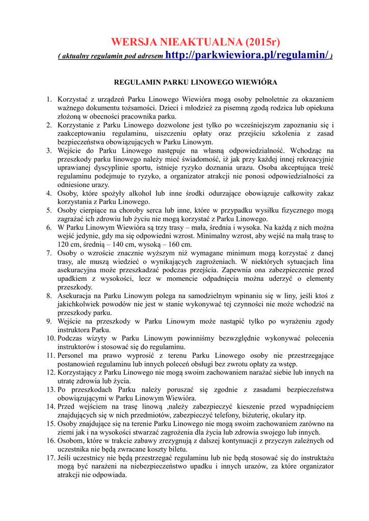 WERSJA NIEAKTUALNA (2015r) ( aktualny regulamin pod adresem http://parkwiewiora.pl/regulamin/ ) REGULAMIN PARKU LINOWEGO WIEWIÓRA 1. Korzystać z urządzeń Parku Linowego Wiewióra mogą osoby pełnoletnie za okazaniem ważnego dokumentu tożsamości. Dzieci i młodzież za pisemną zgodą rodzica lub opiekuna złożoną w obecności pracownika parku. 2. Korzystanie z Parku Linowego dozwolone jest tylko po wcześniejszym zapoznaniu się i zaakceptowaniu regulaminu, uiszczeniu opłaty oraz przejściu szkolenia z zasad bezpieczeństwa obowiązujących w Parku Linowym. 3. Wejście do Parku Linowego następuje na własną odpowiedzialność. Wchodząc na przeszkody parku linowego należy mieć świadomość, iż jak przy każdej innej rekreacyjnie uprawianej dyscyplinie sportu, istnieje ryzyko doznania urazu. Osoba akceptująca treść regulaminu podejmuje to ryzyko, a organizator atrakcji nie ponosi odpowiedzialności za odniesione urazy. 4. Osoby, które spożyły alkohol lub inne środki odurzające obowiązuje całkowity zakaz korzystania z Parku Linowego. 5. Osoby cierpiące na choroby serca lub inne, które w przypadku wysiłku fizycznego mogą zagrażać ich zdrowiu lub życiu nie mogą korzystać z Parku Linowego. 6. W Parku Linowym Wiewióra są trzy trasy – mała, średnia i wysoka. Na każdą z nich można wejść jedynie, gdy ma się odpowiedni wzrost. Minimalny wzrost, aby wejść na małą trasę to 120 cm, średnią – 140 cm, wysoką – 160 cm. 7. Osoby o wzroście znacznie wyższym niż wymagane minimum mogą korzystać z danej trasy, ale muszą wiedzieć o wynikających zagrożeniach. W niektórych sytuacjach lina asekuracyjna może przeszkadzać podczas przejścia. Zapewnia ona zabezpieczenie przed upadkiem z wysokości, lecz w momencie odpadnięcia można uderzyć o elementy przeszkody. 8. Asekuracja na Parku Linowym polega na samodzielnym wpinaniu się w liny, jeśli ktoś z jakichkolwiek powodów nie jest w stanie wykonywać tej czynności nie może wchodzić na przeszkody parku. 9. Wejście na przeszkody w Parku Linowym może nastąpić tylko po wyrażeniu zgody instruktora Parku. 10. Podczas wizyty w Parku Linowym powinniśmy bezwzględnie wykonywać polecenia instruktorów i stosować się do regulaminu. 11. Personel ma prawo wyprosić z terenu Parku Linowego osoby nie przestrzegające postanowień regulaminu lub innych poleceń obsługi bez zwrotu opłaty za wstęp. 12. Korzystający z Parku Linowego nie mogą swoim zachowaniem narażać siebie lub innych na utratę zdrowia lub życia. 13. Po przeszkodach Parku należy poruszać się zgodnie z zasadami bezpieczeństwa obowiązującymi w Parku Linowym Wiewióra. 14. Przed wejściem na trasę linową ,należy zabezpieczyć kieszenie przed wypadnięciem znajdujących się w nich przedmiotów, zabezpieczyć telefony, biżuterię, okulary itp. 15. Osoby znajdujące się na terenie Parku Linowego nie mogą swoim zachowaniem zarówno na ziemi jak i na wysokości stwarzać zagrożenia dla życia lub zdrowia swojego lub innych. 16. Osobom, które w trakcie zabawy zrezygnują z dalszej kontynuacji z przyczyn zależnych od uczestnika nie będą zwracane koszty biletu. 17. Jeśli uczestnicy nie będą przestrzegać regulaminu lub nie będą stosować się do instruktażu mogą być narażeni na niebezpieczeństwo upadku i innych urazów, za które organizator atrakcji nie odpowiada. 18. Od momentu założenia sprzętu wysokościowego obowiązuje zakaz palenia papierosów. 19. Obsługa parku może odmówić sprzedania biletu bez podania przyczyny. 20. Zakupione bilety nie podlegają zwrotom i wymianom. 21. Personel Parku Linowego nie odpowiada za rzeczy pozostawione w Parku. 22. Rodzaje i ceny biletów określa Cennik Parku Linowego Wiewióra.. 23. Niszczenie elementów parku linowego jest zakazane pod groźbą odpowiedzialności cywilno-prawnej. 24. Zastrzegamy sobie prawo do przerwania działalności parku w przypadku złych warunków atmosferycznych lub innego niespodziewanego zdarzenia mogącego zagrażać bezpieczeństwu (silne opady deszczu, burza, silny wiatr...), a także możliwość nieudostępnienia parku podczas organizowania imprez zamkniętych. ZASADY BEZPIECZEŃSTWA OBOWIĄZUJĄCE W PARKU LINOWYM WIEWIÓRA 1. Osoby chcące korzystać z Parku linowego Wiewióra dostają od instruktora sprzęt zabezpieczający przed upadkiem z wysokości: uprząż, lonżę asekuracyjną z karabinkami, kask. Podstawowa zasada bezpiecznego przebywania na urządzeniach parku linowego polega na samodzielnym wpinaniu się do lin asekuracyjnych. Jeśli ktoś z jakichkolwiek powodów nie będzie w stanie wykonywać tej czynności nie powinien bez opieki wchodzić na urządzenia parku. 2. Instruktor zakłada sprzęt asekuracyjny (nie wolno samemu zakładać sprzętu). Po założeniu sprzętu nie wolno przy nim nic zmieniać. 3. Biżuterię, okulary, telefony komórkowe oraz inne przedmioty powinno się odpowiednio zabezpieczyć tak, aby nie stwarzały one zagrożenia dla zdrowia lub życia właściciela oraz pozostałych klientów. 4. Osoby noszące długie włosy powinny schować je pod kaskiem, aby nie wkręciły się w bloczki i inne elementy parku. 5. Karabinki lonży asekuracyjnej należy wpinać zamkami w przeciwne strony. 6. Po każdym wpięciu karabinka należy sprawdzić czy zamek jest zamknięty poprawnie (oglądamy karabinek). 7. Przemieszczając się na kolejne przeszkody należy przepiąć pojedynczo najpierw pierwszy, potem drugi karabinek do liny asekuracyjnej. Nie dopuszczalną sytuacją jest wypięcie naraz obydwu karabinków! 8. Punkty wpięć oznaczone są kolorem niebieskim. 9. Na linie zjazdowej w pierwszej kolejności znajduje się bloczek zjazdowy a następnie karabinek z lonży. 10. Przed zjazdem na linie należy najpierw rozkręcić lonżę bloczka i wpiąć bloczek w linę zjazdową, potem kolejno wpiąć karabinki w linę stalową za bloczkiem zamkami w dwie różne strony. 11. Podczas jazdy ręce trzymamy n