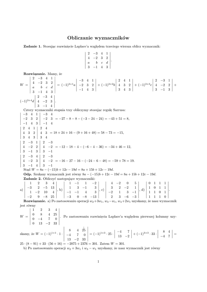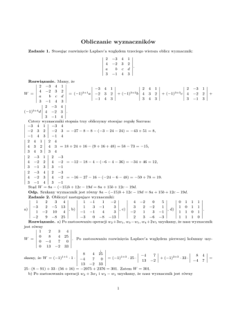 Obliczanie wyznaczników Zadanie 1. Stosujac Laplace’a wzgledem , rozwiniecie , , 2 −3 4 4 −2 3 a b c 3 −1 4 trzeciego wiersza oblicz wyznacznik: 1 2 . d 3 Rozwiazanie. Mamy, że , 2 −3 4 1 −3 4 1 2 4 1 2 −3 1 4 −2 3 2 = (−1)3+1 a −2 3 2 + (−1)3+2 b 4 3 2 + (−1)3+3 c 4 −2 2 + W = b c d a −1 4 3 3 4 3 3 −1 3 3 −1 4 3 2 −3 4 (−1)3+4 d 4 −2 3 . 3 −1 4 stopnia trzy obliczymy stosujac , regule, Sarrusa: Cztery wyznaczniki −3 4 1 −3 4 −2 3 2 −2 3 = −27 − 8 − 8 − (−3 − 24 − 24) = −43 + 51 = 8, −1 4 3 −1 4 2 4 1 2 4 4 3 2 4 3 = 18 + 24 + 16 − (9 + 16 + 48) = 58 − 73 = −15, 3 4 3 3 4 2 −3 1 2 −3 4 −2 2 4 −2 = −12 − 18 − 4 − (−6 − 4 − 36) = −34 + 46 = 12, 3 −1 3 3 −1 2 −3 4 2 −3 4 −2 3 4 −2 = −16 − 27 − 16 − (−24 − 6 − 48) = −59 + 78 = 19. 3 −1 4 3 −1 Stad , W = 8a − (−15)b + 12c − 19d = 8a + 15b + 12c − 19d. Odp. Szukany wyznacznik jest równy 8a − (−15)b + 12c − 19d = 8a + 15b + 12c − 19d. Zadanie 2. Obliczyć nastepuj ace wyznaczniki: , , 1 −1 4 −2 0 1 1 1 1 1 −2 0 5 2 3 4 3 1 0 1 1 1 −3 3 −1 3 2 −2 1 2 −5 13 , b) , c) , d) a) −2 1 1 0 1 . −1 −1 4 3 1 3 −1 4 1 −2 10 −3 −2 2 1 1 1 0 0 −8 −13 3 −6 −3 9 −8 25 Rozwiazanie. a) Po zastosowaniu operacji w2 +3w1 , w3 −w1 , w4 +2w1 uzyskamy, że nasz wyznacznik , jest równy 1 2 3 4 0 8 4 25 . Po zastosowaniu rozwiniecia Laplace’a wzgledem pierwszej kolumny uzyW = , , 7 0 0 −4 0 13 −2 33 ↓ 8 4 25 8 4 −4 7 3+3 1+3 1+1 = + (−1) · 33 · · 25 · skamy, że W = (−1) · 1 · −4 7 0 = (−1) −4 7 13 −2 13 −2 33 25 · (8 − 91) + 33 · (56 + 16) = −2075 + 2376 = 301. Zatem W = 301. b) Po zastosowaniu operacji w2 + 3w1 i w3 − w1 uzyskamy, że nasz wyznacznik jest równy 1 ↓ 1 −1 1 −2 4 4 2 −3 2 −3 4 2 0 2 −3 = (−1)1+2 · (−1) · −2 = −2 −2 W = 4 3 5 3 5 3 = −2 −3 −8 −13 −3 −8 −13 −3 −8 0 3 5 −3 0 −8 −13 −156 − 30 − 48 − (27 − 160 + 52) = −234 + 81 = −153, czyli W = −153. c) Po zastosowaniu operacji w1 + 2w3 uzyskamy, że nasz wyznacznik jest równy: ↓ 0 0 6 3 0 0 0 3 3 2 −4 3 3 2 −4 3 2 −2 k3 −2k4 3 2 −4 1 1 = (−1)1+4 ·3· −2 1 = W = 5 −2 5 = (−3)· −2 1 −2 1 3 −1 5 −1 2 3 2 3 −2 1 0 2 0 2 3 −6 −3 2 3 0 −3 (−3) · [0 + 20 + 24 − (−8 + 45 + 0)] = (−3) · [44 − 37] = −21, czyli W = −21. d) Po dodaniu do pierwszej kolumny wszystkich pozostalych kolumn uzyskamy, że nasz wyznacznik jest równy 1 3 1 1 1 1 1 1 1 1 1 1 3 0 1 1 1 0 1 1 w2 −w1 , w3 −w1 , w4 −w1 0 −1 0 0 W = = 3· = 3·1·(−1)3 = −3, = 3· 1 1 0 1 0 −1 0 3 1 0 1 0 3 1 1 0 1 1 1 0 0 0 0 −1 czyli W = −3. Zadanie 3. Obliczyć nastepuj ace wyznaczniki: , , 3 6 5 6 1 1 1 1 0 5 2 0 5 9 7 8 1 −1 8 3 5 4 1 1 . c) 6 12 13 9 a) , b) 7 2 4 1 1 −1 1 1 4 6 6 5 1 0 4 1 0 1 1 −1 2 5 4 5 Rozwiazanie. a) Po wykonaniu operacji w − w , w − w1 i 2 1 3 , jest równy 1 1 1 1 0 −2 0 0 3 W = = 1 · (−2) = −8, czyli W = −8. 0 0 −2 0 0 0 0 −2 7 4 6 1 6 0 7 , d) 7 8 1 −1 4 −7 3 0 w4 − w1 uzyskamy, 9 4 −4 −2 6 6 9 −1 −6 . −2 4 5 −9 2 −2 że nasz wyznacznik b) Po wykonaniu operacji k2 − 4k3 uzyskamy, że nasz wyznacznik jest równy W = 0 −3 2 0 8 −17 5 4 . 7 −14 4 1 0 0 1 0 Teraz stosujemy rozwini ecie Laplace’a wzgledem czwartej kolumny: , , 0 −3 0 8 4 4+3 1+2 = (−3) · (8 − 28) = 60, czyli W = 60. W = (−1) · 1 · 8 −17 4 = (−1) · (−1) · (−3) · 7 1 7 −14 1 c) Po że nasz wyznacznik jest równy wykonaniu operacji w4 − w1 uzyskamy, 3 6 2 9 4 6 5 6 4 3 6 2 9 4 5 5 9 2 13 6 9 7 8 6 9 2 13 6 k3 −2k4 k3 −k1 , k4 +k1 = = W = 6 12 13 9 7 6 12 7 15 7 = (−1)4+1 · 1 · 12 7 15 7 1 1 0 0 0 0 0 1 −1 0 5 2 7 3 2 2 5 2 7 3 5 4 5 3 2 2 1 = 3 6 2 9 2 (−1) · 12 7 5 2 1 3+2 (−1) · 5 · 4 ↓ 1 4 ↓ 1 0 1 0 1 0 1 1 6 w1 −w4 , w2 −w4 , w3 −w4 4 0 0 3 4+3 = (−1) · ·1· 4 0 3 = = (−1) · (−1) 7 5 0 4 1 7 7 5 4 5 2 1 3 1 3 1 = (−5) · (3 − 4) = 5, czyli W = 5. 3 d) Po wykonaniu operacji w1 + 6w4 i w3 + 8w4 uzyskamy, że nasz wyznacznik jest równy ↓ ↓ ↓ 13 0 −3 28 26 13 −3 28 26 13 −3 28 26 1 0 −2 6 6 1 −2 6 6 w3 −w1 6 6 = (−1)· 1 −2 W = 15 = (−1)4+2 ·(−1)· 0 −7 31 34 2 −4 15 −7 31 34 3 8 1 −1 −2 −7 −9 4 5 −7 −9 2 −2 2 −2 −7 0 −9 2 −2 ↓ 13 3 28 13 13 −23 28 13 6 30 12 0 1 2 6 3 1 0 6 3 k −2k w +w 2 1 1 4 0 6 3 = 2· = 2· 1 (−1) · (−1) · 2 · 2 3 4 0 3 4 0 3 4 2 4 2 −7 9 2 −1 −7 23 2 −1 −7 23 2 −1 ↓ 6 30 12 1 5 2 1 5 2 w −w , w −2w 2 1 3 1 = 2 · (−1)4+2 · 23 · 1 6 3 = 46 · 6 · 1 6 3 = 276 · 0 1 1 = 2 3 4 2 3 4 0 −7 0 1 1 276 · (−1)1+1 · 1 · = 276 · 7 = 1932, czyli W = 1932. −7 0 3 =