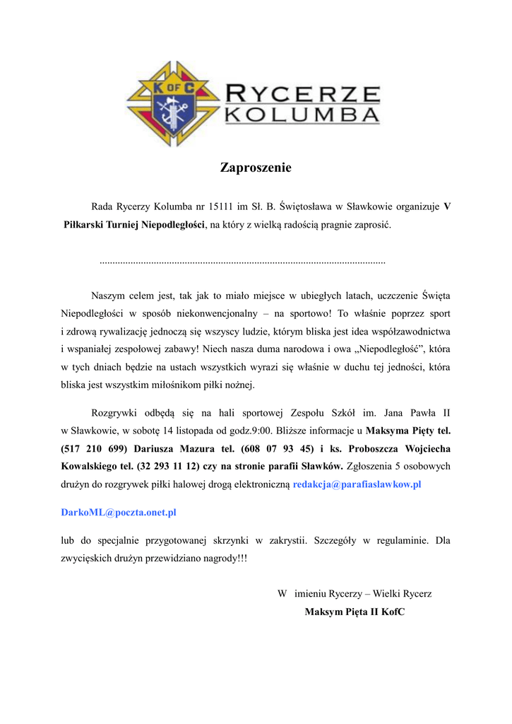 Zaproszenie Rada Rycerzy Kolumba nr 15111 im Sł. B. Świętosława w Sławkowie organizuje V Piłkarski Turniej Niepodległości, na który z wielką radością pragnie zaprosić. ............................................................................................................... Naszym celem jest, tak jak to miało miejsce w ubiegłych latach, uczczenie Święta Niepodległości w sposób niekonwencjonalny – na sportowo! To właśnie poprzez sport i zdrową rywalizację jednoczą się wszyscy ludzie, którym bliska jest idea współzawodnictwa i wspaniałej zespołowej zabawy! Niech nasza duma narodowa i owa „Niepodległość”, która w tych dniach będzie na ustach wszystkich wyrazi się właśnie w duchu tej jedności, która bliska jest wszystkim miłośnikom piłki nożnej. Rozgrywki odbędą się na hali sportowej Zespołu Szkół im. Jana Pawła II w Sławkowie, w sobotę 14 listopada od godz.9:00. Bliższe informacje u Maksyma Pięty tel. (517 210 699) Dariusza Mazura tel. (608 07 93 45) i ks. Proboszcza Wojciecha Kowalskiego tel. (32 293 11 12) czy na stronie parafii Sławków. Zgłoszenia 5 osobowych drużyn do rozgrywek piłki halowej drogą elektroniczną [email protected] [email protected] lub do specjalnie przygotowanej skrzynki w zakrystii. Szczegóły w regulaminie. Dla zwycięskich drużyn przewidziano nagrody!!! W imieniu Rycerzy – Wielki Rycerz Maksym Pięta II KofC Lista uczestników V Piłkarskiego Turnieju Niepodległości w Sławkowie Turniej Piłki Halowej 14. Listopada 2015r. Nazwa drużyny - …...................................................................... Lp Imię Nazwisko Status gracza * 1 2 3 4 5 Rezerwa 1 2 *Status gracza tj. kapitan drużyny, bramkarz, zawodnik Kontakt Regulamin V piłkarskiego Turnieju Niepodległości w Sławkowie organizowanego przez Rycerzy Kolumba z okazji Święta Niepodległości w dniu 14 listopada 2015 roku w Hali Sportowej Zespołu Szkół im. Jana Pawła II w Sławkowie. 1. Kategorie wiekowe: Turniej rozegrany będzie w dwóch kategoriach wiekowych: - młodzieżowej - dorosłych Kategoria młodzieżowa – uczestnicy Turnieju do gimnazjum włącznie oraz drużyny dziewcząt i skrzatów( tych najmłodszych) Kategoria dorosłych – pozostali uczestnicy rozgrywający mecze. Drużyny powinny się składać z osób reprezentujących dany profil zgłoszonego uczestnika. 2. Czas i miejsce rozgrywek: Miejsce – Hala Sportowa Zespołu Szkół im. JPII w Sławkowie. Termin: 14 listopad 2015 rok. Godzina rozgrywek: - 09:00 do 13:00 rozgrywki w kategorii młodzieżowej - 13:00 do 18:00 rozgrywki w kategorii dorosłych, 3. Zasady Turnieju: Rozgrywki w drużynach pięcioosobowych tj. 4 + 1 ( bramkarz ) według zasad gry w piłkę halową. System rozgrywek grupowy ( każdy z każdym w grupie) Czas gry 1 x 6 minut. ( możliwość zwiększenia lub zmniejszenia czasu w zależności od ilości drużyn ) Sędziowie – zapewnia organizator. Obsługa techniczna – zapewnia organizator. Obsługa medyczna – zapewnia organizator. Sprawy sporne – rozstrzygane będą na prośbę sędziów lub kapitanów drużyn przez Sędziego Głównego lub Głównego Organizatora Wielkiego Rycerza Maksyma Piętę . Szczegółowe zasady gry tj. wyznaczenie linii autowych, wybór stron boiska, przerwy w grze itp. Uzależnione od decyzji sędziego. W czasie turnieju drużyny zajmują pierwsze rzędy trybun, w widocznym dla kapitanów poszczególnych drużyn miejscu. Zawodnik wchodzący do gry – po zejściu zawodnika schodzącego. Drużyny powinny zadbać o jednolite stroje sportowe. Udział w turnieju jest bezpłatny. Zgłoszenie drużyn do 12 listopada do godziny 20:00 [email protected] [email protected] lub osobiście do zakrystii Kościoła w Sławkowie. Drużyny powinny mieć określoną nazwę własną. ( nazwa nie może ulec zmianie tuż przed rozgrywkami. Jeśli nazwa drużyny zgłaszającej będzie już w zgłoszeniu Turniejowym wówczas kapitan musi określić inną nazwę o czym zostanie poinformowany telefonicznie lub meilowo Losowanie drużyn w poszczególnych grupach nastąpi 14 listopada 2015 roku w dniu rozgrywek w sali nr.10 ( znajduje się przy hali sportowej) gdzie są proszeni kapitanowie poszczególnych drużyn. Godziny losowania: Grupa młodzieżowa 8:40 Grupa dorosłych 12:40 O szczegółach organizator poinformuje w dniu Turnieju przed jego rozpoczęciem. W razie zaistniałych problemów, pytań, uwag, szukać organizatorów ( będą w zielonych koszulkach) Drużyna proszona jest w miarę możliwości o dostarczenie jednominutowego nagrania muzycznego w celu odtworzenia go podczas pierwszej gry w turnieju do 13 listopada 2015r. Drogą meilową lub na PenDrive do organizatorów Niech turniej będzie dobrą rywalizacją jak i zabawą. Zatwierdził Maksym Pięta – Wielki Rycerz
